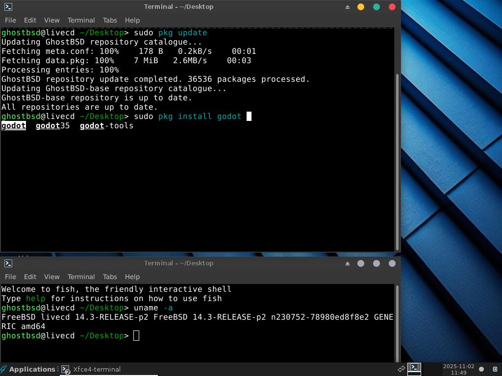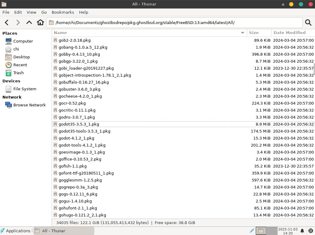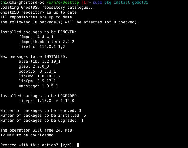 Возьмём одну из последних версий GhostBSD на основе FreeBSD 14 версии. Репозитории вполне нормально обновляются и работают. Но что, если я хочу установить Godot Engine версии 3.5 вместе с редактором? Это уже невозможно! Пакет godot35 есть, а пакета godot35-tools нет! Именно пакет godot35-tools несёт в себе среду разработки для создания приложений и игр на движке Godot. Без него разработка новых игр и программ невозможна.