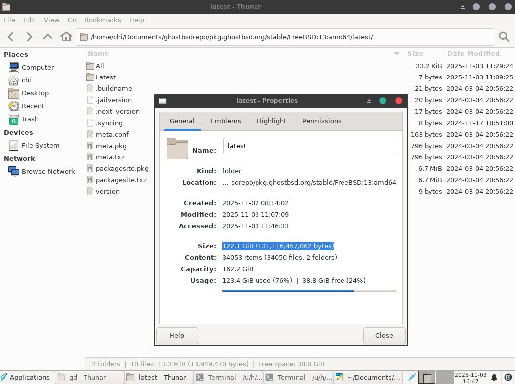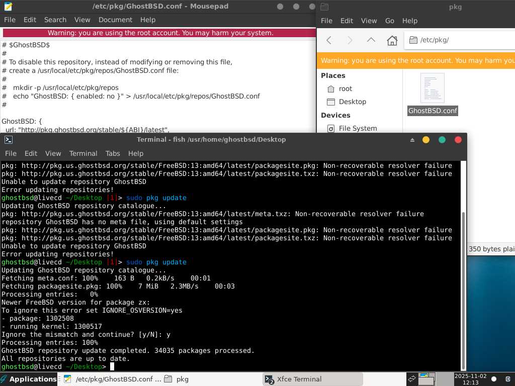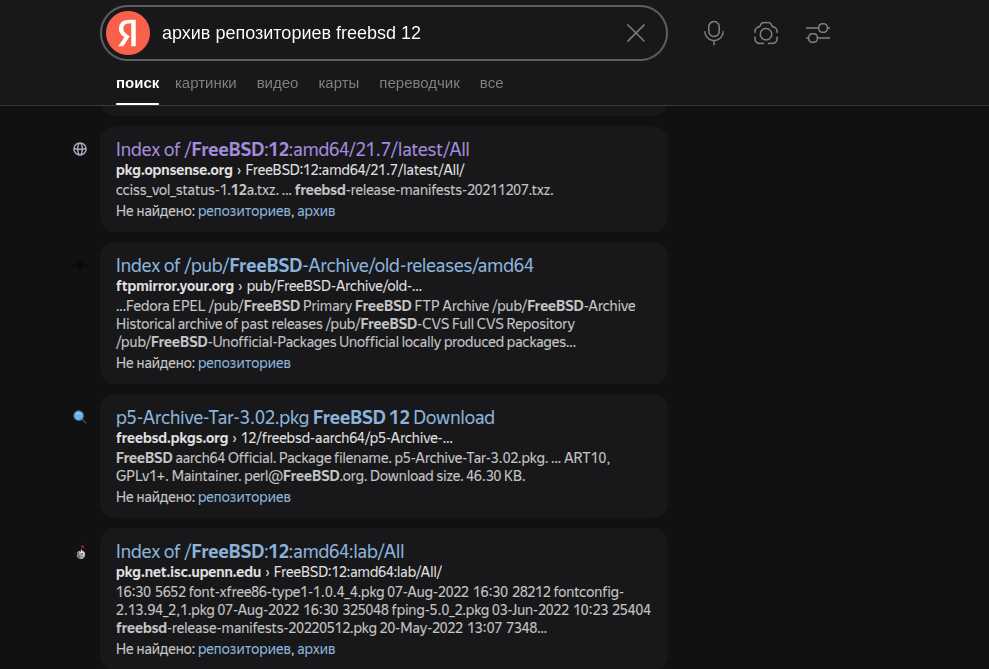 Тем временем в старых репозиториях FreeBSD 13, которые в скором времени наверняка умрут, все необходимые пакеты есть. Это говорит о том, что обслуживающий персонал новых репозиториев плохо выполняет свою работу. И это один из серьёзных минусов такого подхода к распространению ПО. Когда «ответственность» за пакеты с программным обеспечением лежит не на разработчиках, а на посторонних людях, которые занимаются обслуживанием репозиториев.