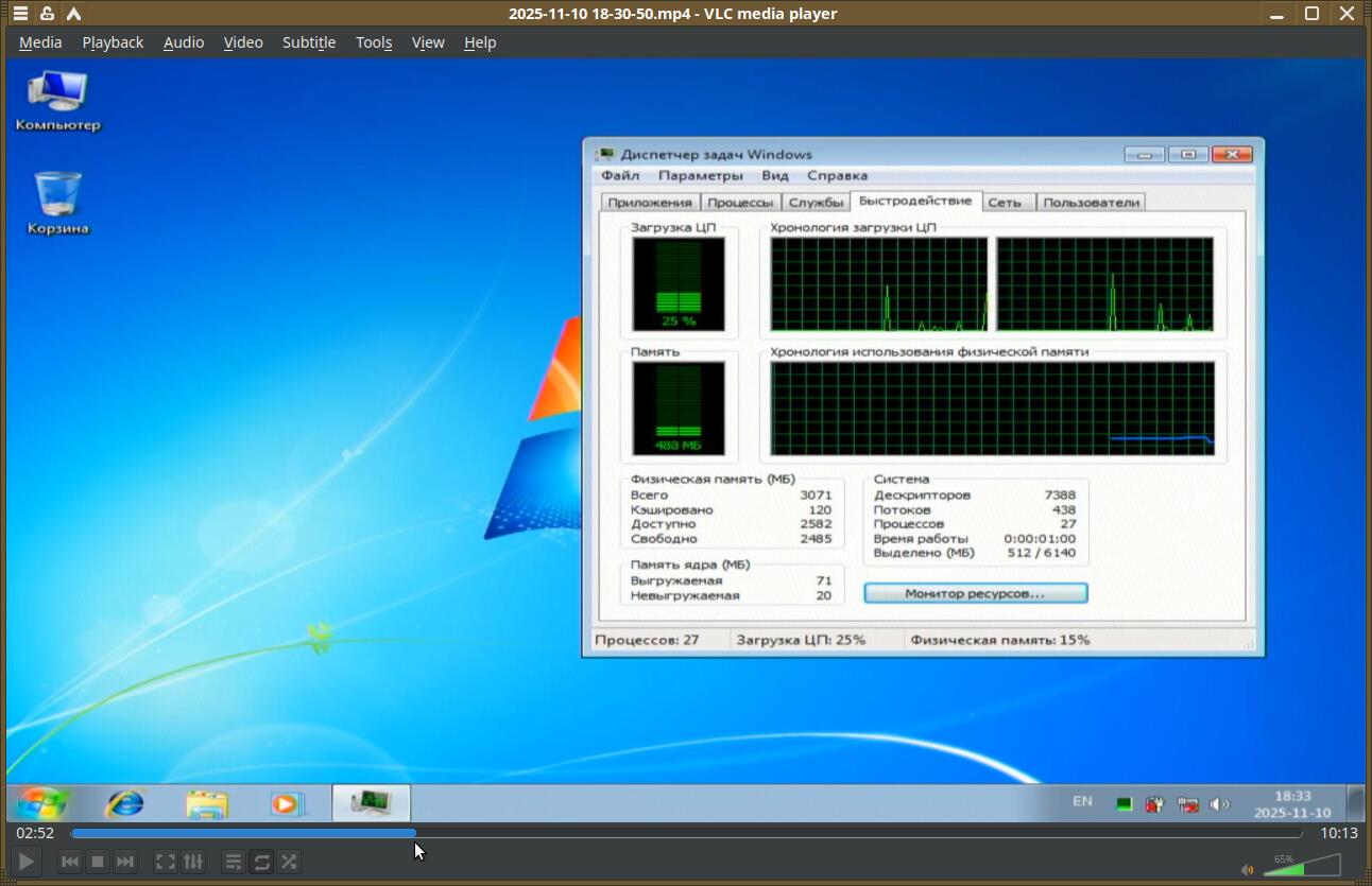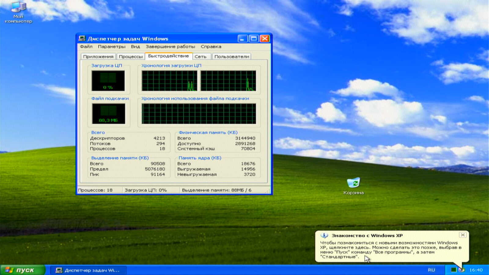 Windows XP потребляет всего 88 мегабайт оперативной памяти. Процессор практически не используется. Всего 18 процессов числится в Диспетчере задач.