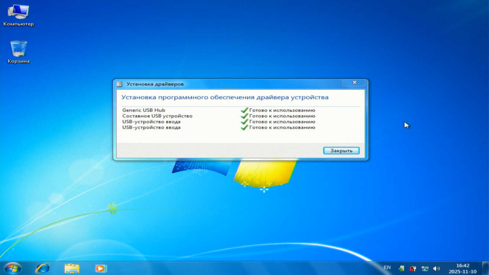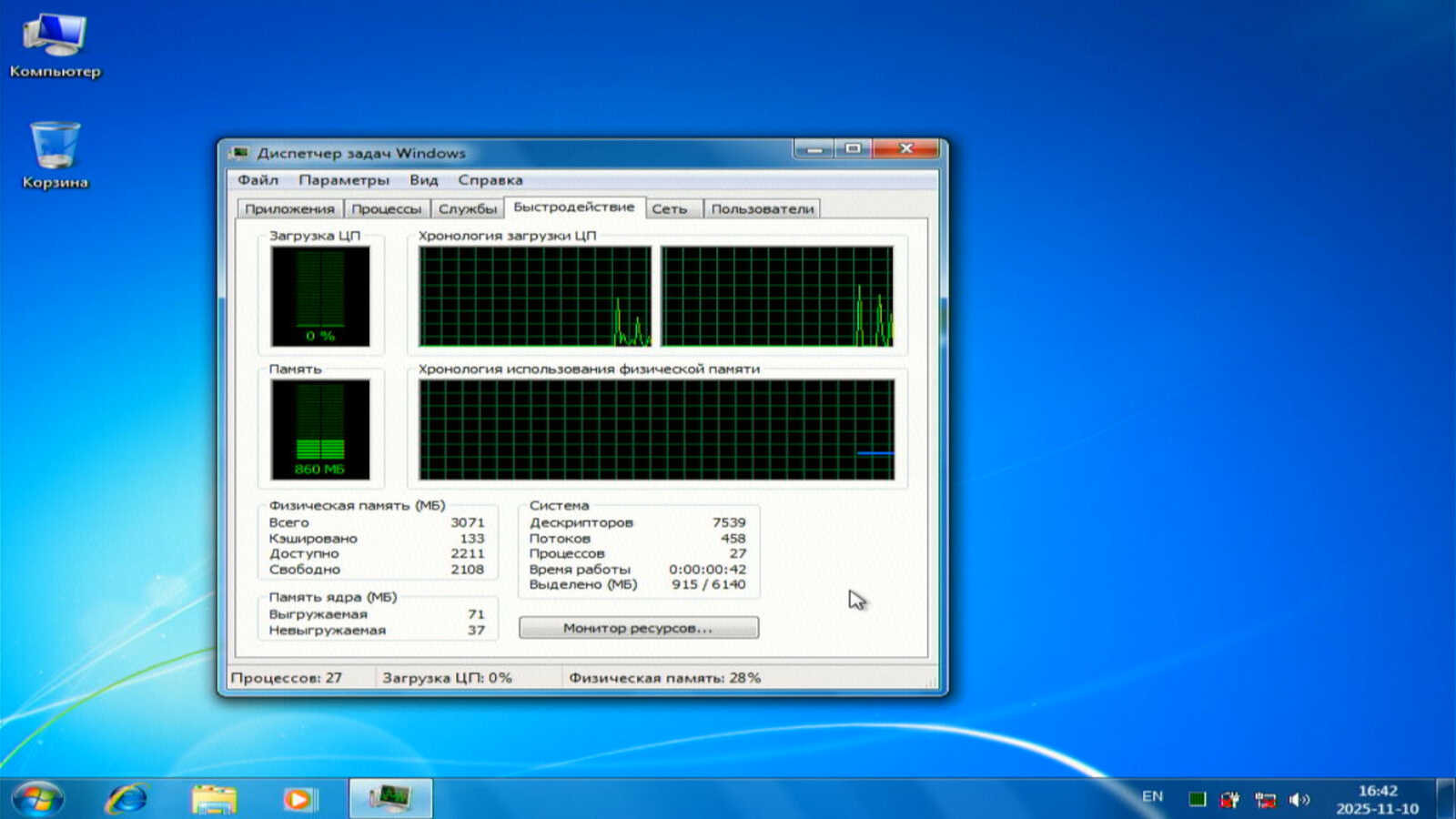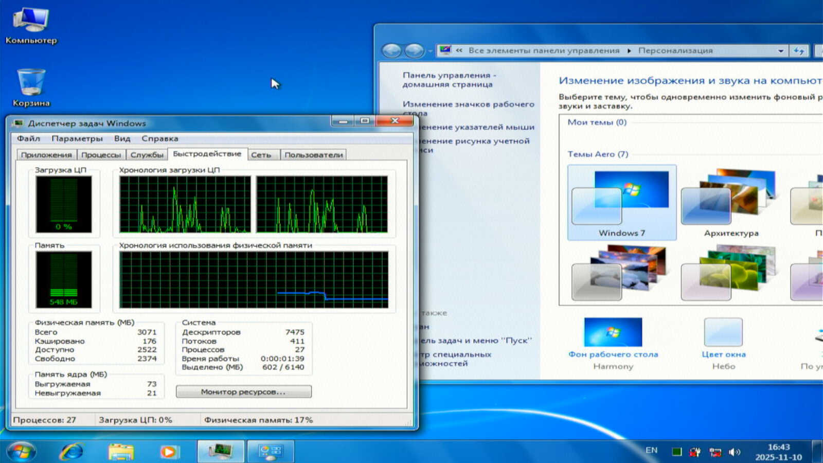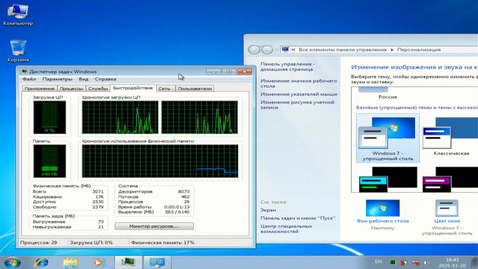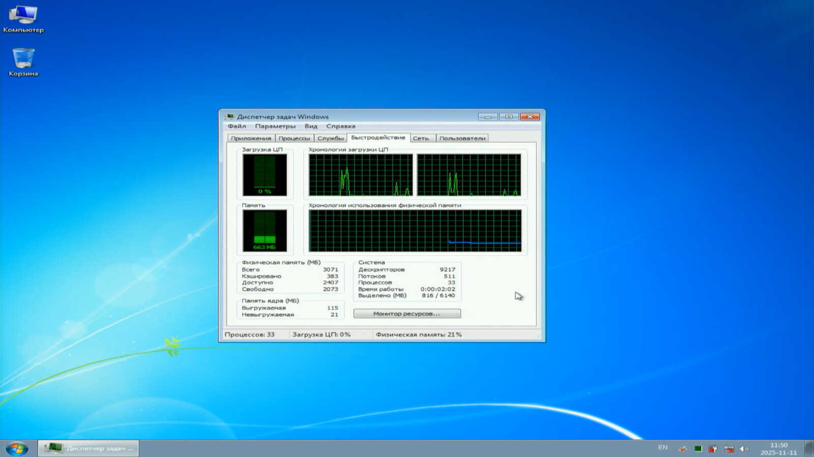 Windows 7 сразу после запуска решила установить драйверы USB разветвителя, который не был подключен во время установки ОС. В итоге потребление ОЗУ стабилизировалось на уровне 540-550 мегабайт. Это значительно больше, чем было в Windows XP.