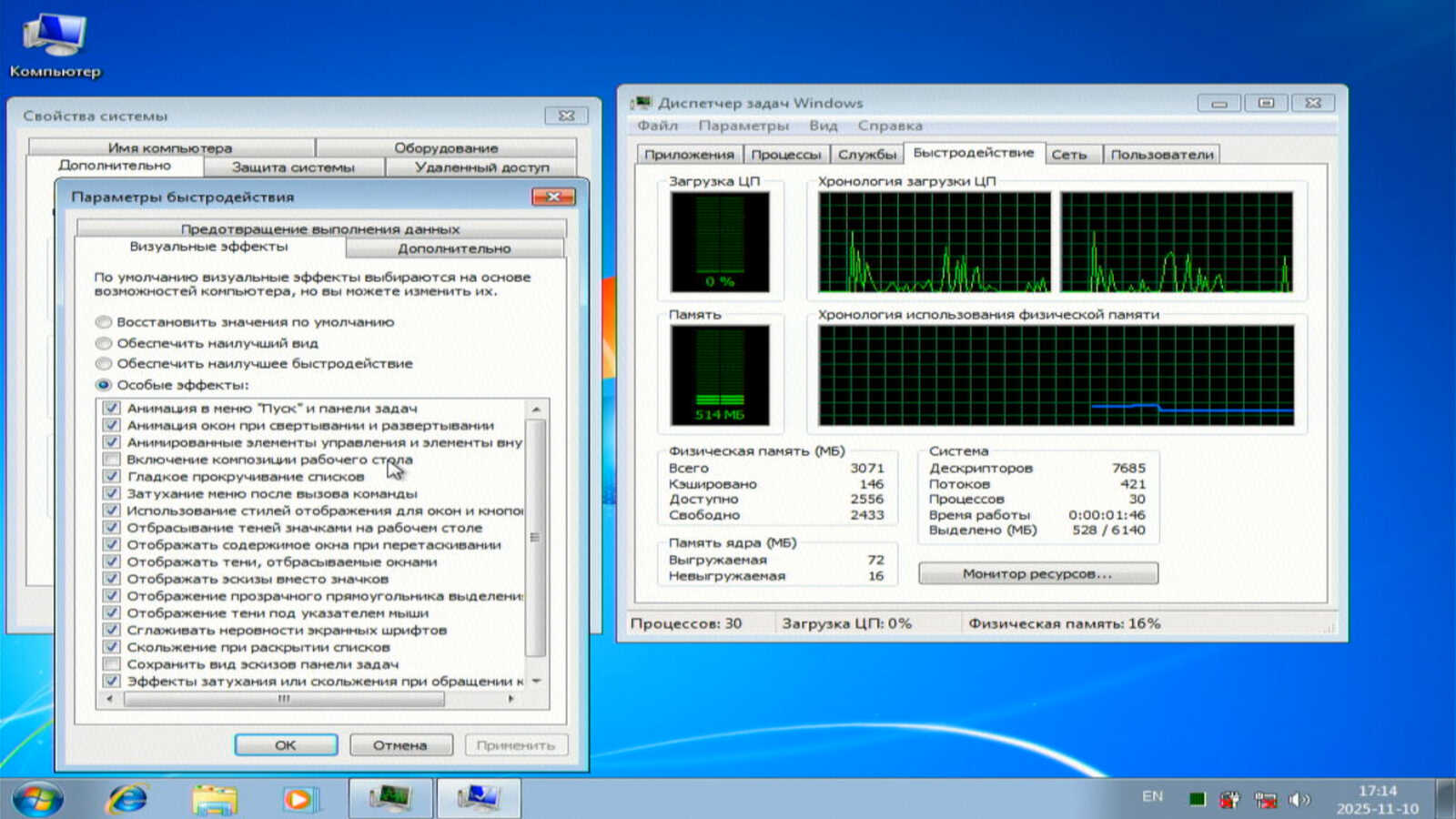 Так же можно переключить оформление до упрощённого вида и отключить Композитор рабочего стола, что снижает нагрузку на видеокарту, снижает задержки и повышает быстродействие. Для справки: начиная с Windows 8, Композитор рабочего стола принудительно включен без возможности отключения. После перезагрузки с упрощённым оформлением потребление памяти вышло около 514 мегабайт. А выделено всего 528 МБ. Это значит, что можно отключить костыль под названием Файл подкачки, и системе хватит даже одного гигабайта оперативной памяти для работы.