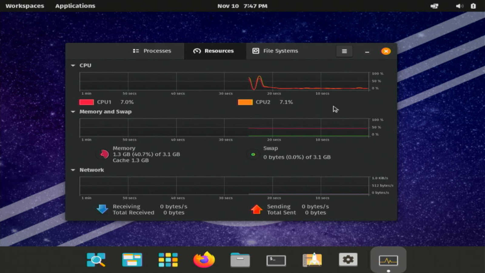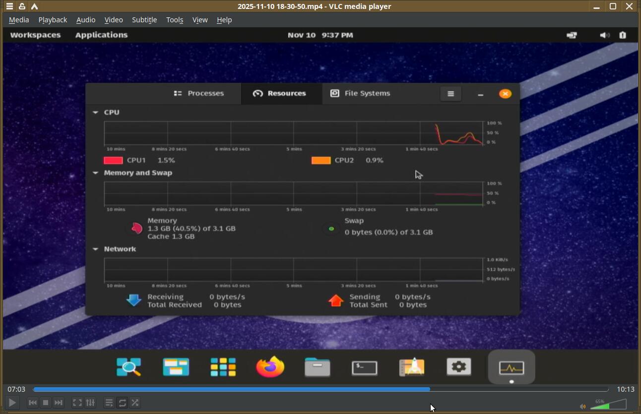 Потребление оперативной памяти составило около 1.3 гигабайта — практически половину всей ОЗУ, установленной в старом ноутбуке. Так же есть претензии к использованию процессора. Оба ядра постоянно нагружены на 7 процентов. Это в простое.