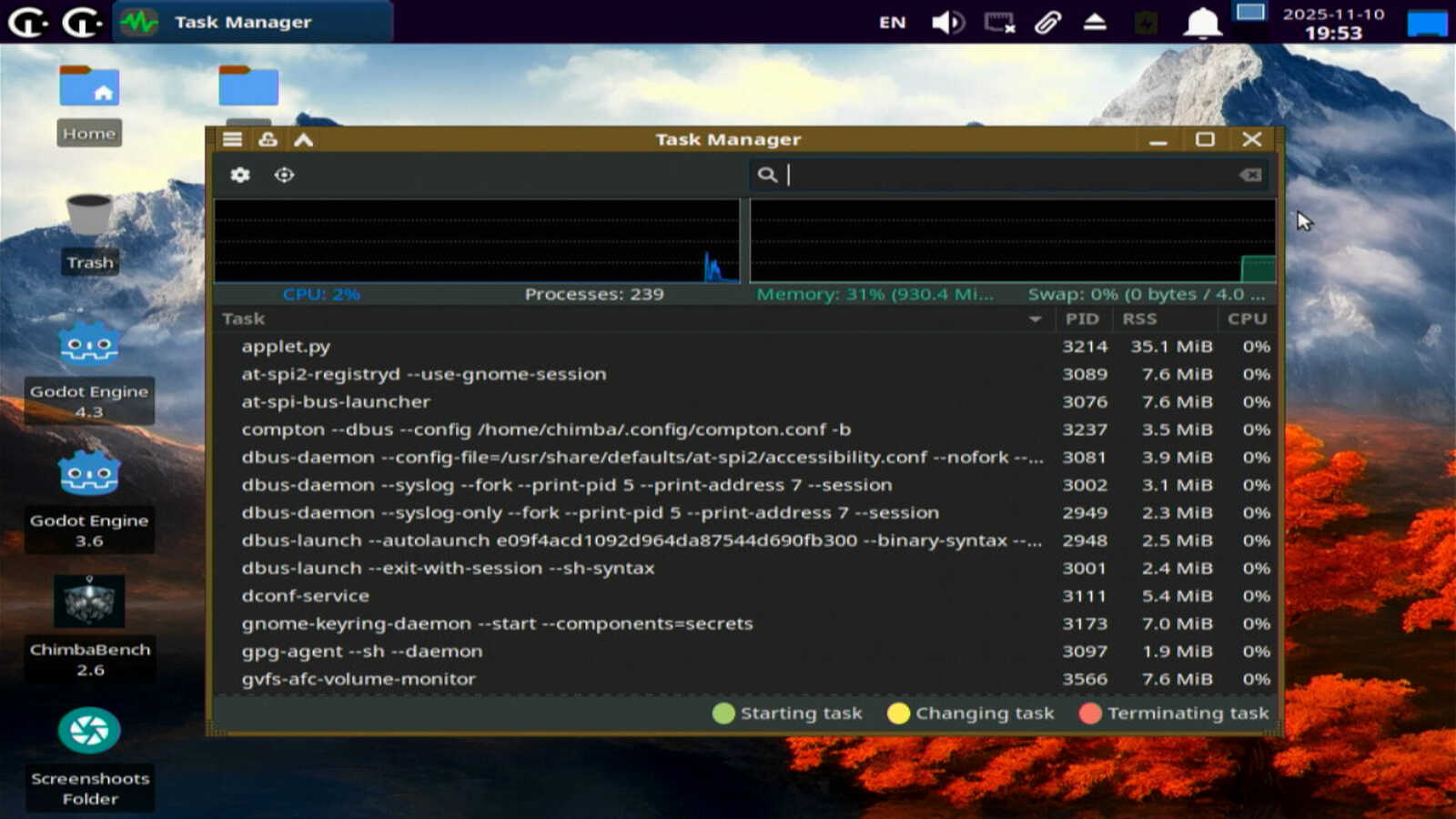 Нагрузка на процессор — всего 2 процента. Оперативной памяти используется 930 мегабайт, или 31 процент от всей памяти, установленной в ноутбук. Это довольно много, но ощутимо меньше, чем потребляла Pop!_OS. Да и запускался Chimbalix хоть и не так быстро, как Windows 7, но значительно быстрее другого Линукса, установленного на данном ноутбуке.