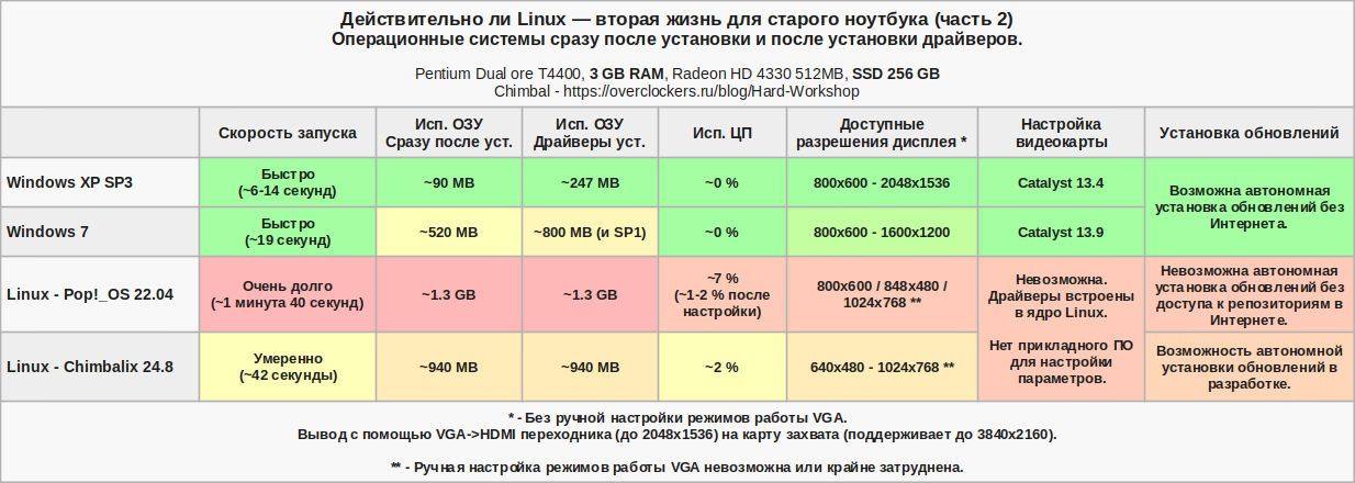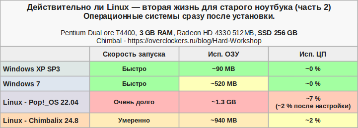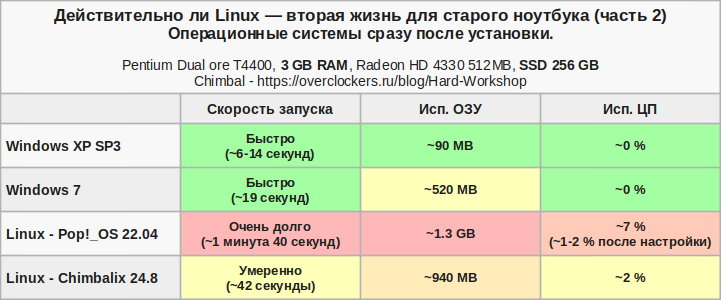 Такие результаты можно подвести в таблицу. Только Linux Pop!_OS меня откровенно напрягал долгой загрузкой. В плане экономности использования ОЗУ лидирует Windows XP. По загрузке процессора в простое лучше всех показали себя Windows XP и Windows 7.