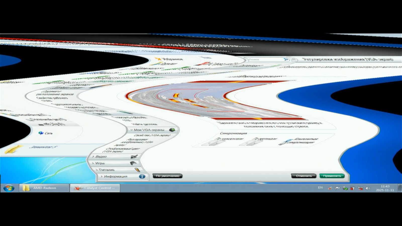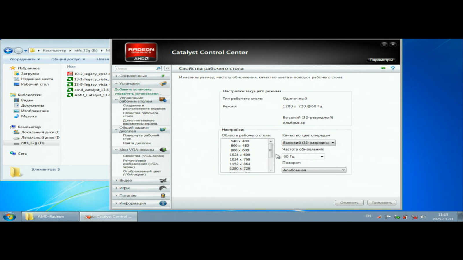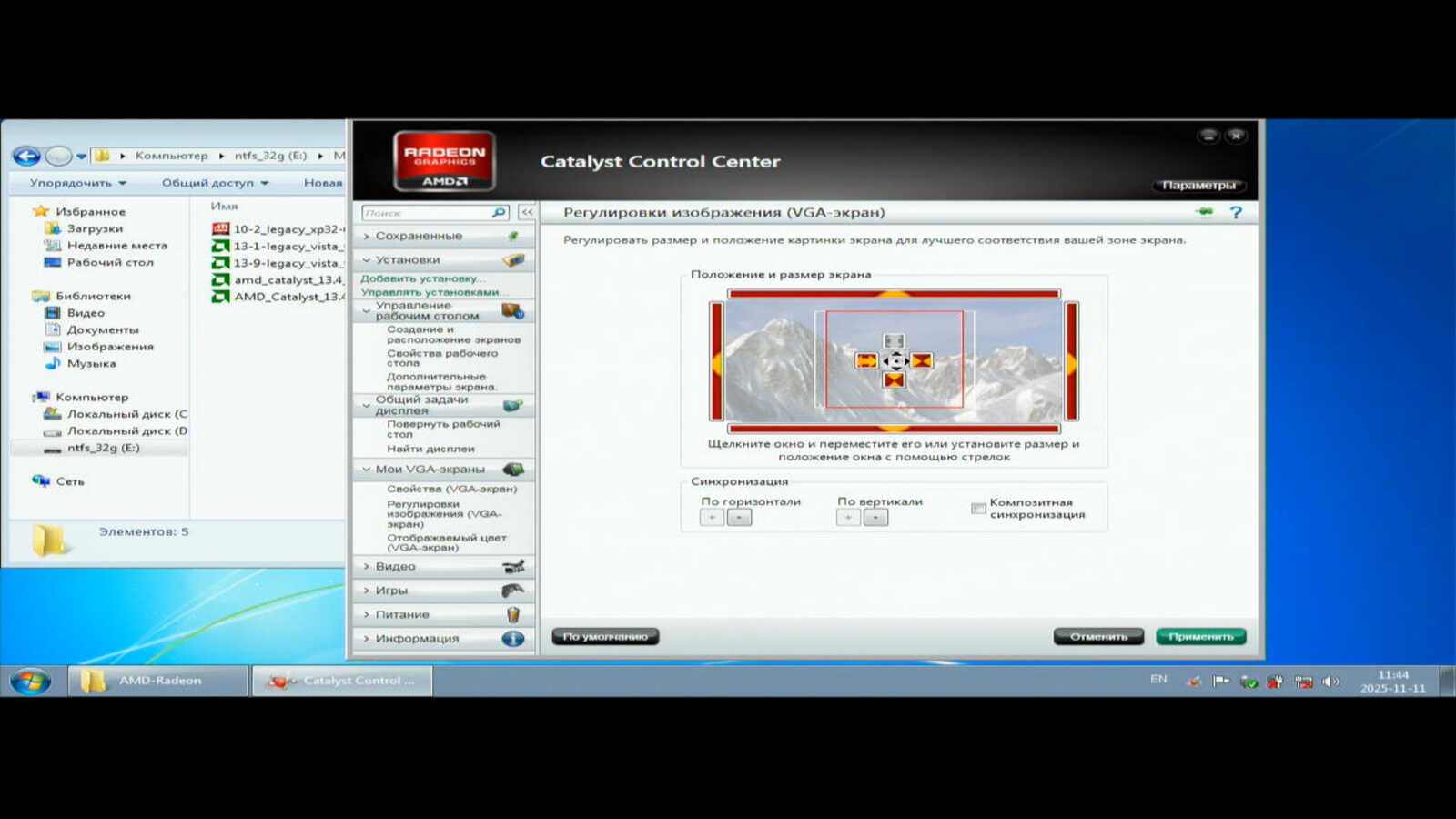Если в Windows XP я установил драйвер Catalyst 13.4 и с выводом изображения на дисплей не было никаких проблем, то в Windows 7 устанавливаю проблемный Catalyst 13.9. Он просто не способен адекватно вывести изображение на VGA выход. Почему-то всё сильно ужато по высоте и никак не исправить через настройки драйвера. А ещё рассказывают сказки, что у AMD хорошие драйверы видеокарт.