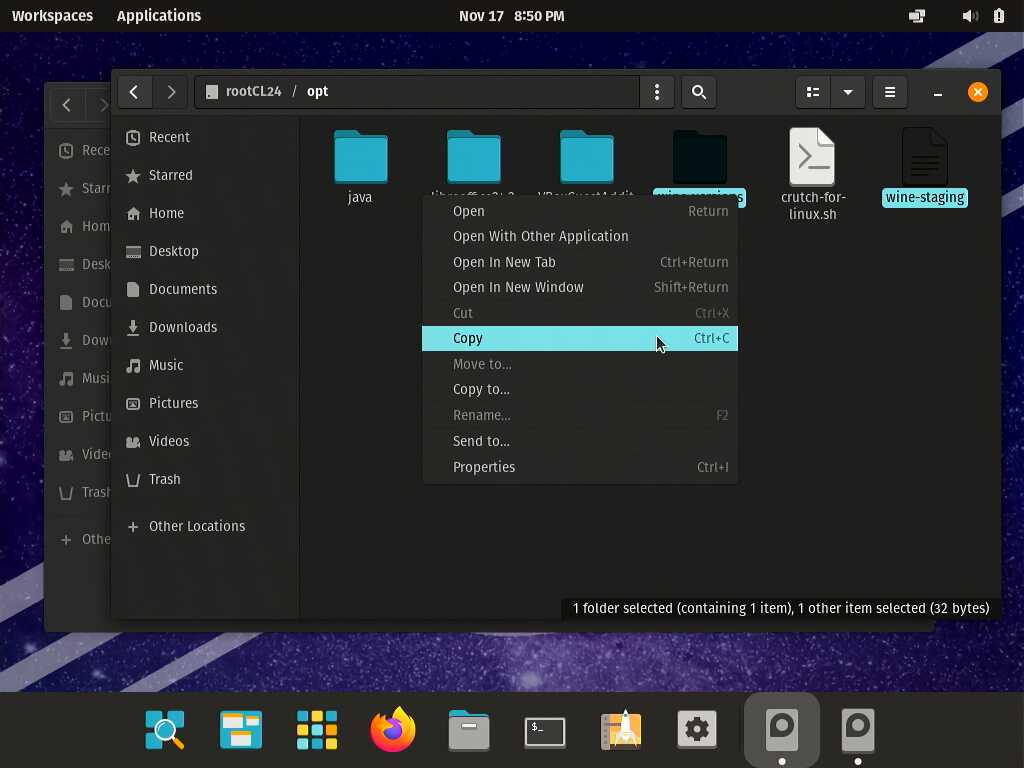 По факту можно просто вписать в таблицу результатов, что Pop!_OS не справилась ни с одним из тестов. Но разве это будет интересно? Сомневаюсь. Потому открываю диск с установленным Chimbalix и копирую WINE LG. И тут сталкиваюсь с очередной проблемой — я не могу выделить полный путь к открытому каталогу. Не зря GNOME считается одним из худших рабочих окружений для Linux.