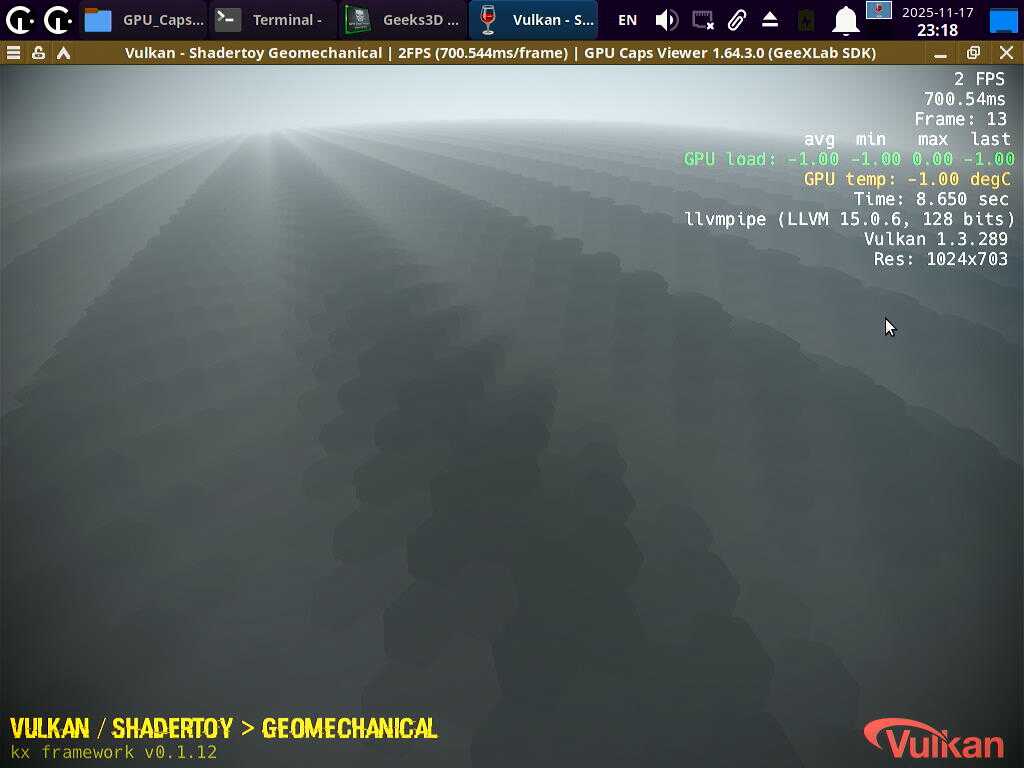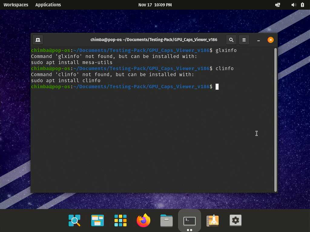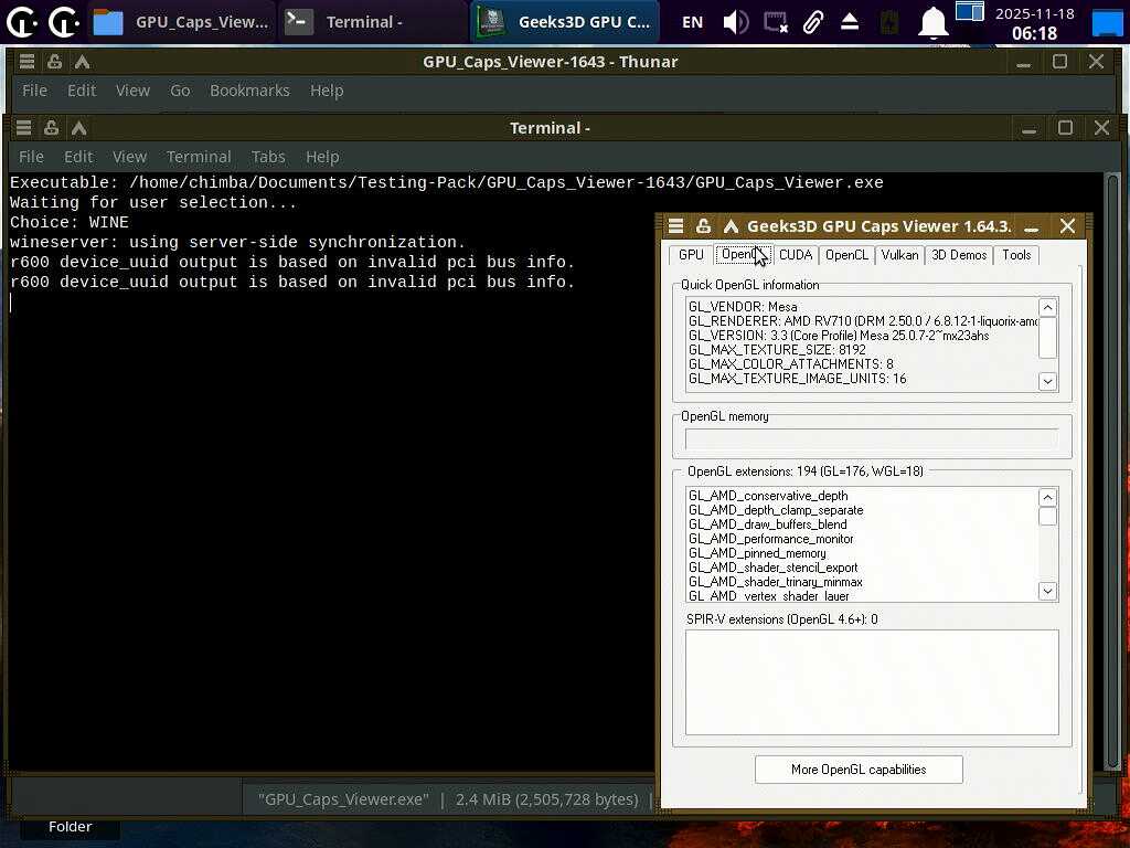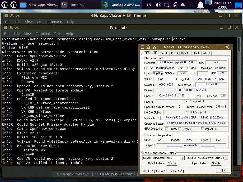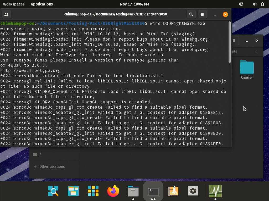 Пробую запускать программы из тестового набора. Увы, но даже переключив DXVK на старый OpenGL, мне не удалось ничего запустить. Судя по всему, это проблема драйвера видеокарты. Либо линуксоидный софт просто не умеет работать с кривым OpenGL, предоставленным современной Mesa. Кстати, а какой там OpenGL поддерживается в дистрибутиве Pop!_OS?