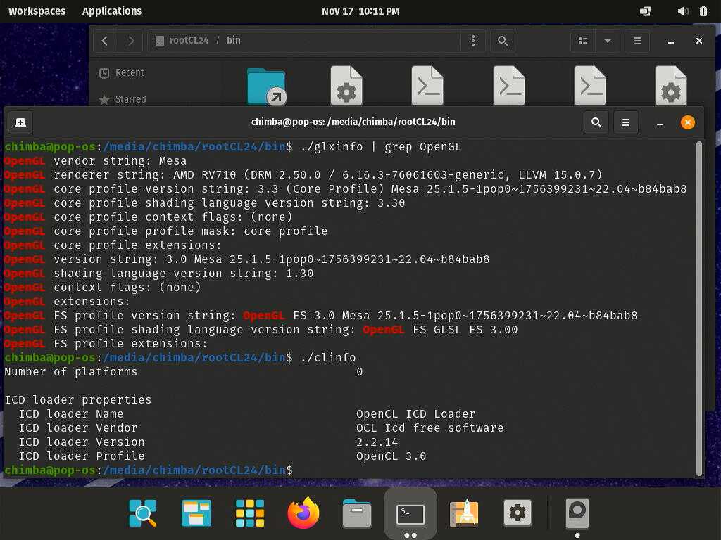 К сожалению, дистрибутив Pop!_OS не имеет утилит для вывода информации даже про OpenGL, не говоря уже про Vulkan API и OpenCL. Приходится опять открывать диск с дистрибутивом Chimbalix, потому что там есть необходимые утилиты из коробки. OpenGL 3.3, как и в Windows, только не указано количество расширений, придётся потанцевать с бубном и посчитать.