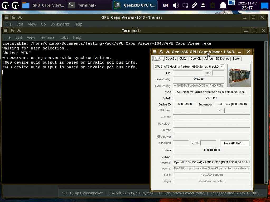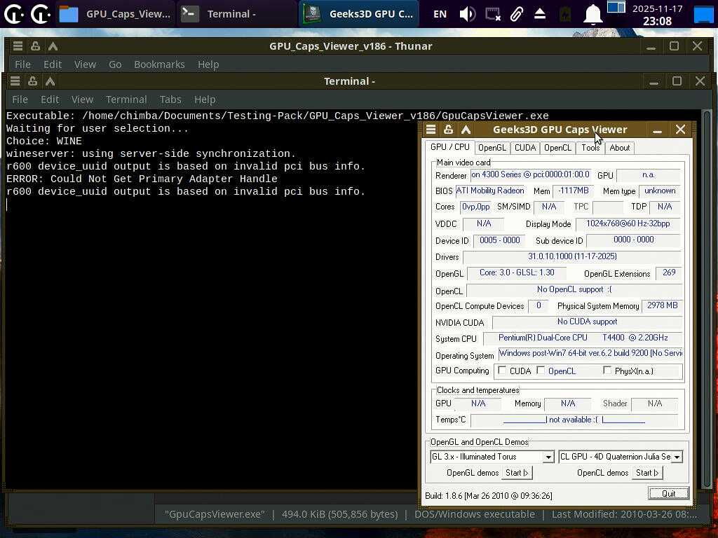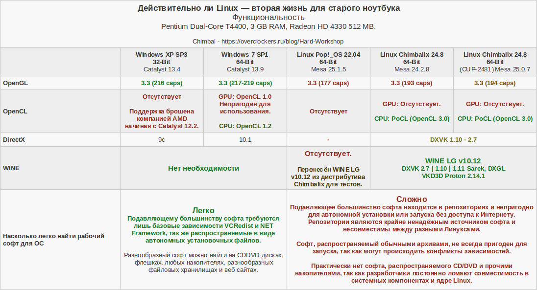 Я ожидал гораздо большего от Линуксов, чем получил по факту. Radeon HD 4330 поддерживает OpenGL 3.3 везде, но под Линуксами вместо положенных 216-219 расширений в наличии всего 177-194. OpenCL доступен только в дистрибутиве Chimbalix, и то в режиме работы с процессором. Полноценный WINE из коробки так же только в Chimbalix присутствует.