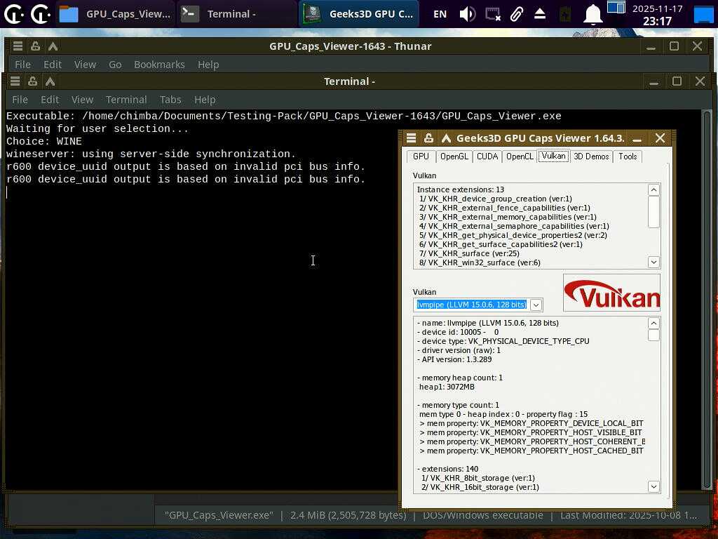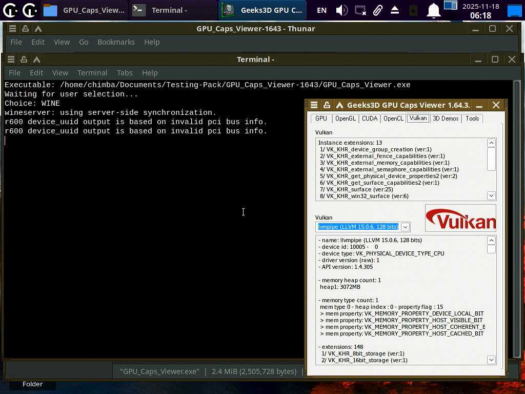 Запускаю GPU Caps Viewer. OpenGL 3.0, но расширений при этом 269 штук. Похоже, старая версия программы, запущенная через WINE, выдаёт неверную информацию. И это не вина DXVK, который используется по умолчанию и работает с драйвером llvmpipe (процессор).