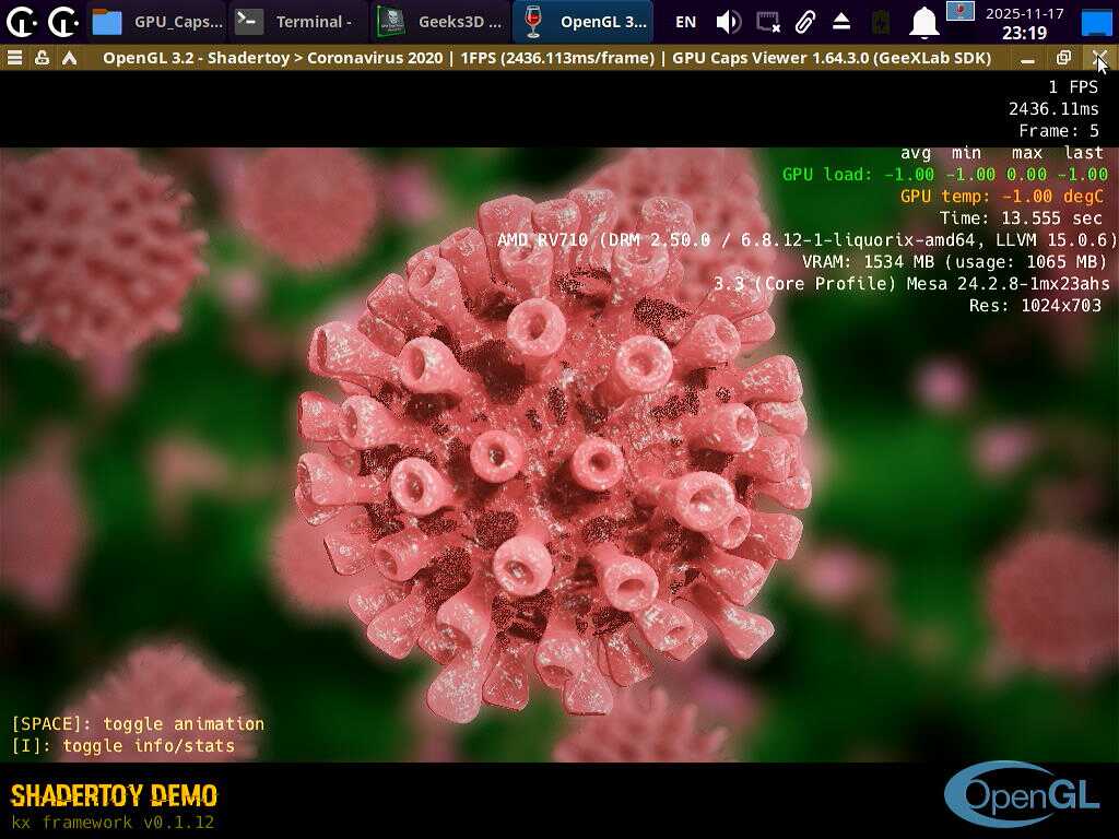 Vulkan API на процессоре работает плохо. Тут ничего удивительного, особенно учитывая, что Mesa3D — поломанный проект с 2021 года. А вот что меня действительно удивило, так это тест OpenGL 3.2 Coronavirus! На современных видеокартах AMD этот тест работает с артефактами, а с HD 4330 — нормально.