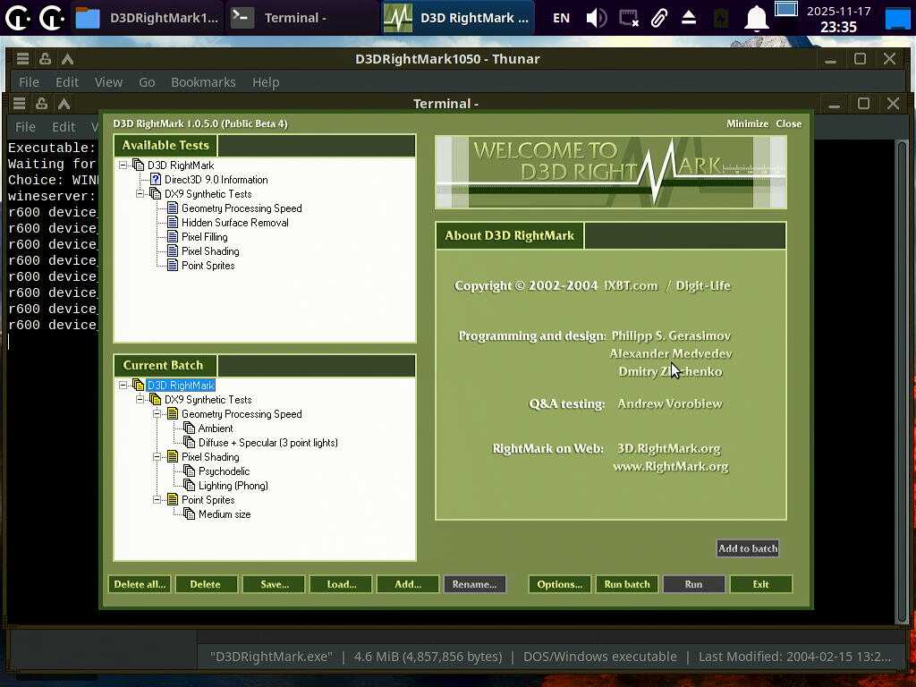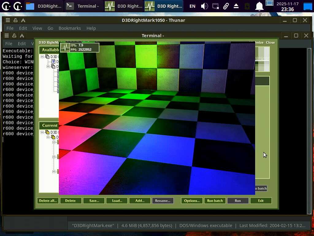 Однако радоваться рано. Street Fighter IV запустился с чёрным окном. D3D RightMark запустился нормально, но скорость работы крайне низкая по сравнению с тем, что было в Windows.