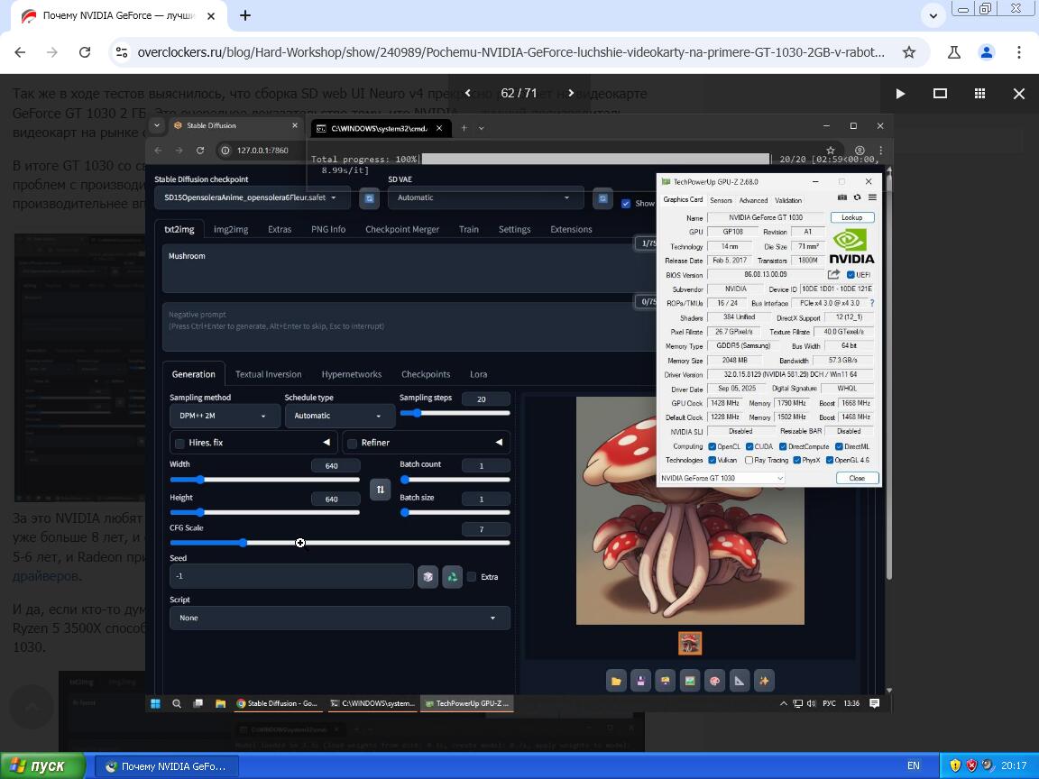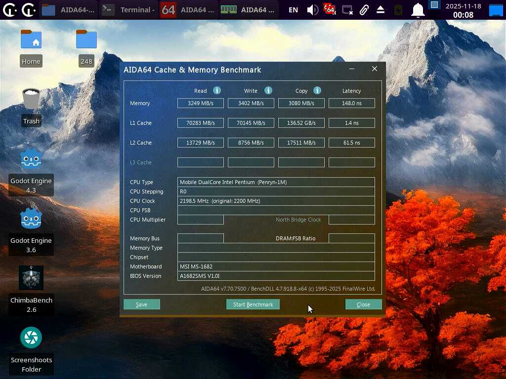 Cinebench нормально работал, но OpenGL тест не запустился, а внизу можно заметить артефакты графики. Это классика вечно кривой Mesa. Потом обновим и проверим снова – вдруг хотя бы удастся запустить тест.