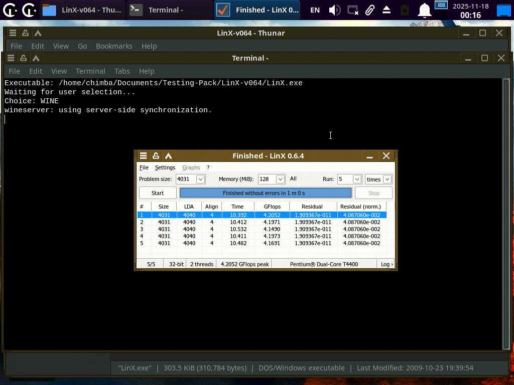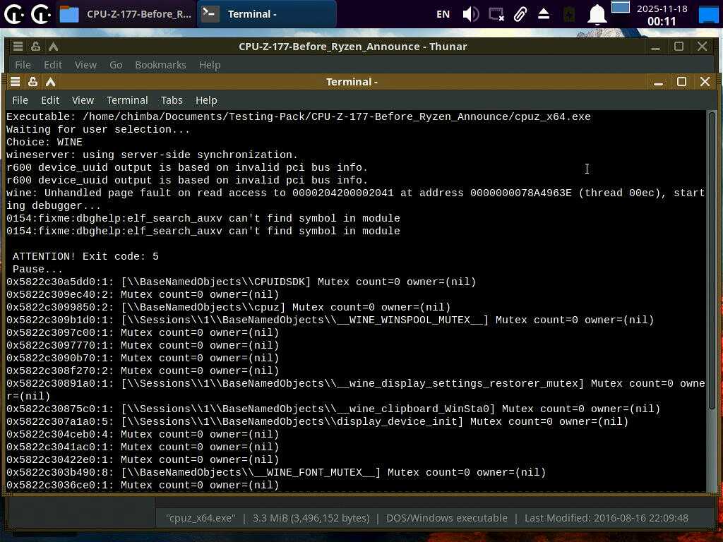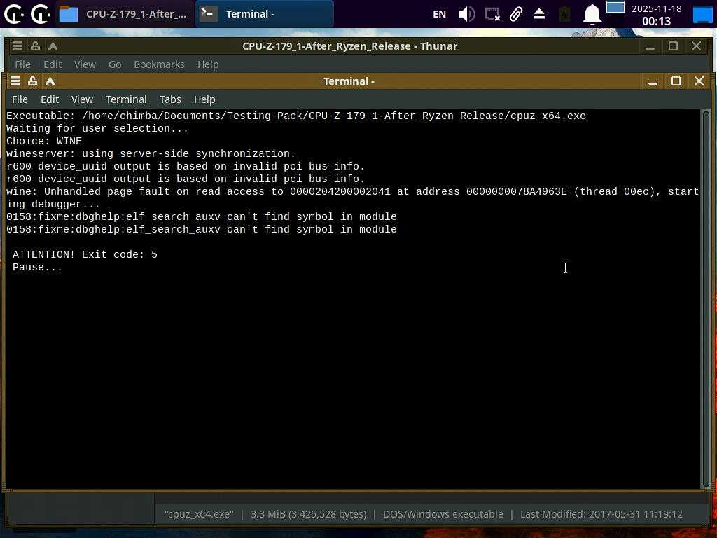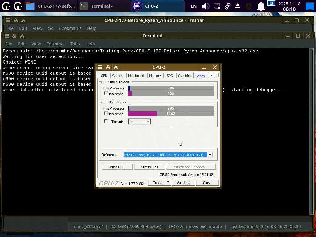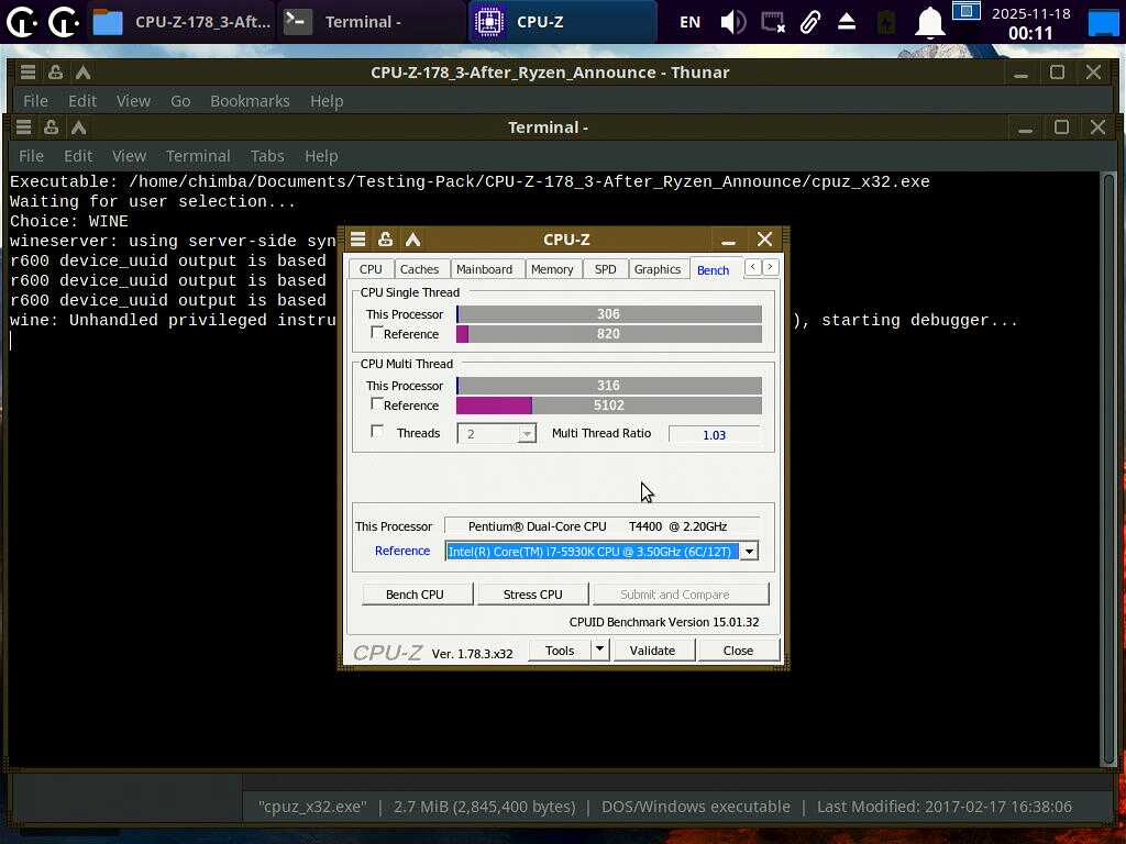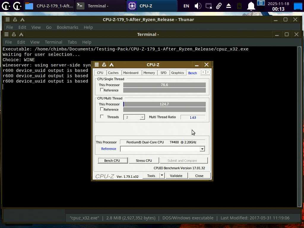 С горем пополам проходим остальные тесты под Линуксом. CPU-Z работал лишь на половину. 64 битная версия отказывается запускаться через WINE на таком старом процессоре 2009 года выпуска.