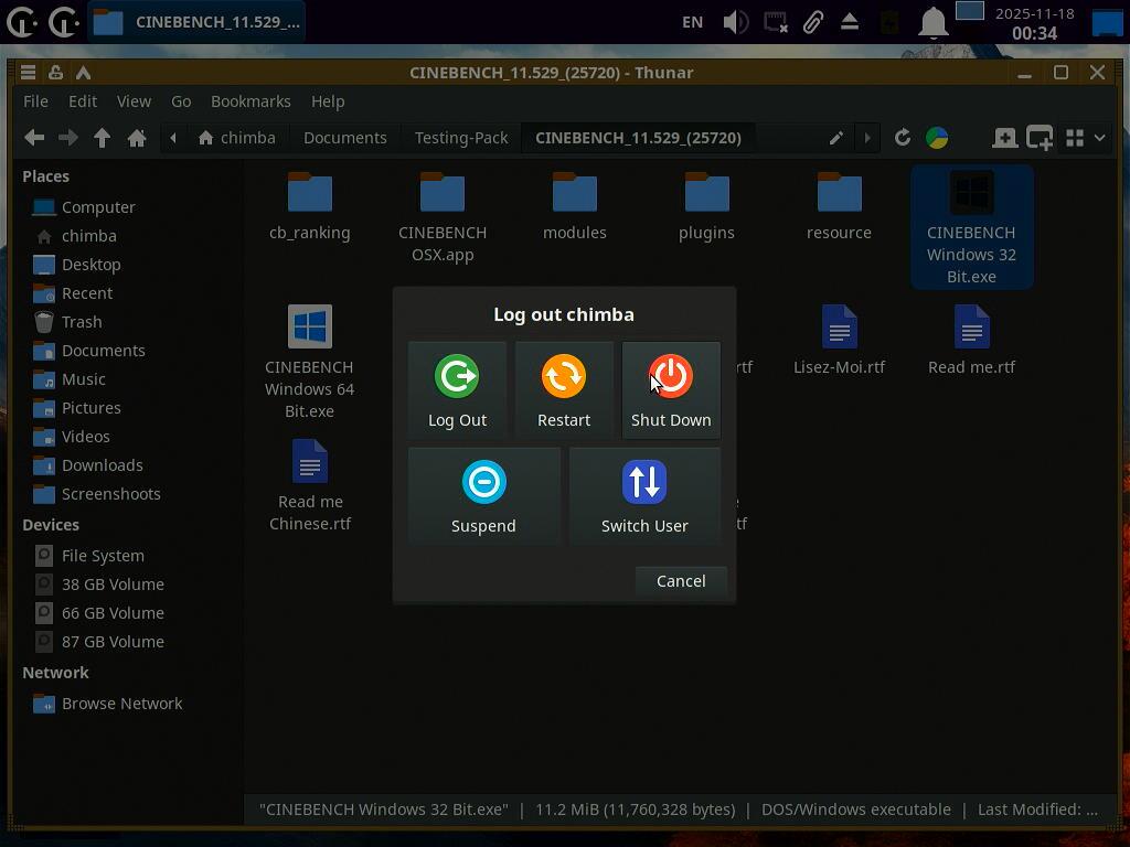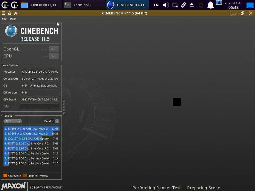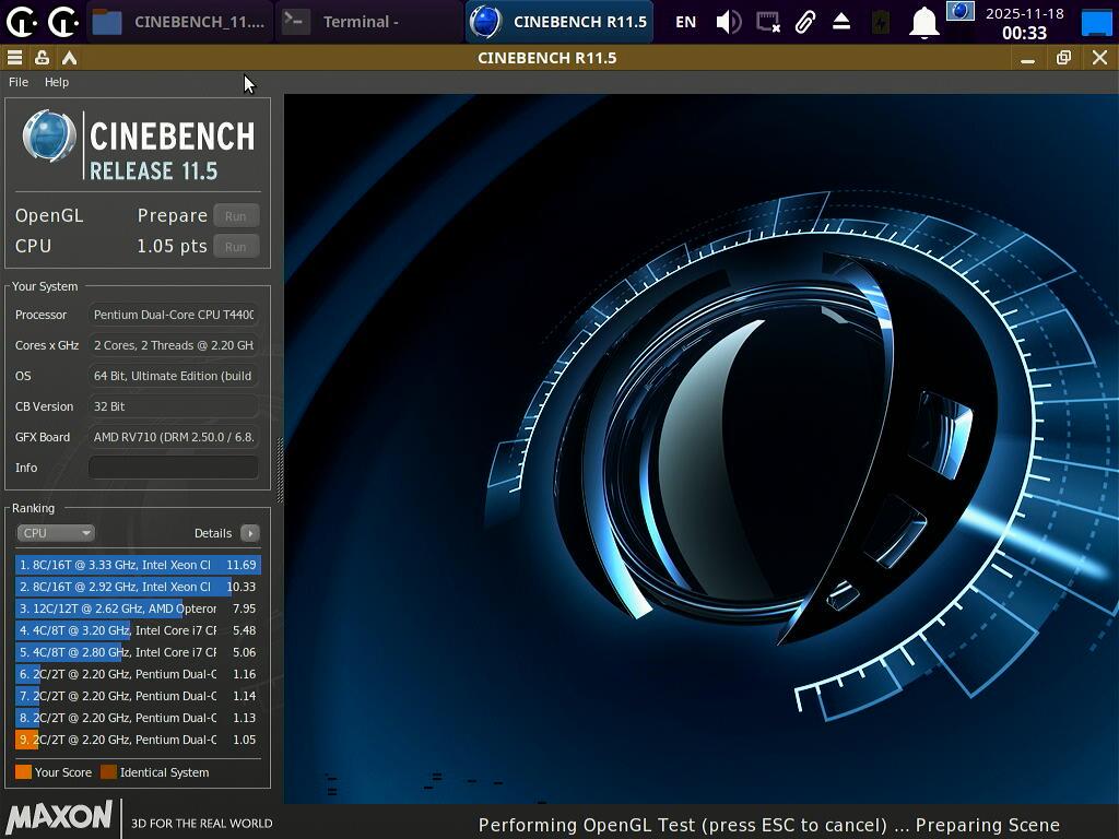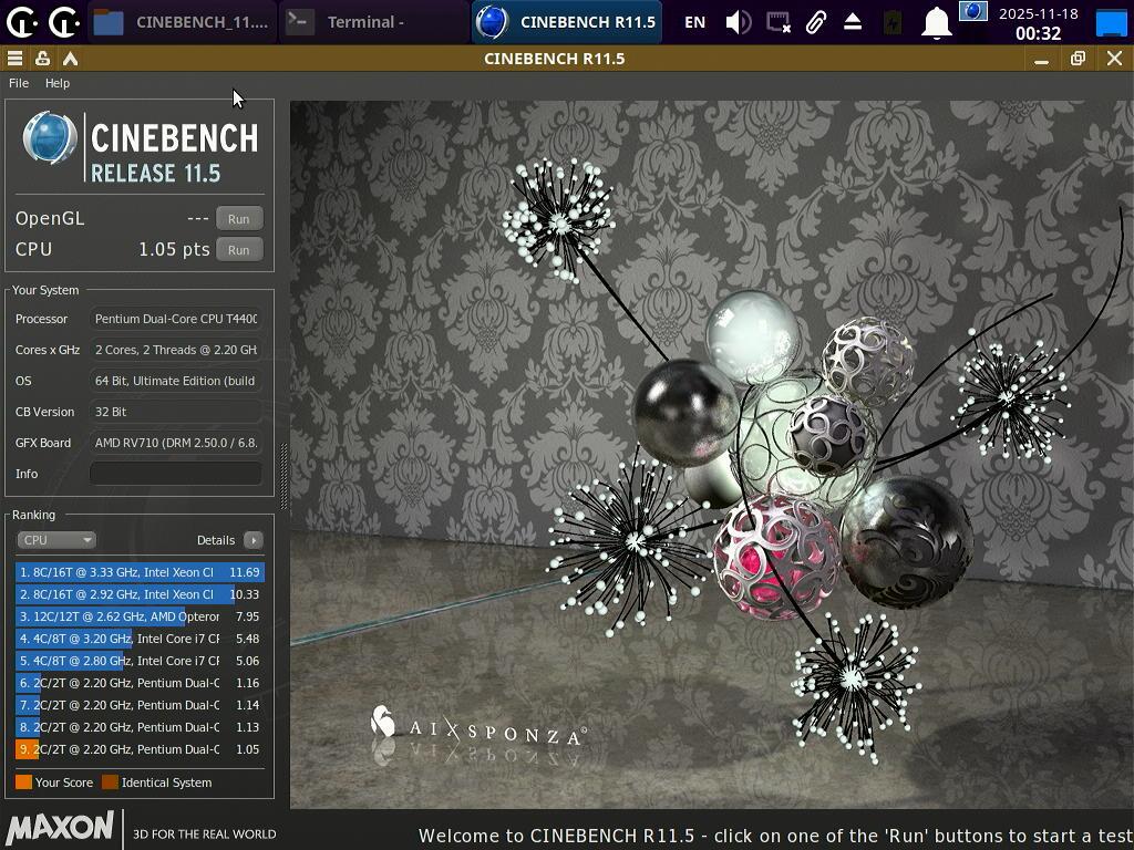К сожалению, 64 битная версия Cinebench не заработала. Судя по всему, кривая работа 64 разрядного софта — это проблема самого ядра Linux. Хотя, может и просто сам WINE отвратительно работать на старых процессорах, поддерживающих только SSE. А может, всё и сразу.