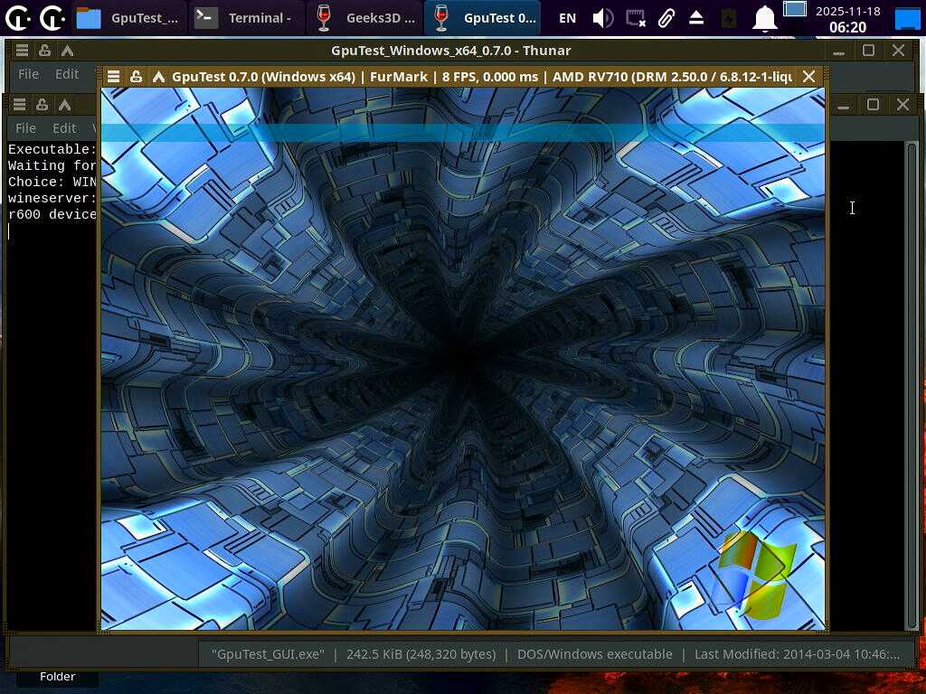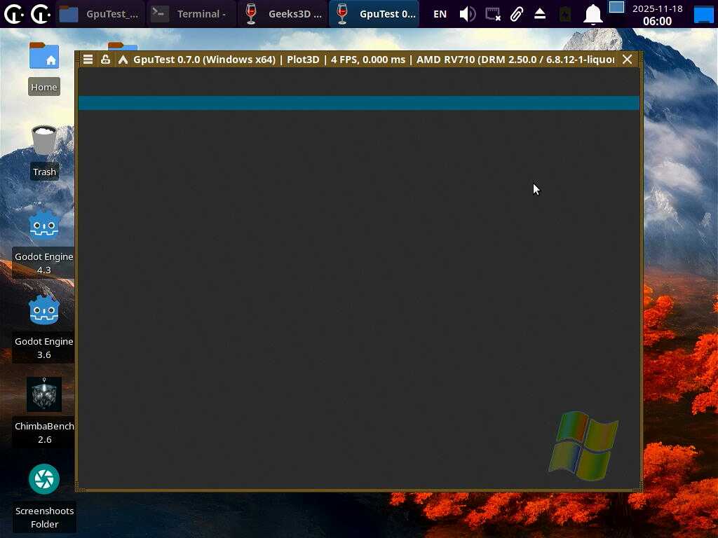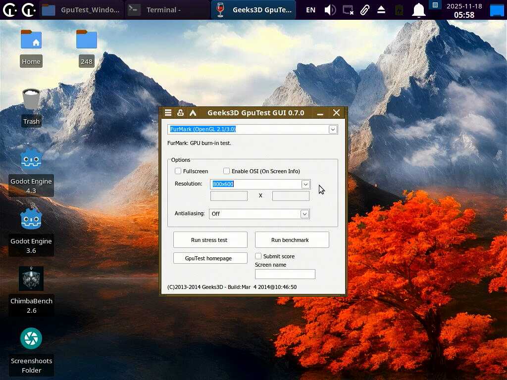 Остался GpuTest. И тут тоже большие проблемы, ведь исполняемый файл 64 битный. Многие тесты OpenGL даже не запустились. А запустившиеся работали неправильно.