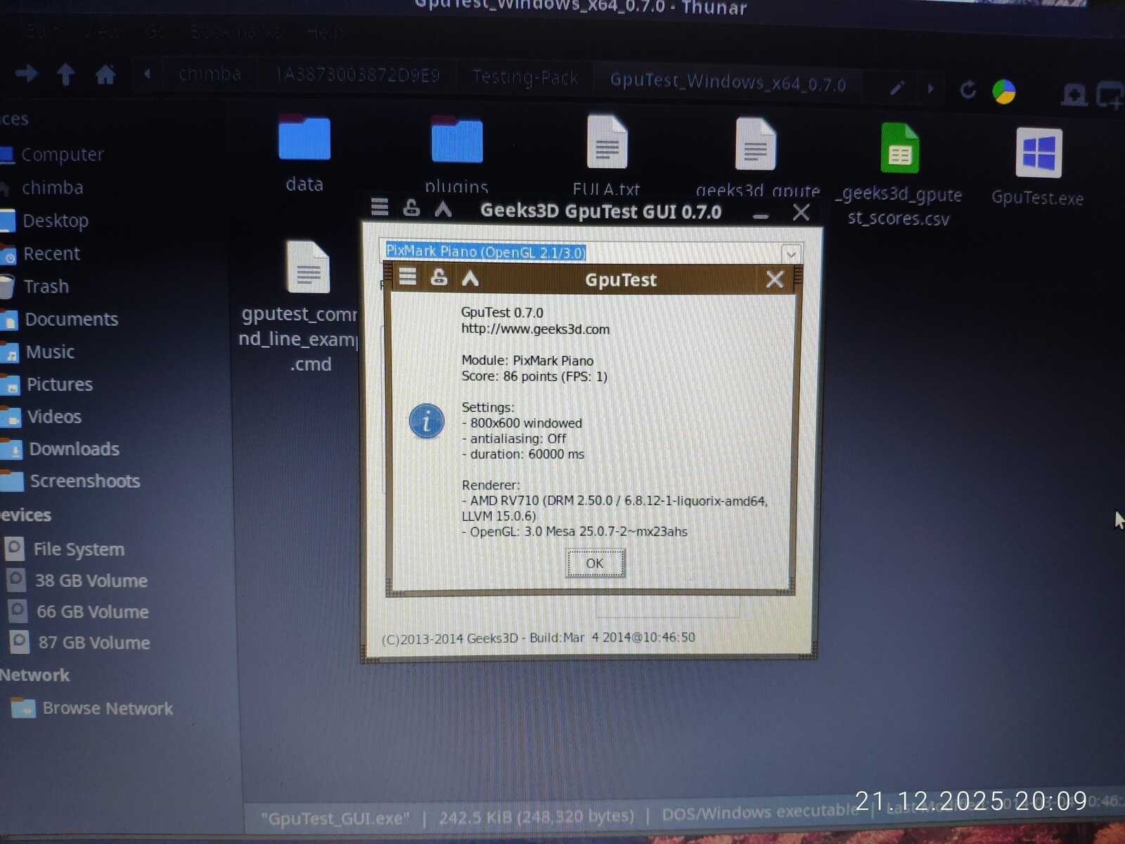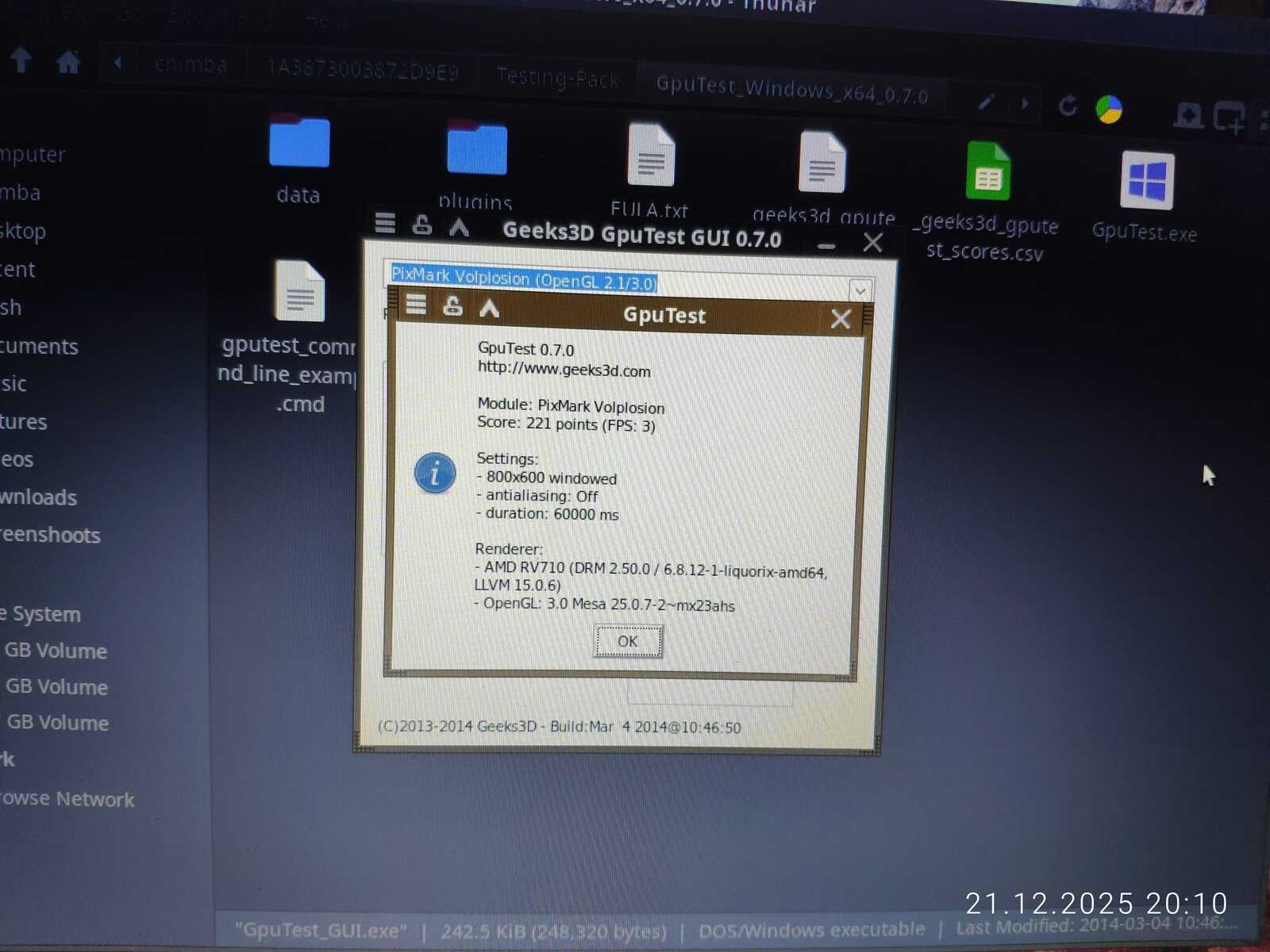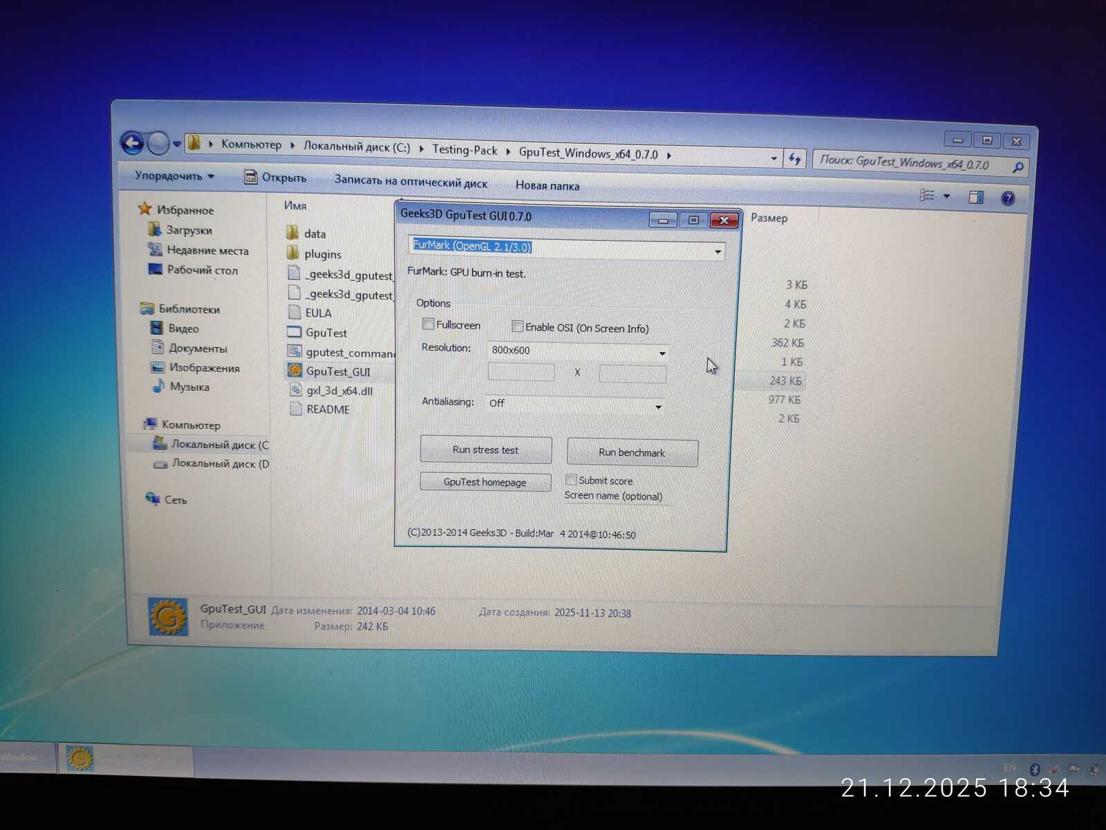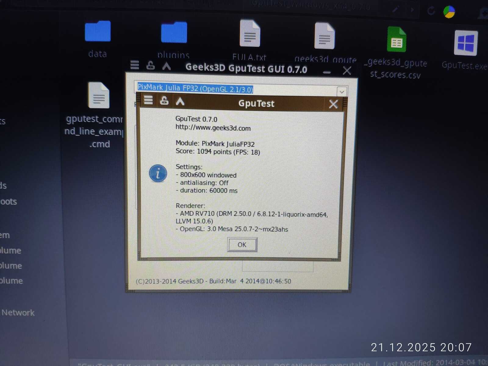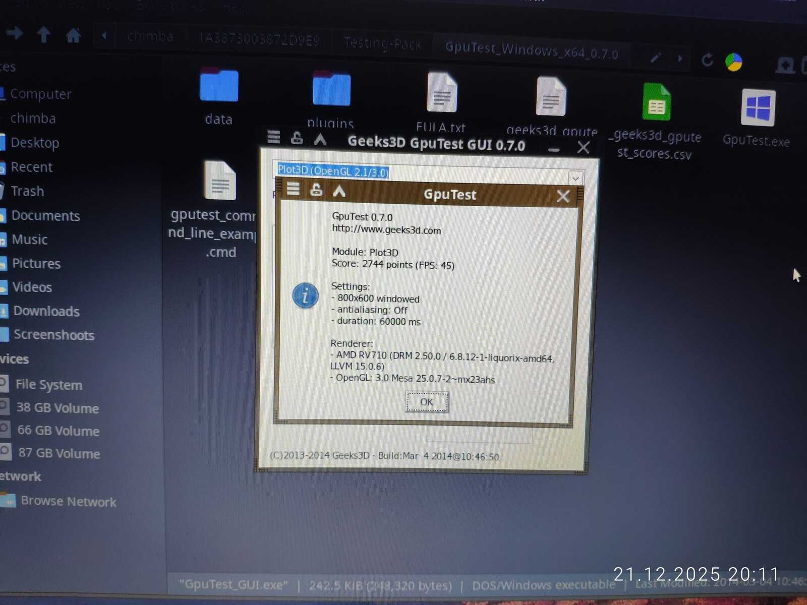 С тестом GiMark драйвер видеокарты AMD не справился в Линуксе. Увы.