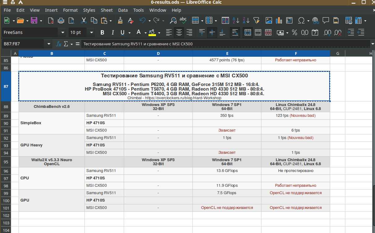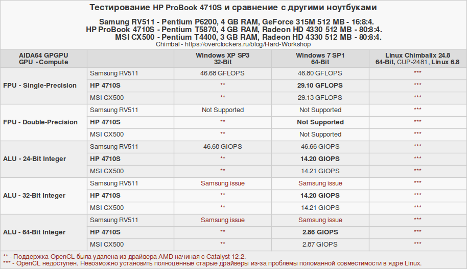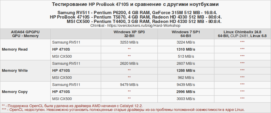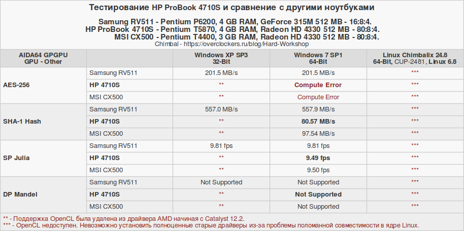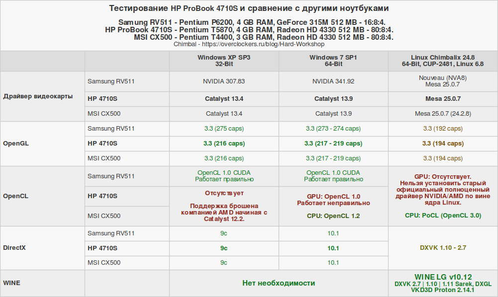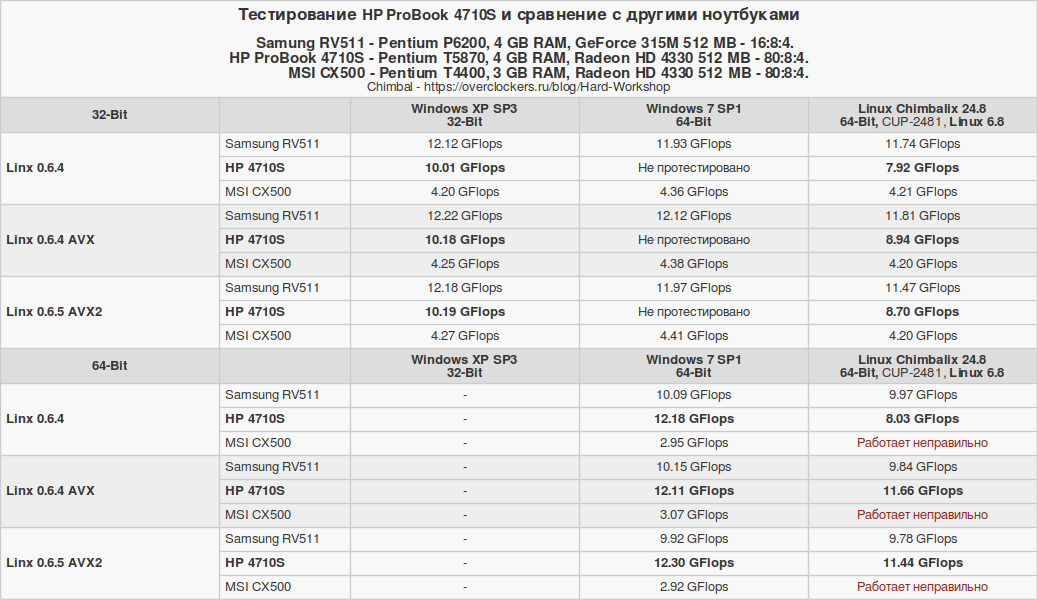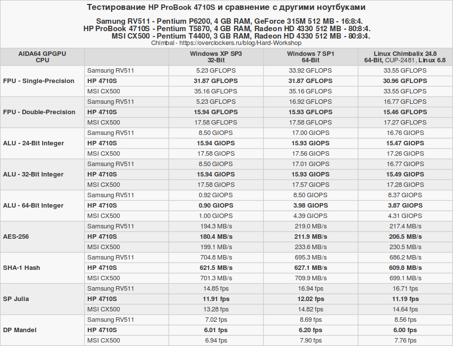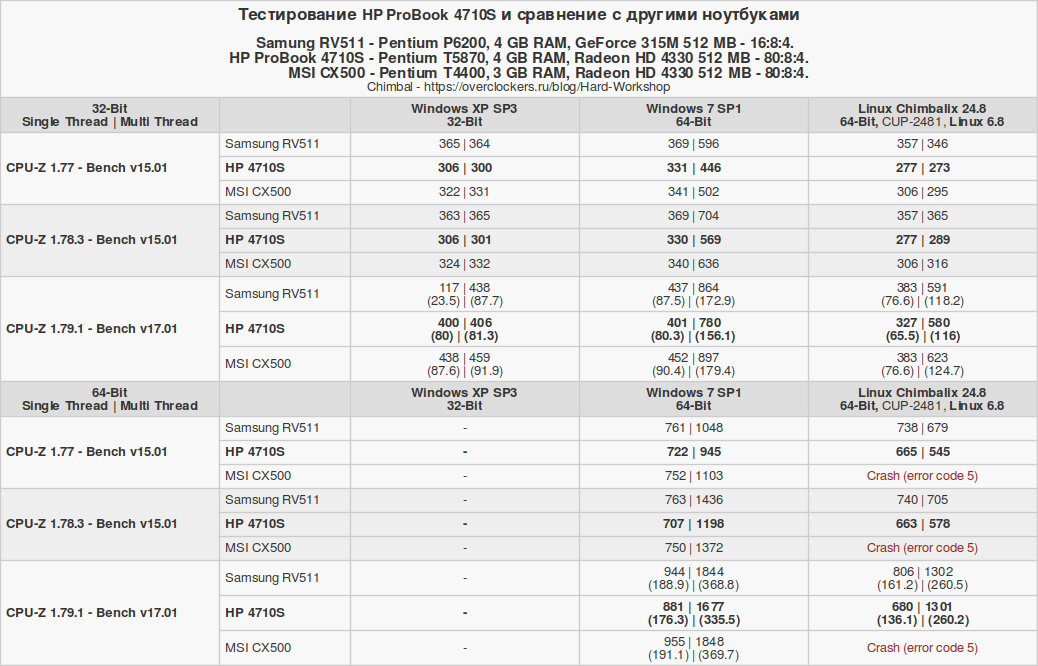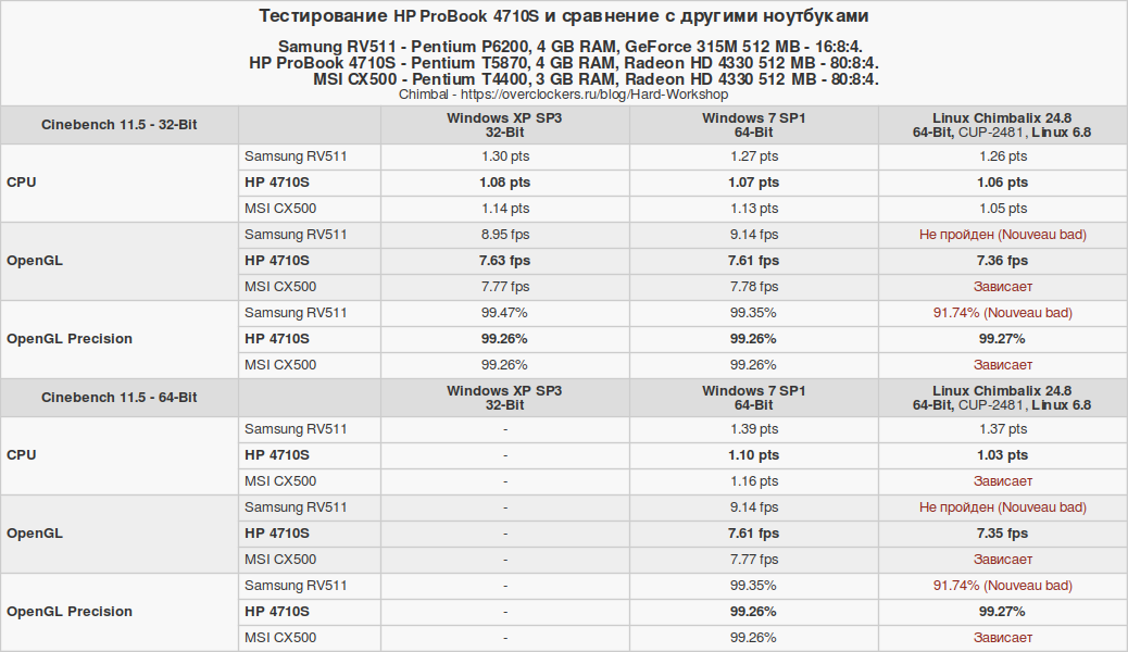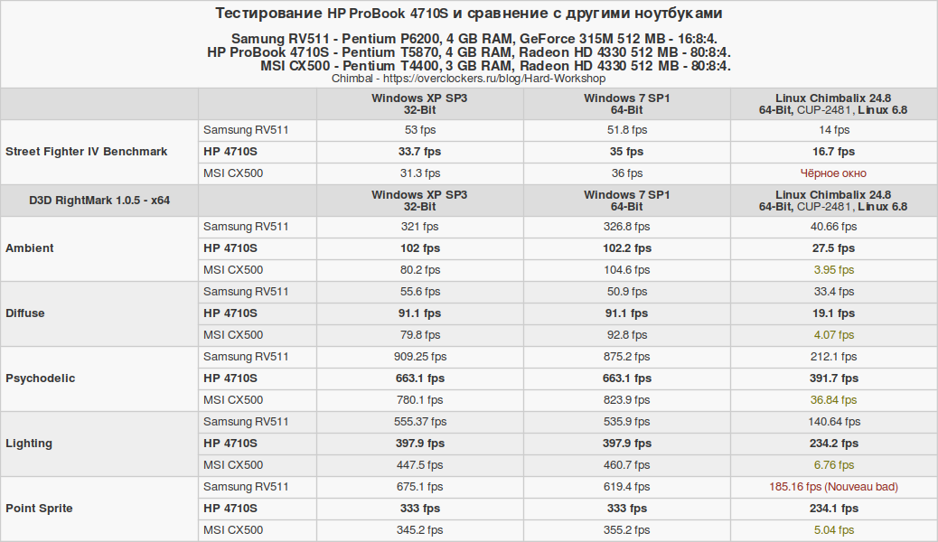Изначально тестовый набор собирался с ноутбуком MSI CX500, а с Samsung RV511 дорабатывался. В процессе отбора осталось лишь три операционные системы: Windows XP, Windows 7 и Chimbalix 24.8. Линукс под названием Pop!_OS окончательно стал жертвой естественного отбора именно на ноутбуке HP 4710S. Но об этом позже. Давайте рассмотрим технические характеристики сравниваемых устройств.