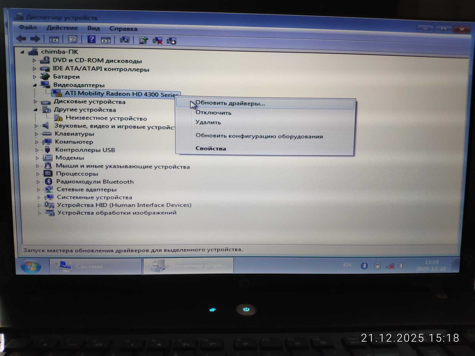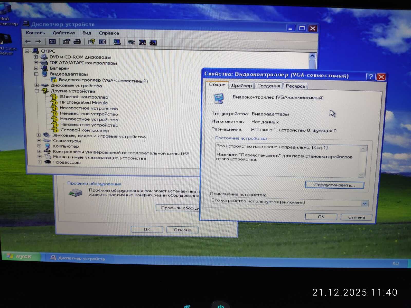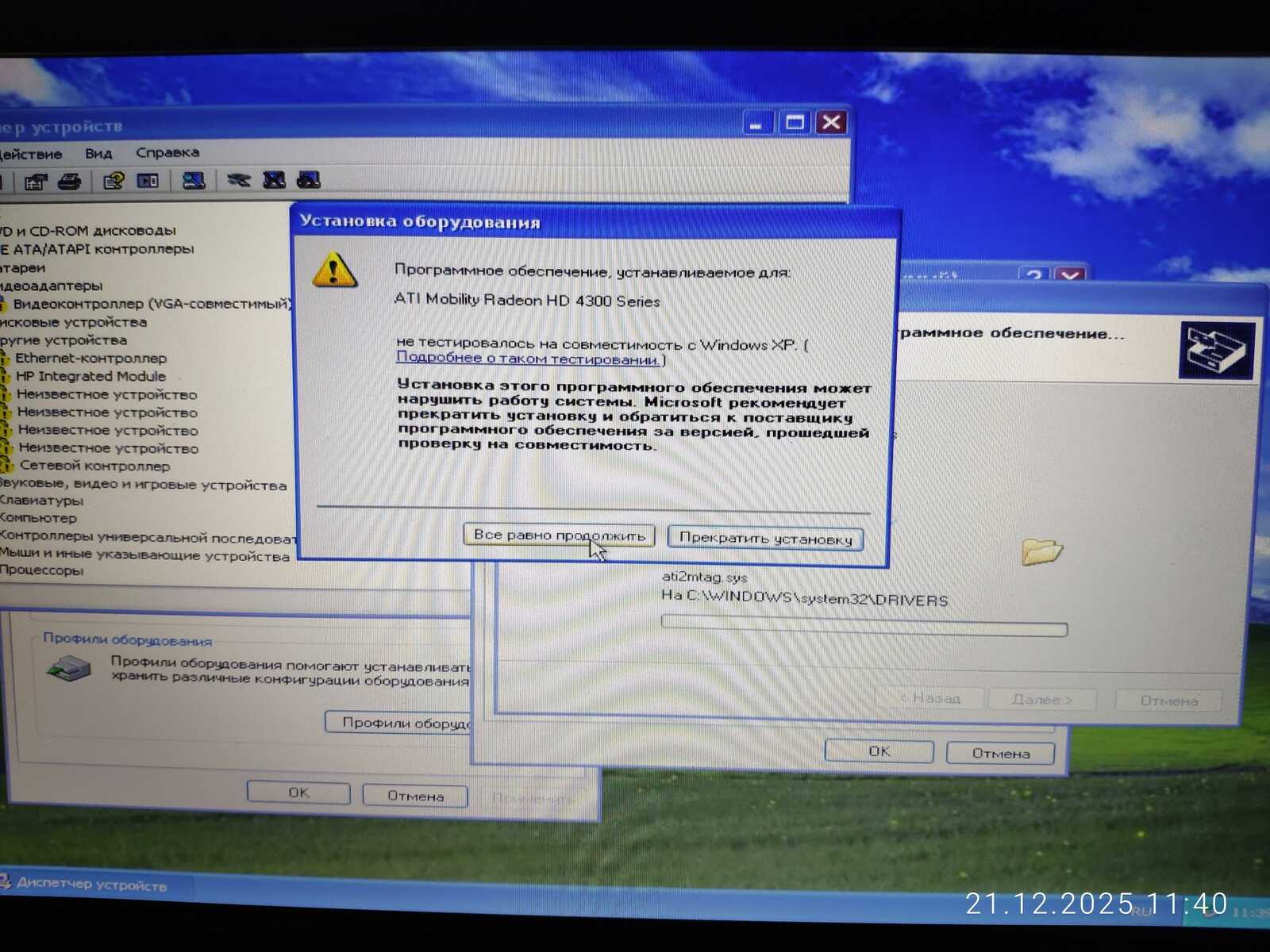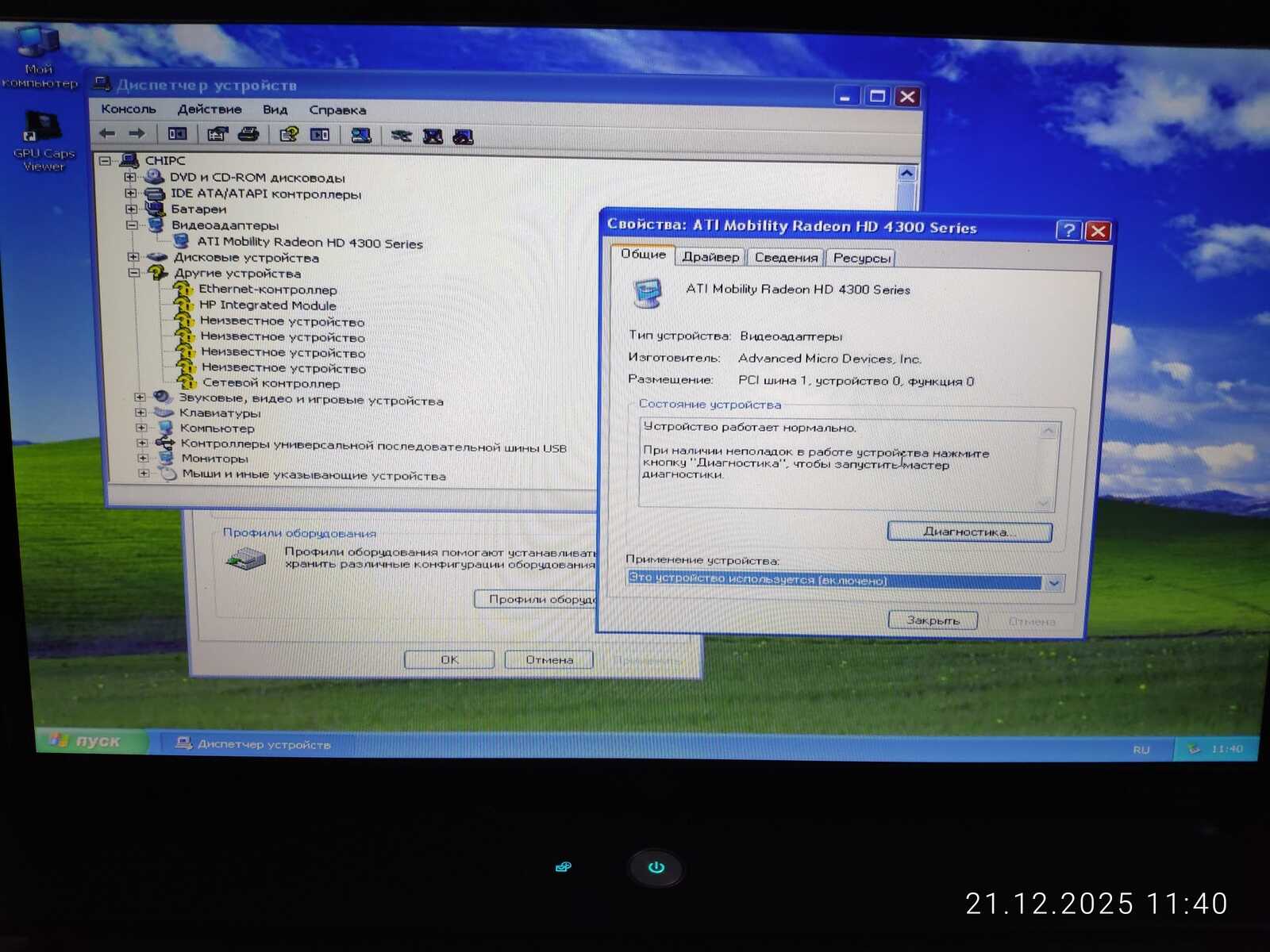 Хотя Windows XP изначально устанавливалась на MSI CX500 с AMD Radeon HD 4330, но на HP 4710S с такой же видеокартой потребовалась переустановка драйвера видеокарты через Диспетчер устройств.