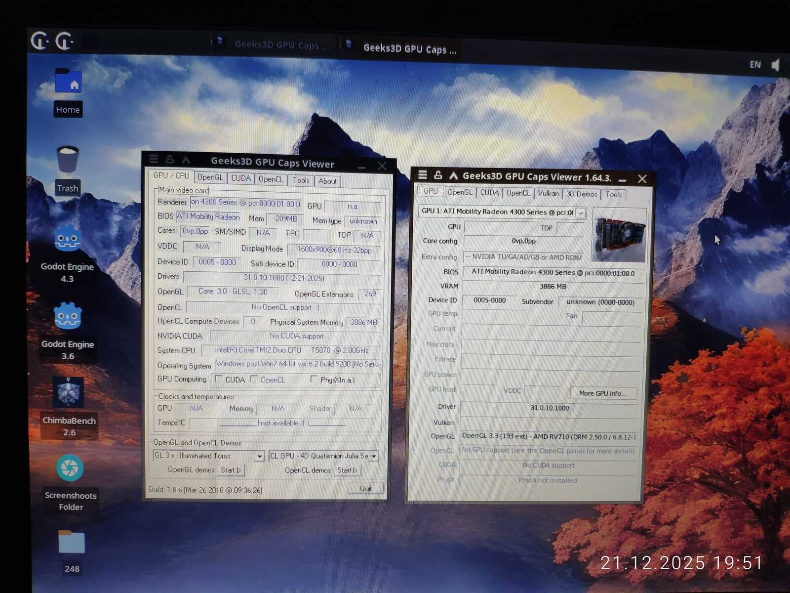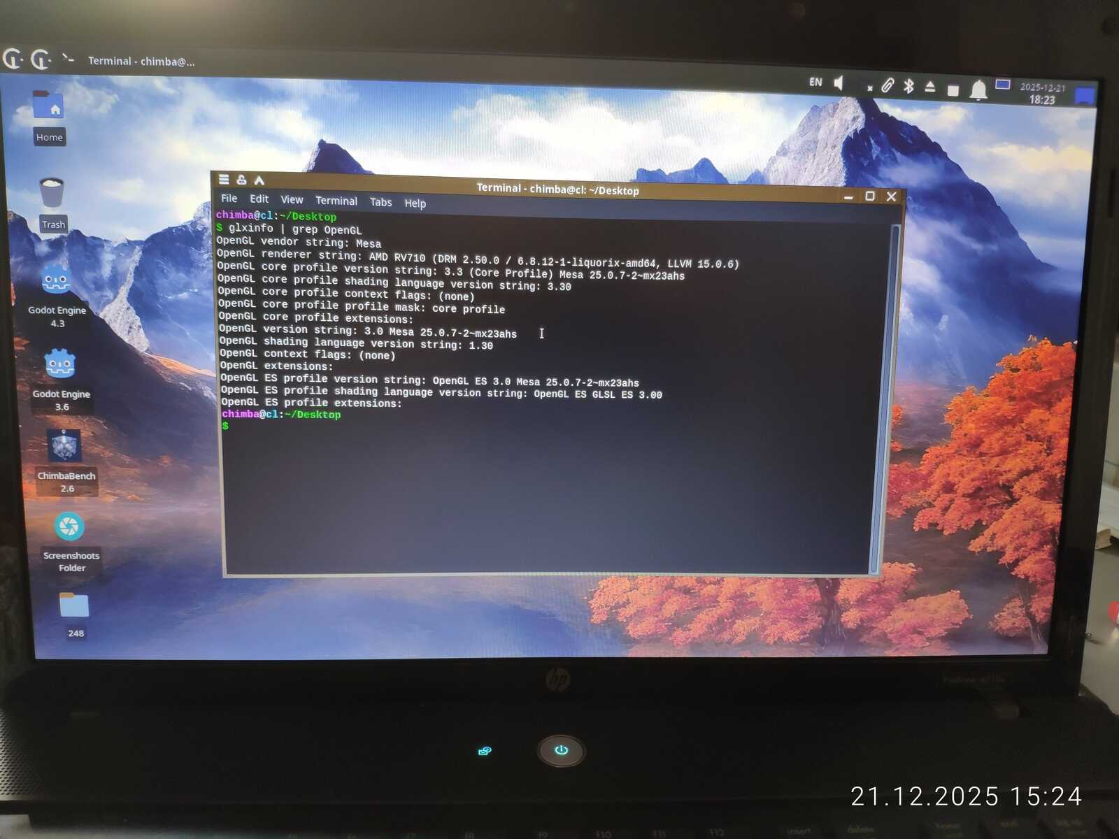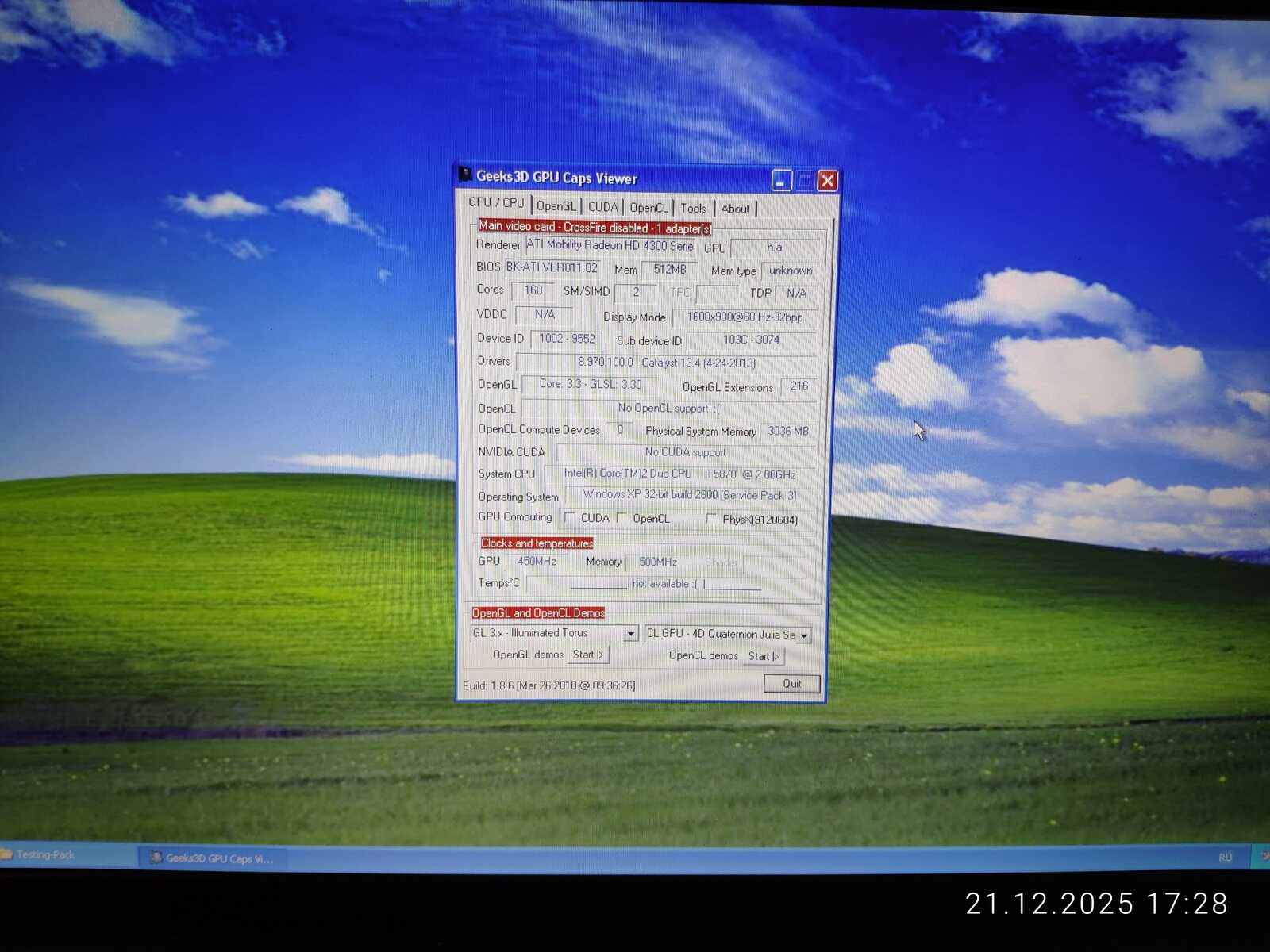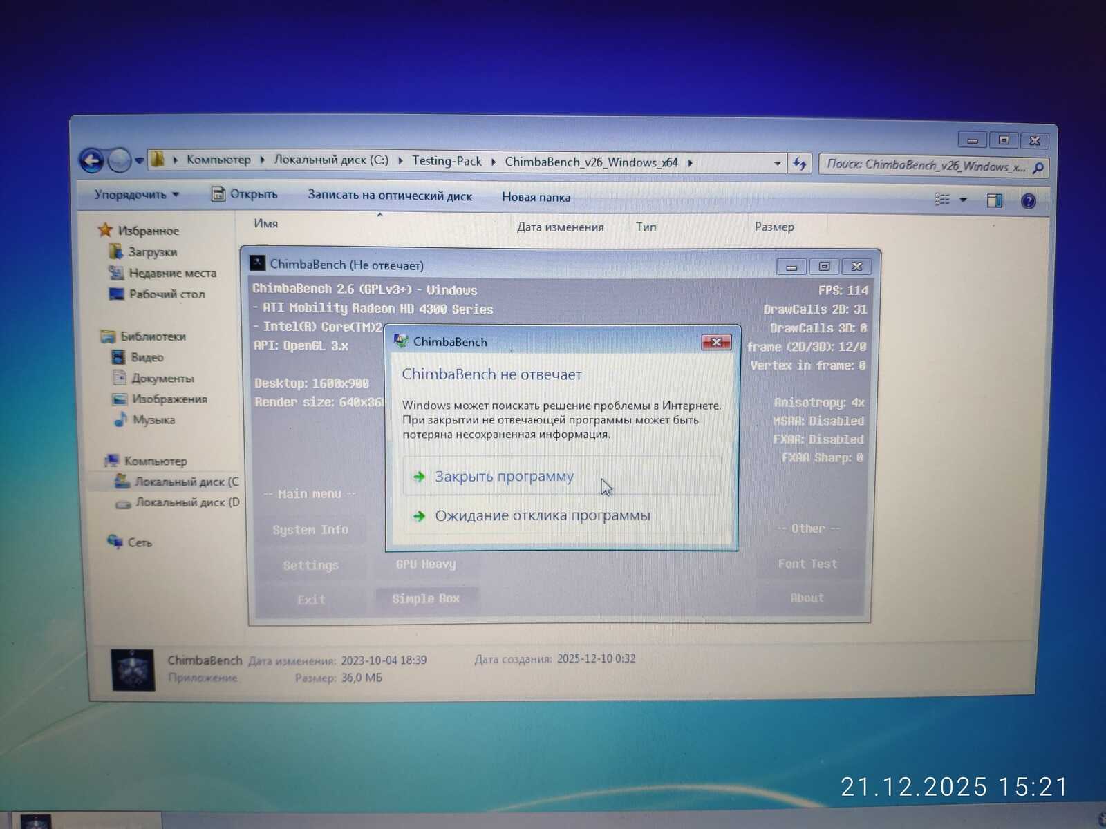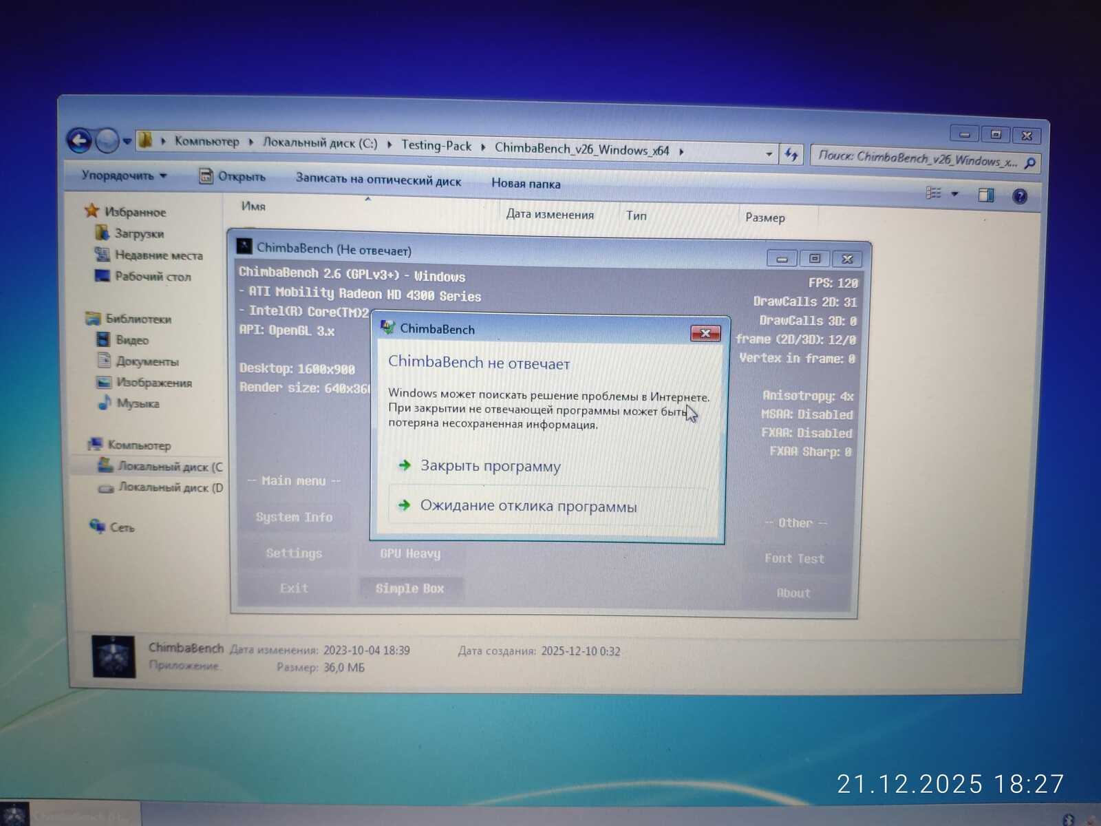 Хотя из этого набора могут быть удалены или добавлены некоторые тесты, пока идём как есть. Осталось только протестировать то, что не было протестировано изначально с ноутбуком MSI CX500. Хотя я уже сделал спойлер в предыдущей статье по поводу кривых драйверов AMD Radeon, но и на другом ноутбуке столкнулся с такой же проблемой в тесте ChimbaBench. Программа просто зависает при запуске по вине плохой реализации OpenGL API в драйвере AMD.