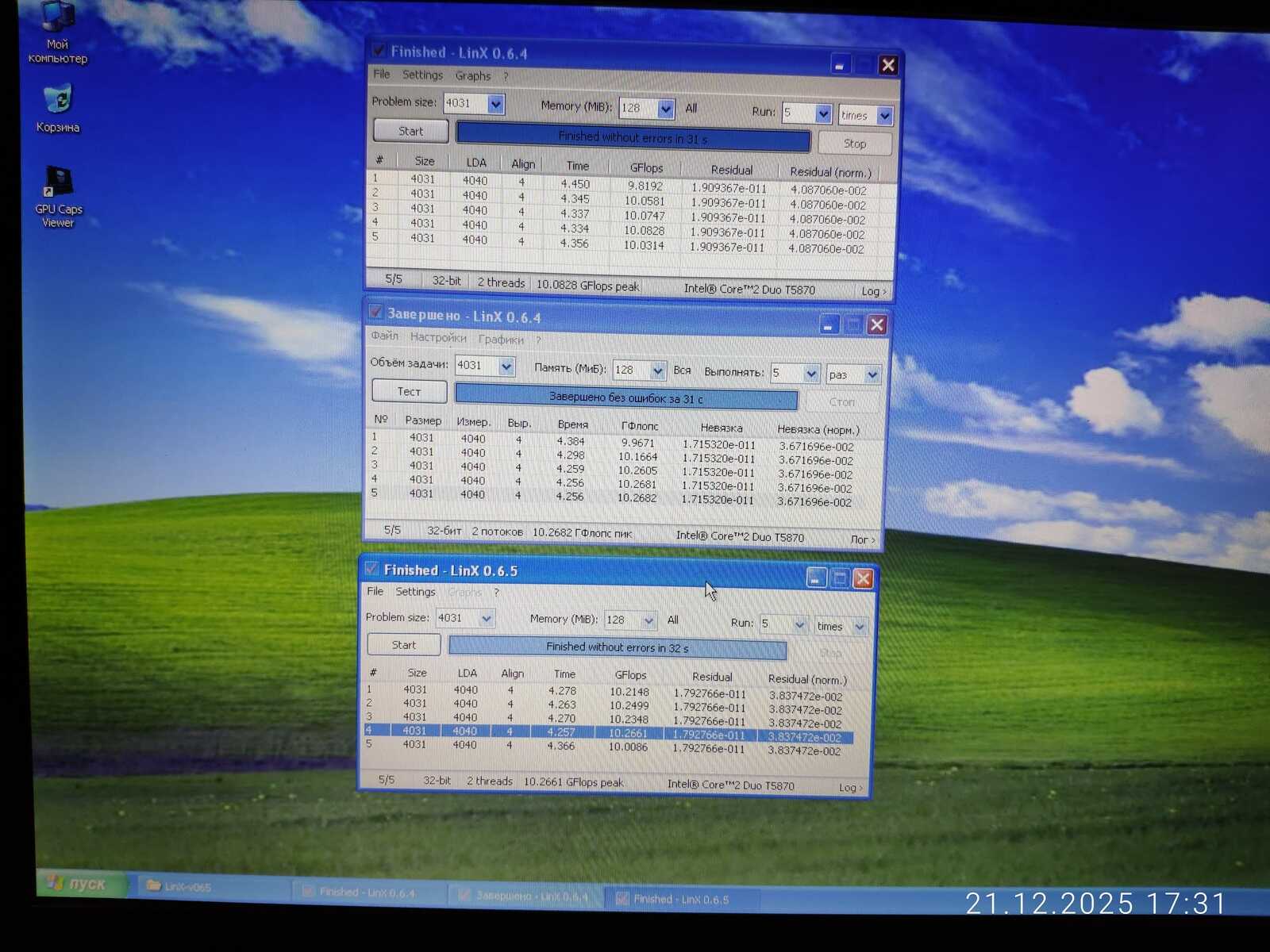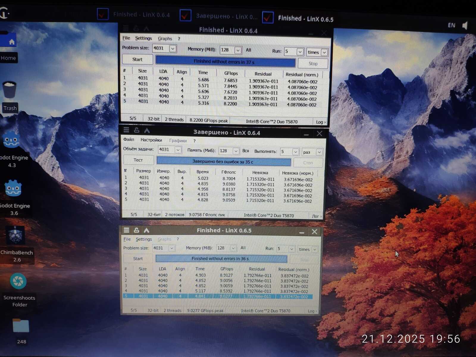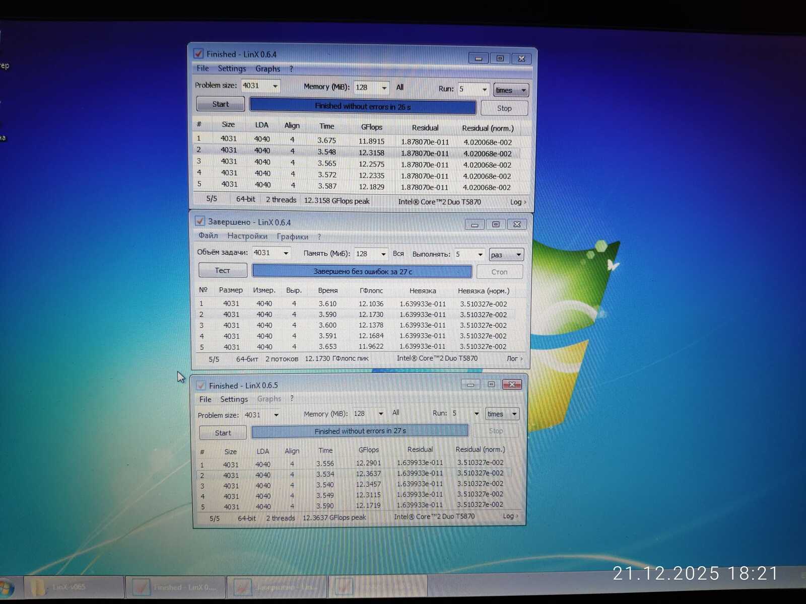 В 32-битном тесте Linx процессор T5870 уверенно превосходит T4400 и почти достигает уровня P6200. Но в 64-битной версии T5870 превосходит уровень более нового P6200.