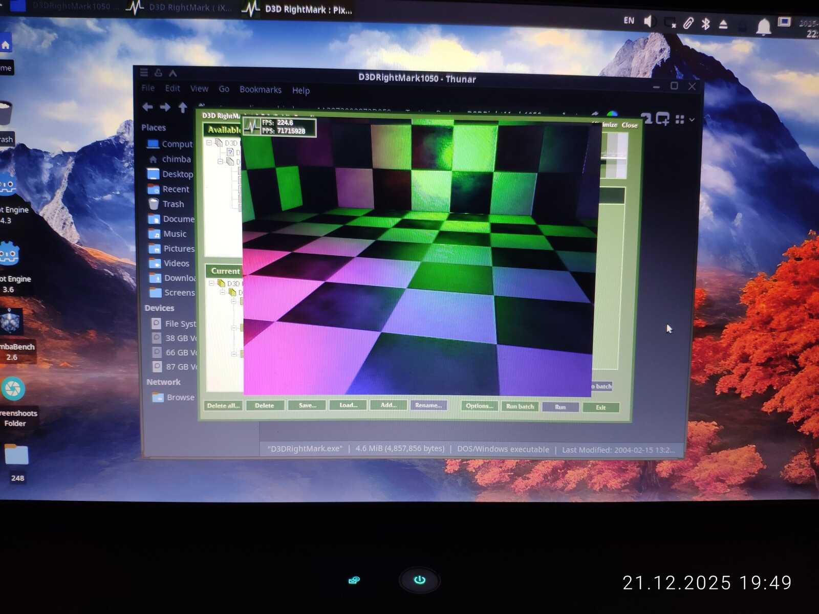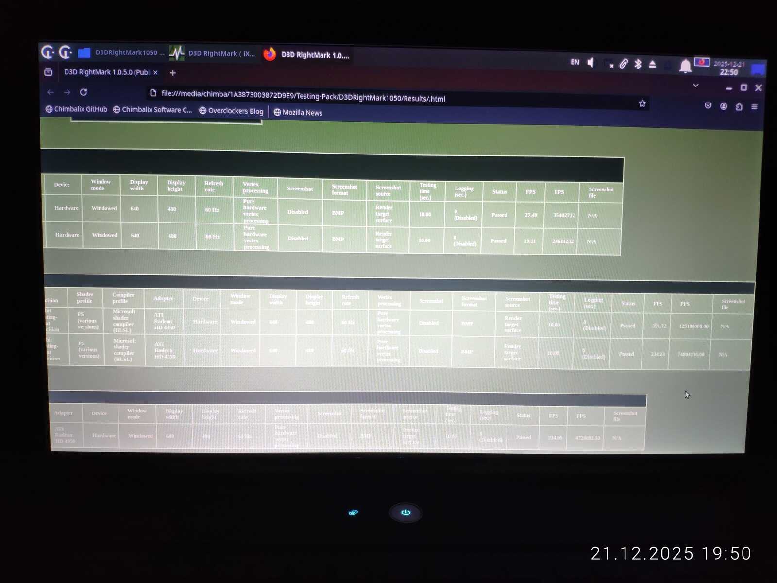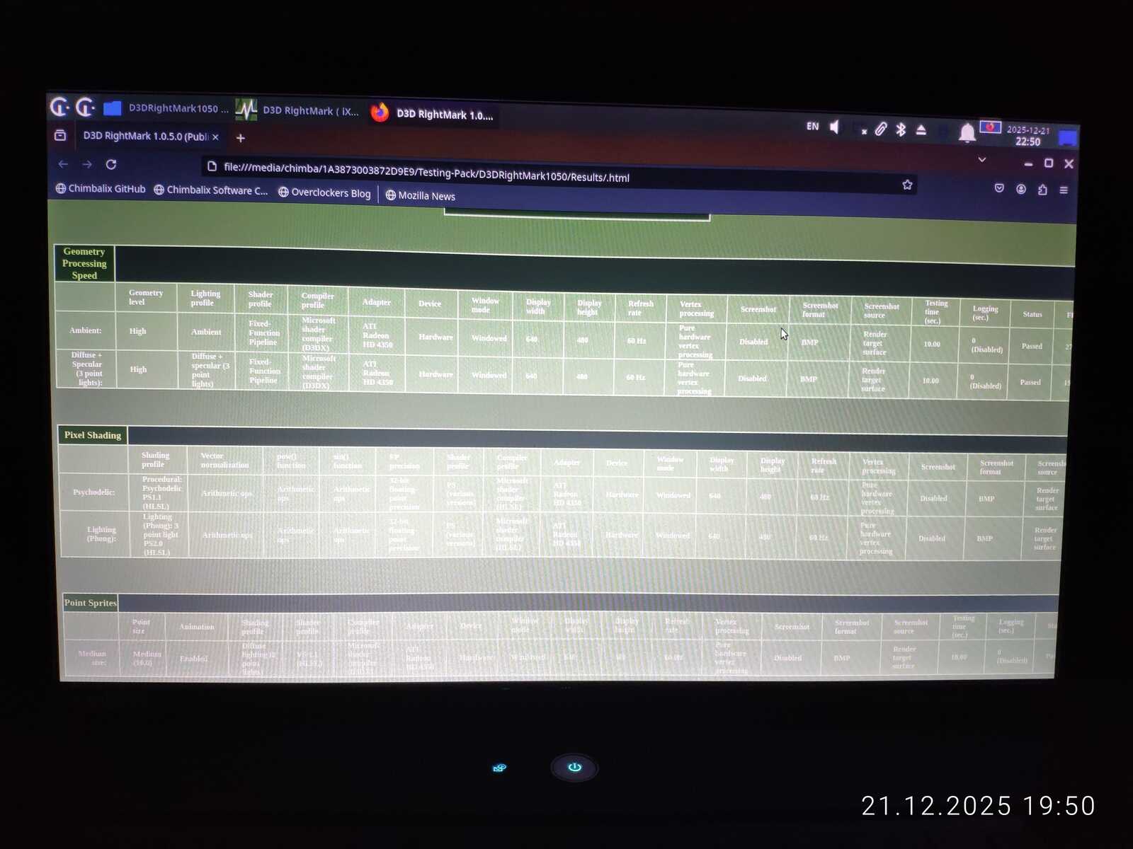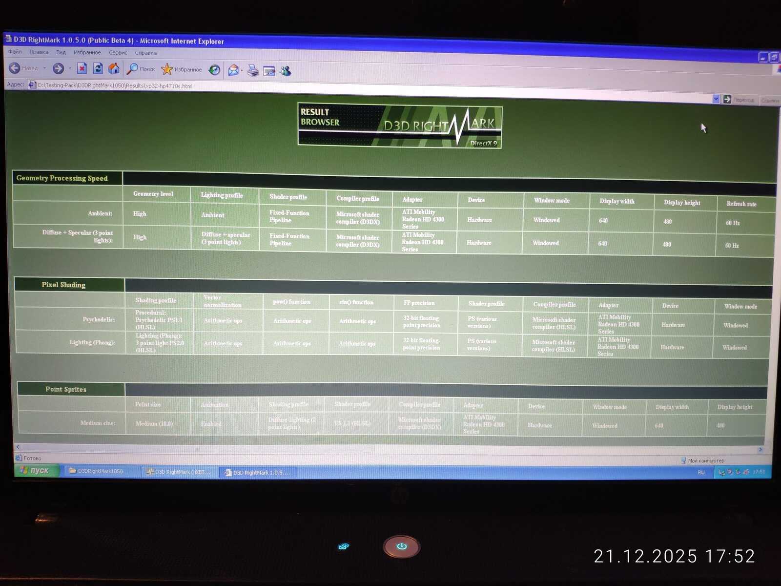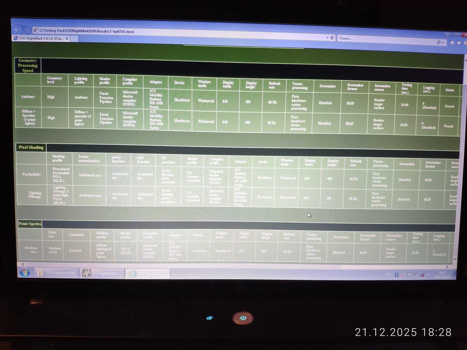 D3D Rightmark показал схожие результаты между двумя ноутбуками с HD 4330. Но GeForce 315 в большинстве случаев всё же лучше и даже в среде Linux, да под управлением плохого драйвера, умудряется выдавать результат выше, чем оказался способен AMD Radeon.