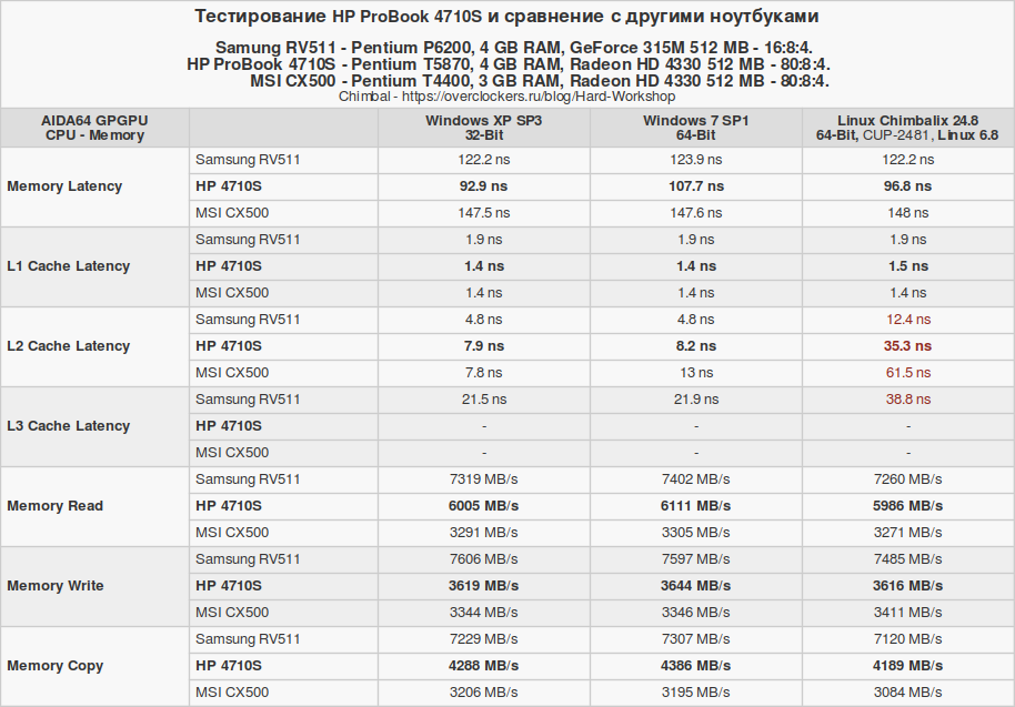В плане задержек доступа к ОЗУ у HP 4710S есть очевидное преимущество даже перед более новым Samsung RV511. Но пропускная способность одного канала DDR3 будет всё же выше, чем у двух каналов DDR2. Конечно, это зависит не только от процессора и частоты памяти, но и чипсета. Однако цифры говорят сами за себя.
