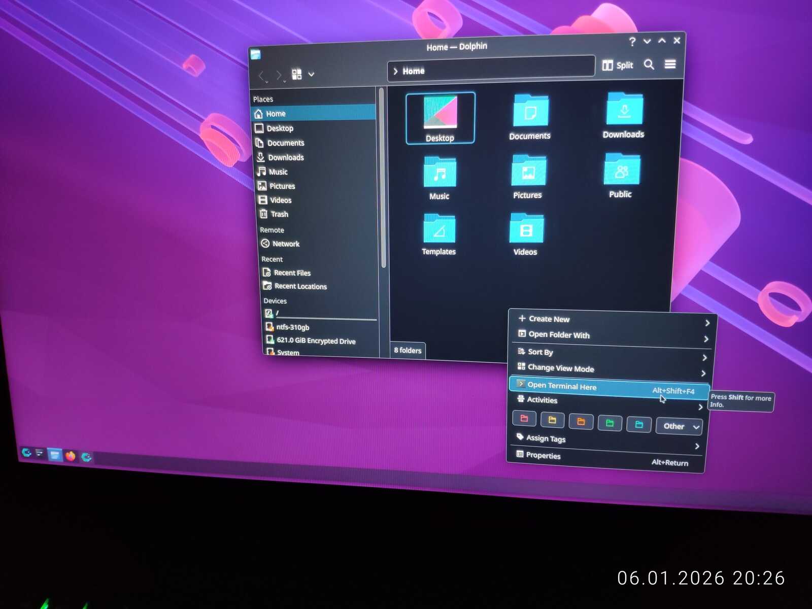 Следующая проблема уже в рабочем окружении KDE. Я просто не могу по-человечески запустить терминал, потому что на рабочем столе в контекстном меню его нет. Ладно. Нам не привыкать к танцам с бубном.