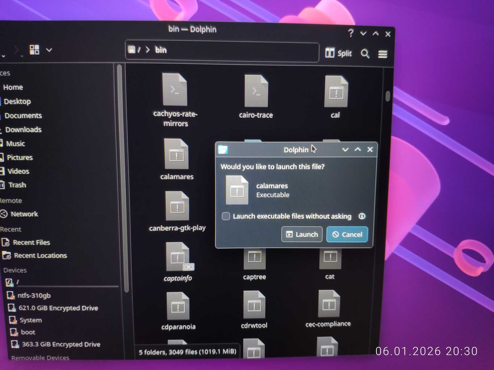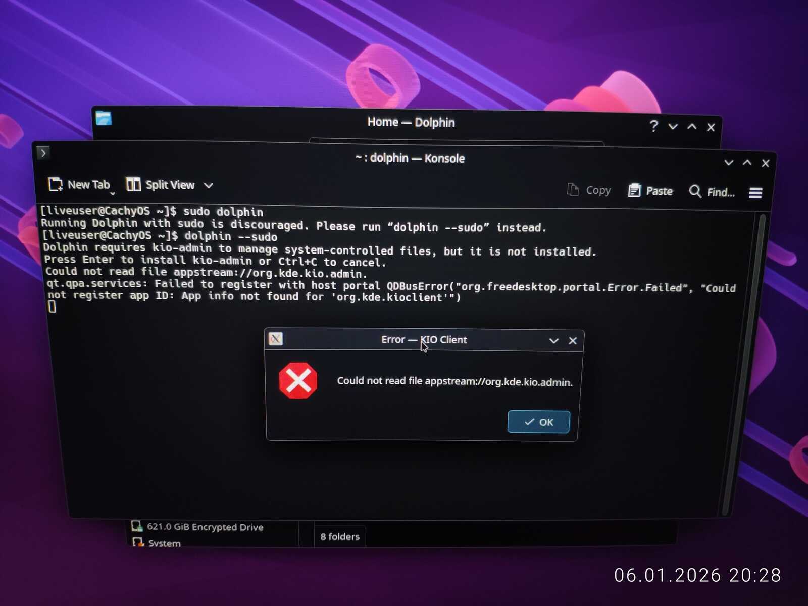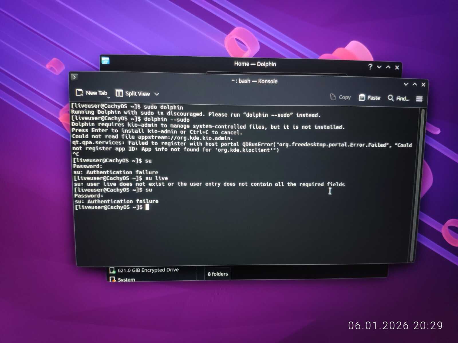Запустить файловый менеджер с root правами по-прежнему невозможно. Через sudo он отказывается запускаться. С параметром --sudo тоже не запускается. Ад зависимостей, характерный для Linux, проявил себя. Перейти в режим su невозможно, ибо мне, пользователю, неизвестен необходимый для этого пароль. Да и не факт, что файловый менеджер запуститься после su. По факту CachyOS наглым образом ущемляет свободу и возможности пользователя.