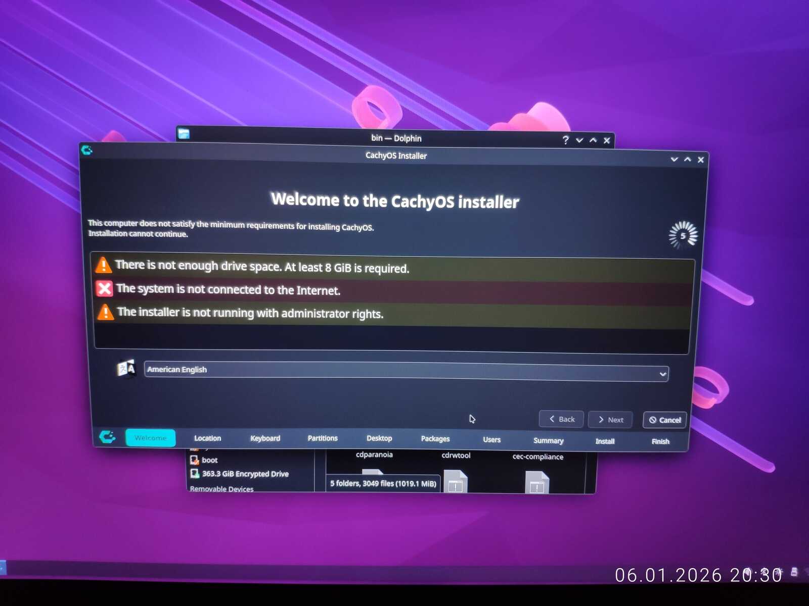 Чисто технически, я мог бы дать доступ в Интернет дистрибутиву CachyOS и попытаться установить, потратив трафик, который, между прочим, я оплачиваю из своего кармана, а не разработчиков дистрибутива. Но это не имеет смысла, ведь систему невозможно установить без доступа к интернету. Если что-то случится с репозиториями дистрибутива, система окажется мёртвой, независимо от доступа к сети.