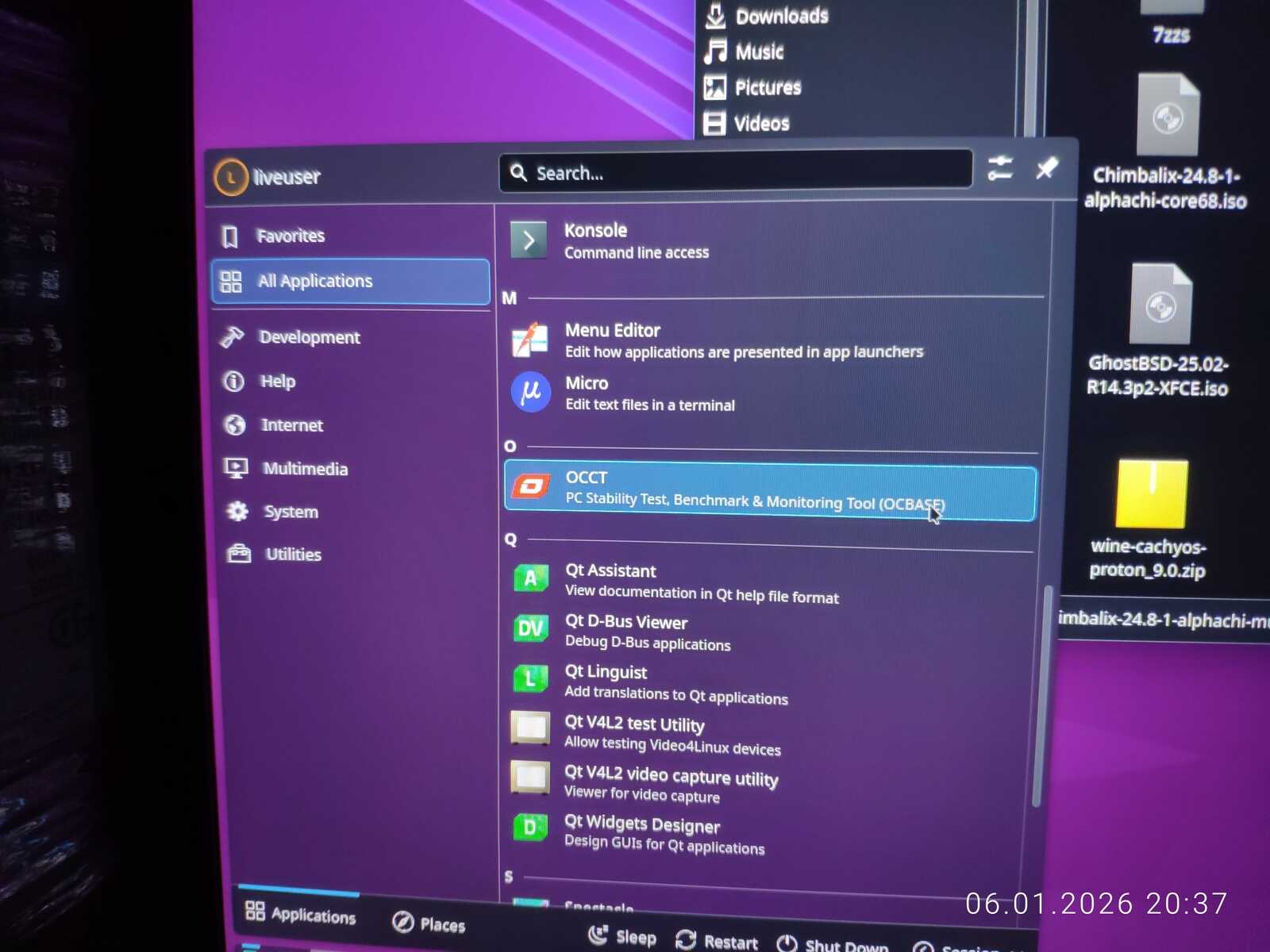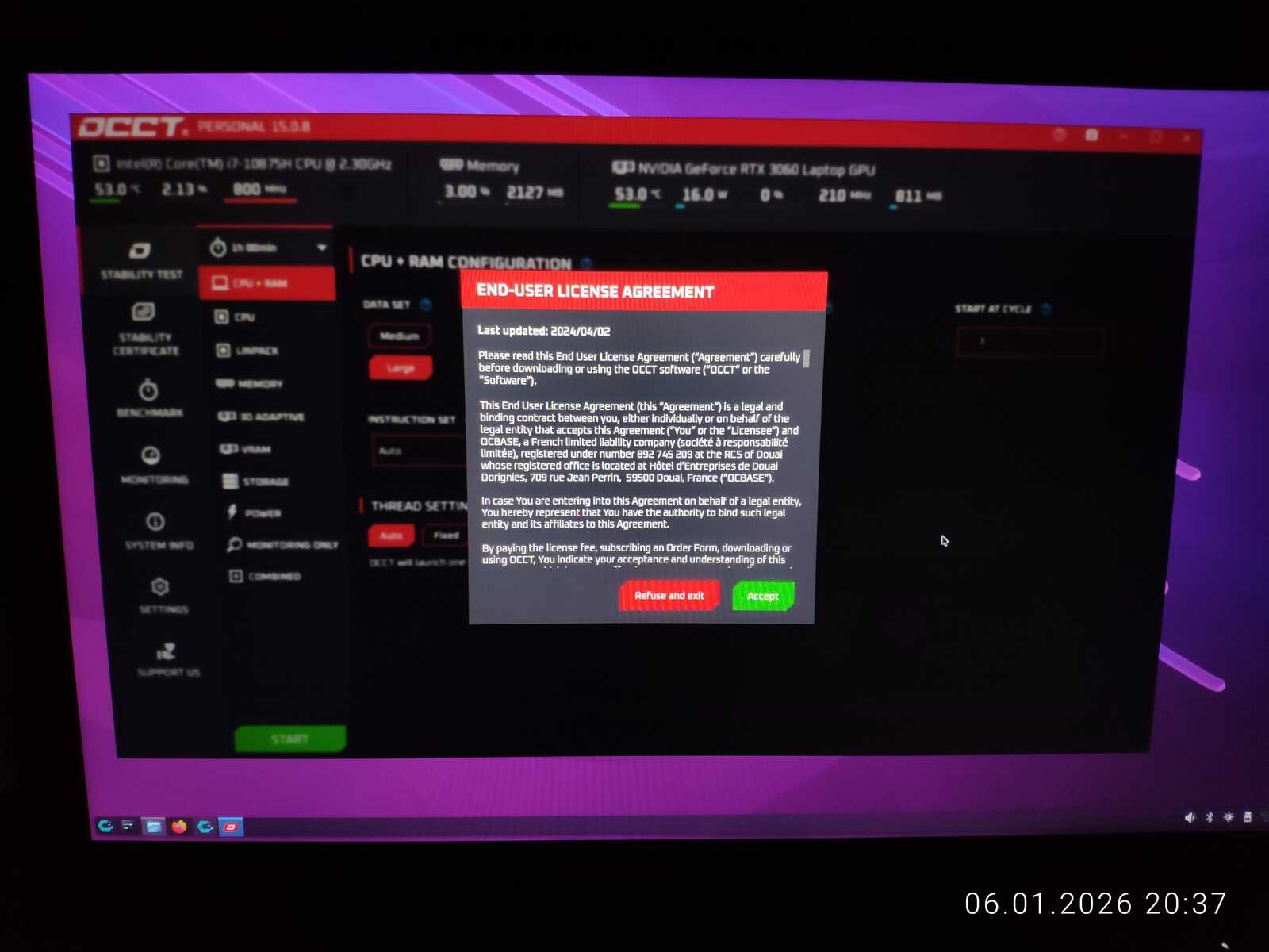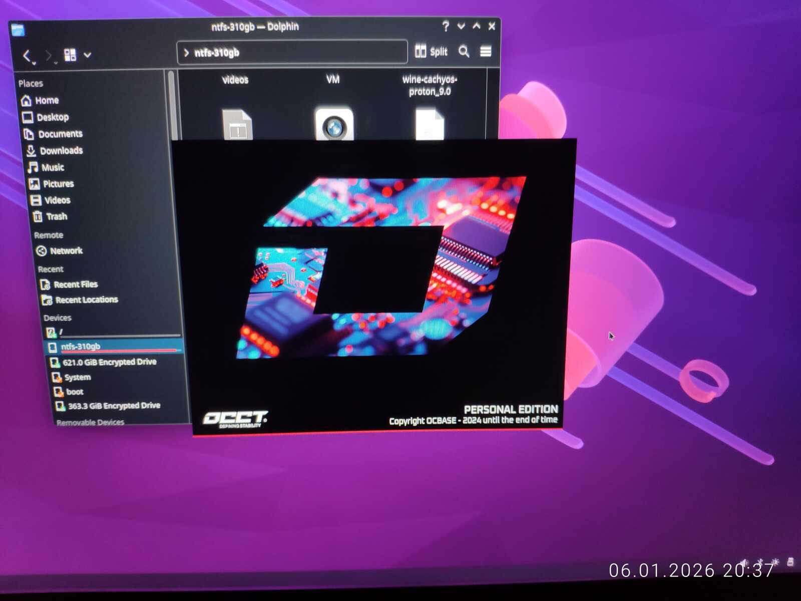 Осталось проверить встроенную в CachyOS утилиту OCCT. С первого раза не запустилась. Со второго раза запускалась очень долго, хотя ноутбук далеко не самый слабый (64 ГБ ОЗУ, i7-10875H и RTX 3060 Mobile). Да и вообще эта CachyOS какая-то тормознутая в целом. Потом программа потребовала принять какое-то лицензионное соглашение. Сразу в мусорку такие программы.