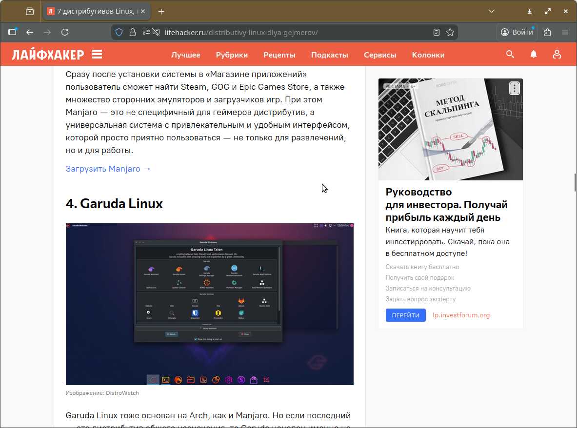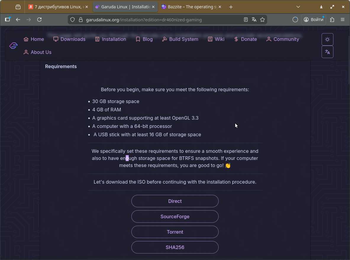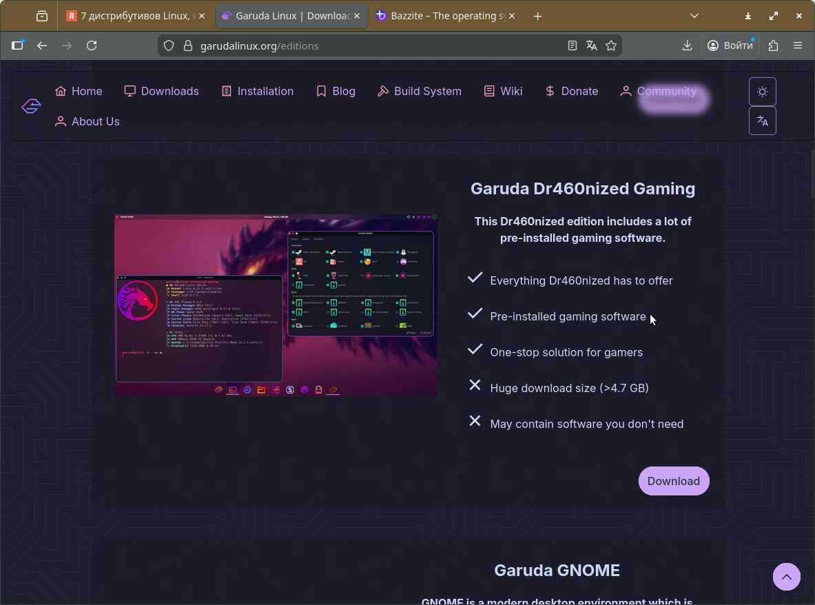 Так же выбрал Garuda Dr460nized Gaming. Там пообещали предустановленный игровой софт, что бы это не значило. По идее, у меня, пользователя, не должно возникнуть проблем с запуском приложений и игр на этом Линуксе. Доверяемся красивой писанине на сайте и загружаем образ.