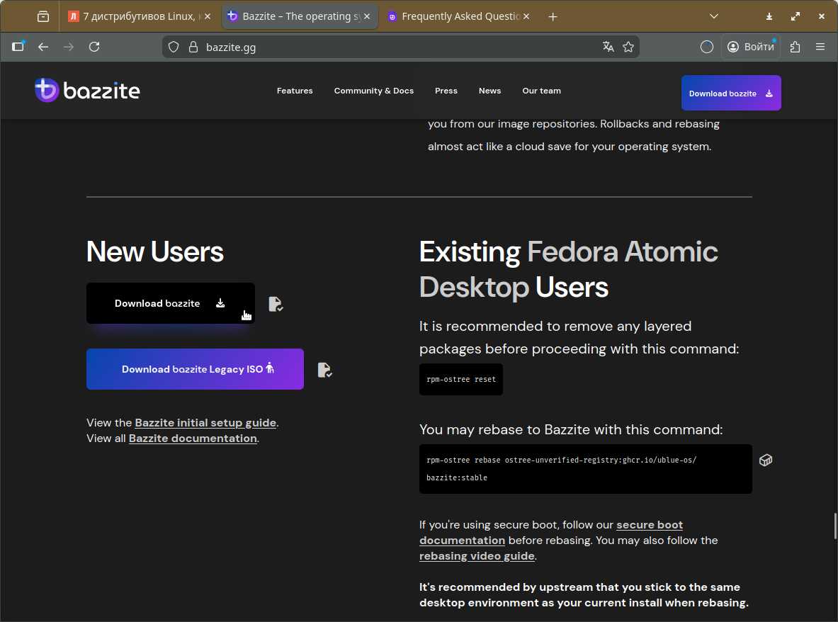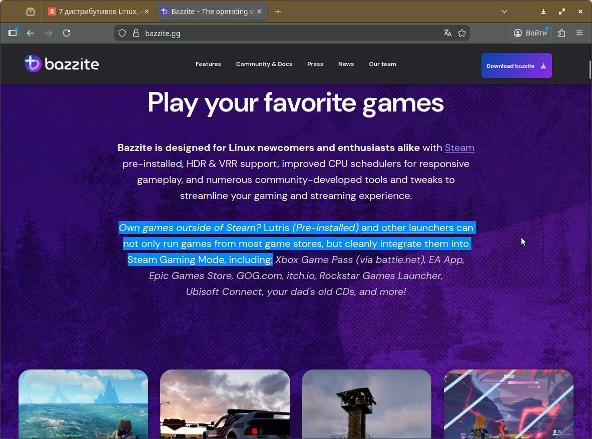 Первый выбор — это Bazzite. Хотя писанина на официальных сайтах всевозможных Линуксов, редко соответствует действительности, когда рассказывают о массе преимуществ и возможностей. Но поверим, что в этом Линуксе действительно есть всё, что нужно.