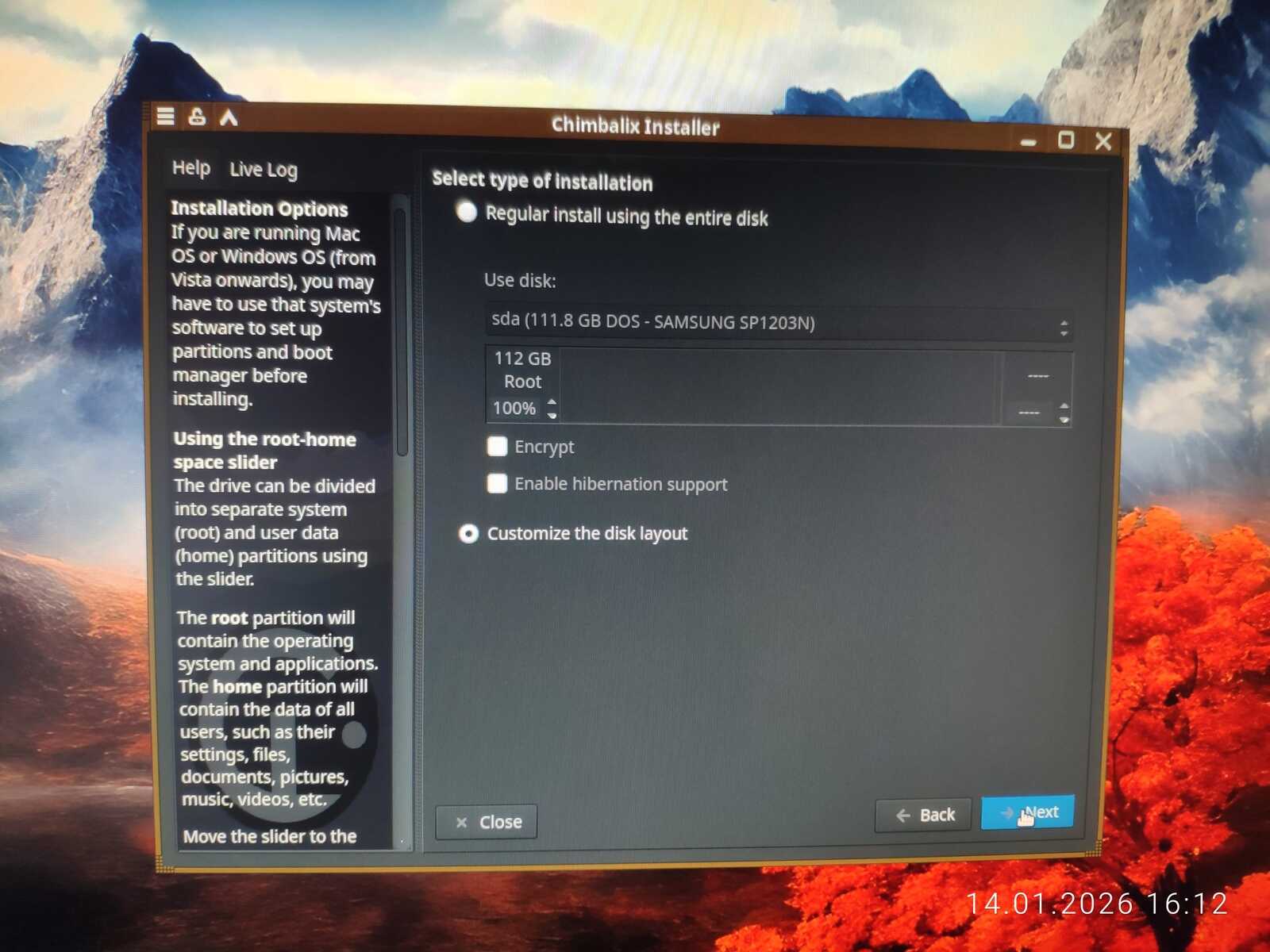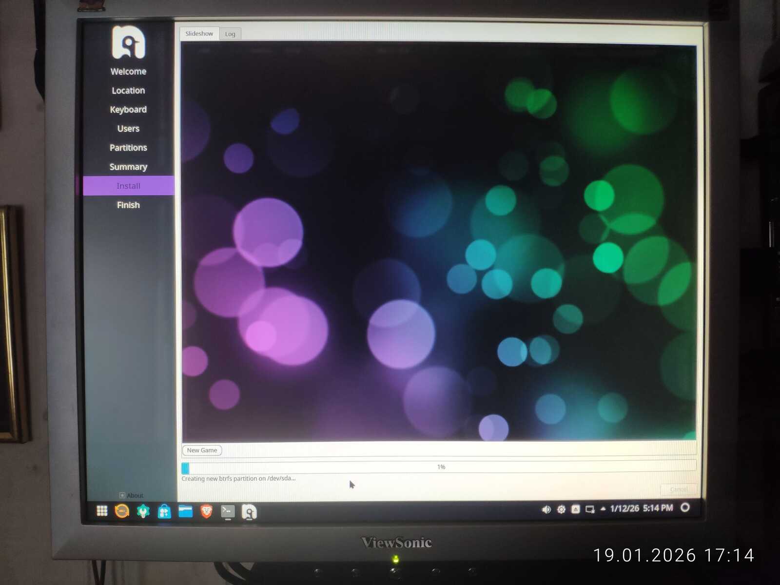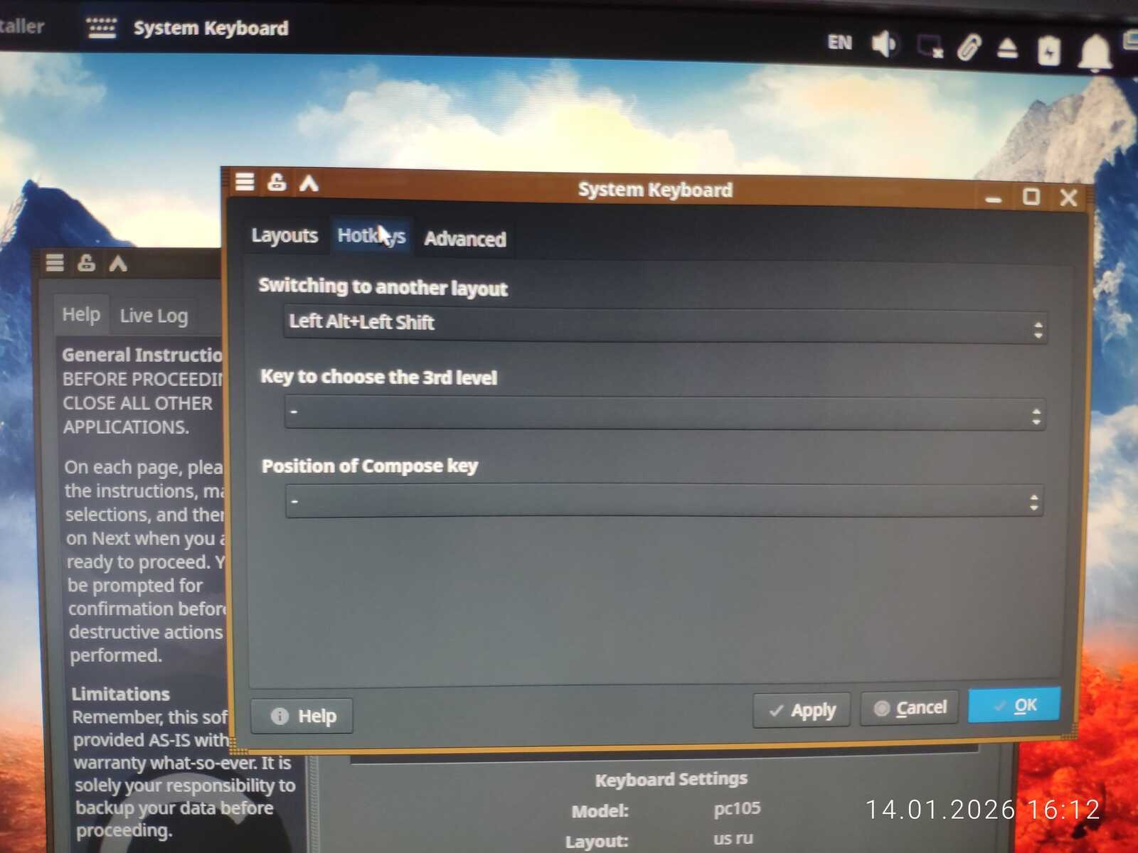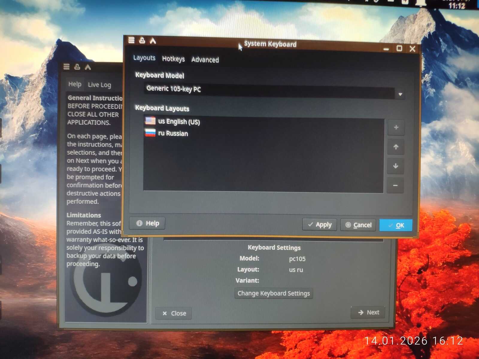 В программе установки я не нашёл вменяемых настроек клавиатуры. Даже дату и время по-человечески нельзя настроить. А ручную разметку дисков я, как пользователь тоже не обнаружил, потому запускал стороннюю утилиту для работы с разделами дисков. Правда, далеко не ушёл, ведь экран внезапно заполнился артефактами, и компьютер перезагрузился.
