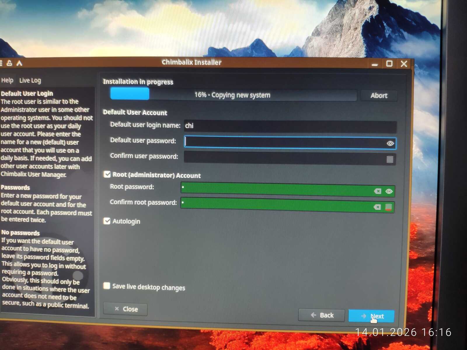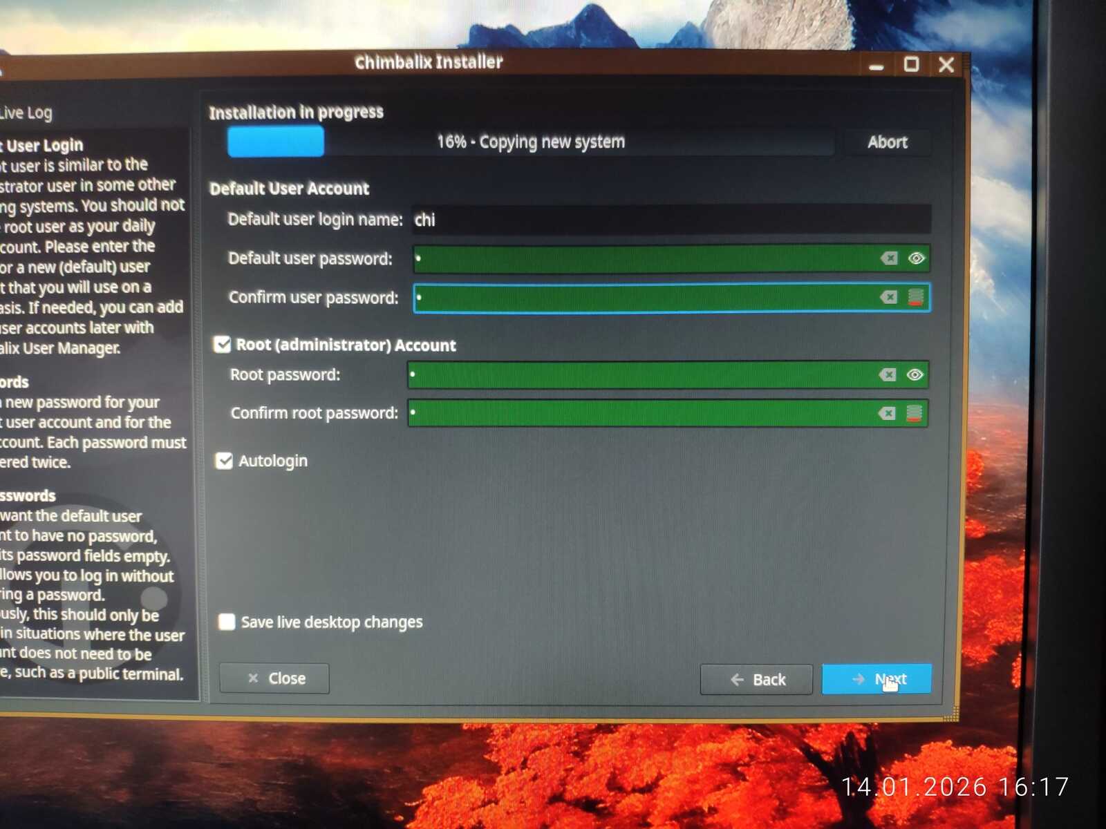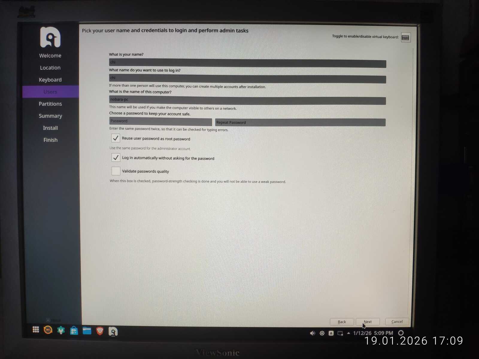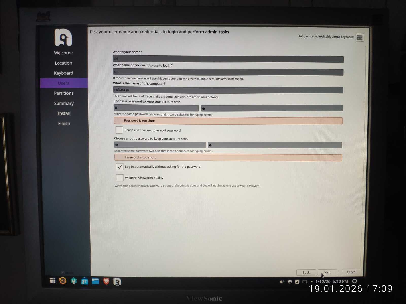 Приступаем к установке дистрибутива Nobara на тестовый ПК. В отличие от некоторых, разработчики Nobara действительно постарались доработать программу установки, и она не ущемляет свободу пользователя при создании учётной записи. Можно даже без пароля создать пользователя и управлять автоматической авторизацией.