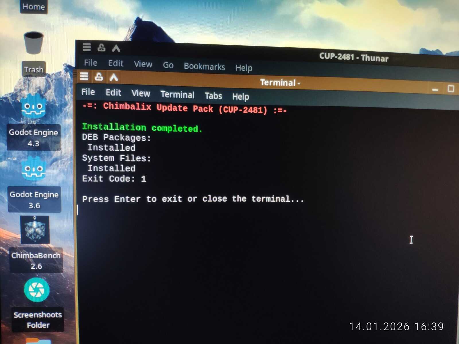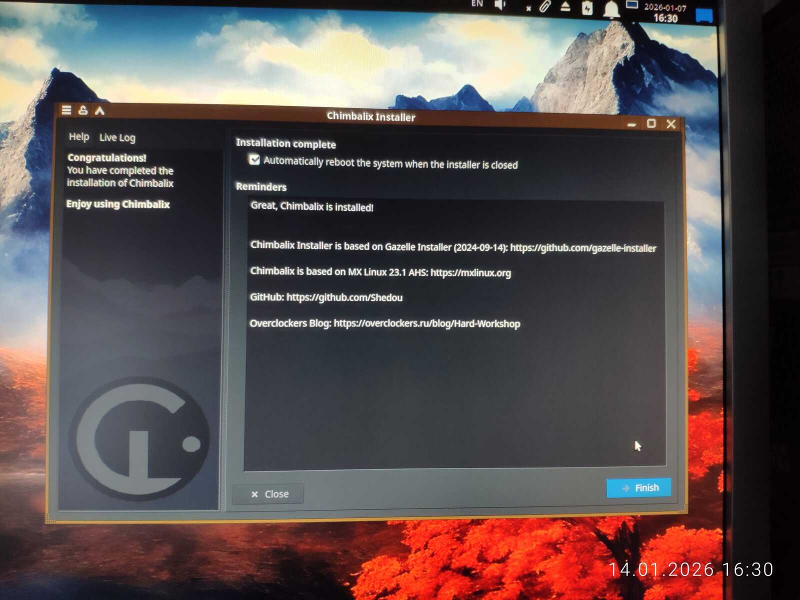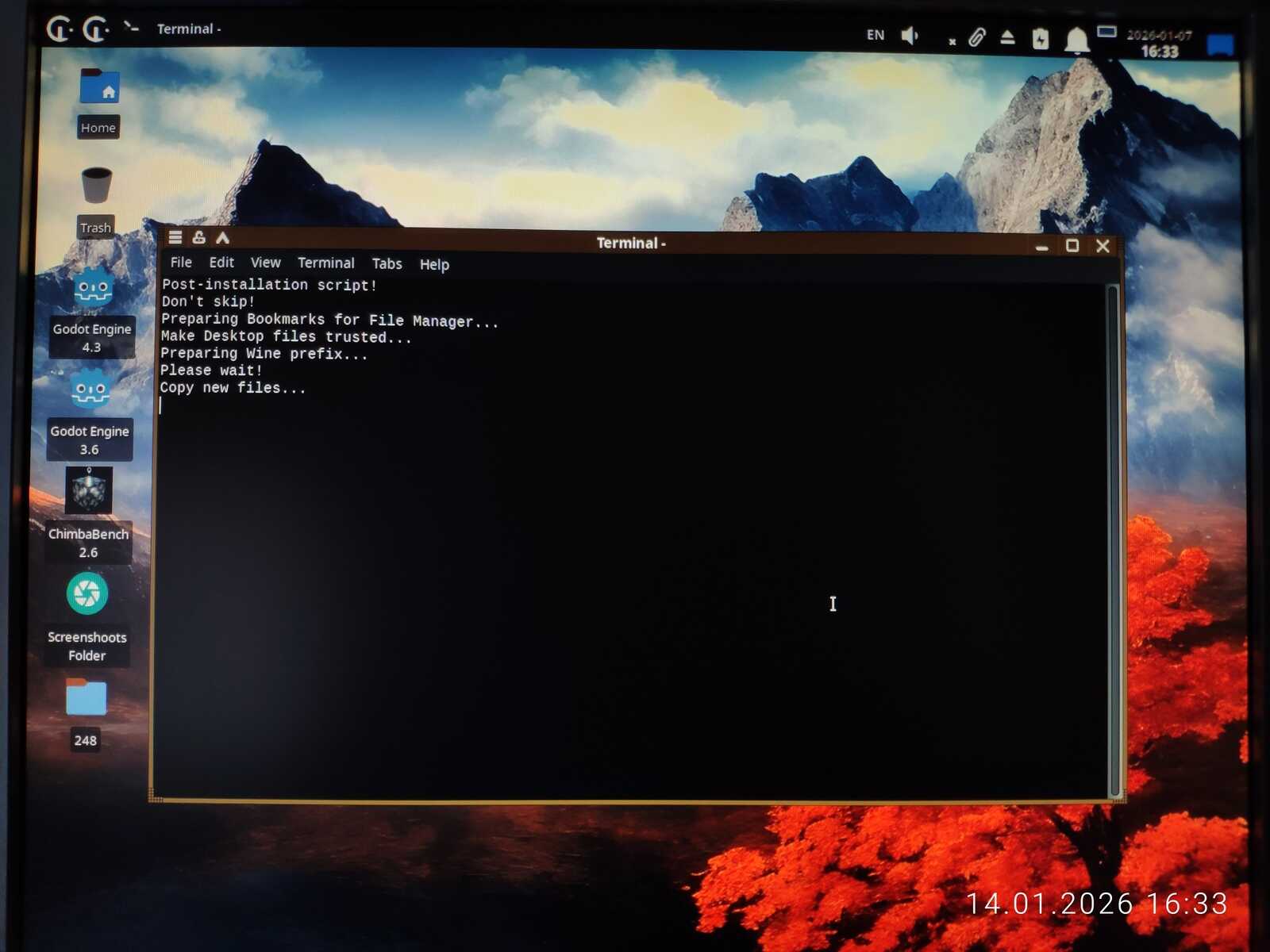Первый этап установки завершился. Второй этап происходит при первом запуске Chimbalix. Настраивается WINE, и в целом подготавливается система для использования без лишних танцев с бубном.