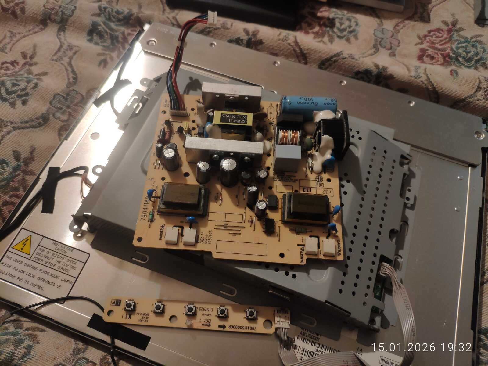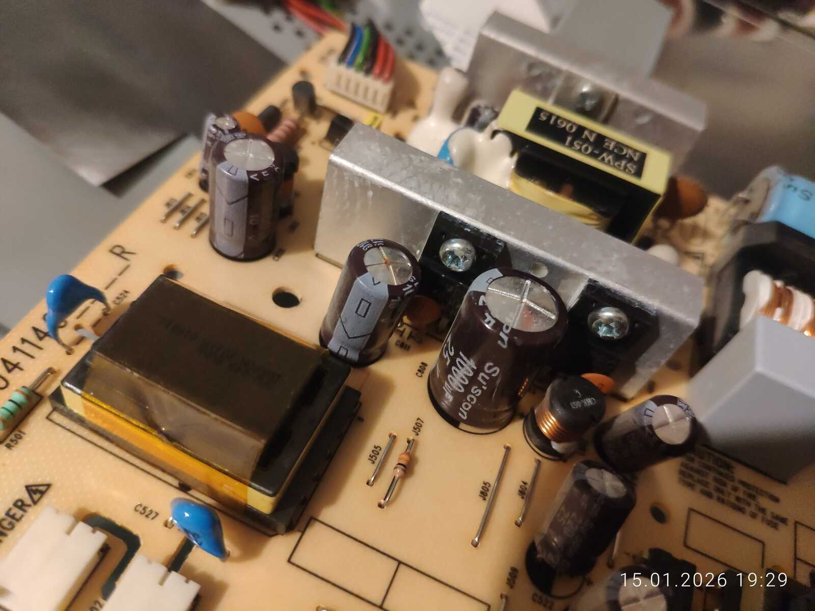 Два виновника выявлены с первого взгляда на блок питания. Вспухло два конденсатора на 10 вольт 1000 мКф и 25 вольт 1000 мКф.