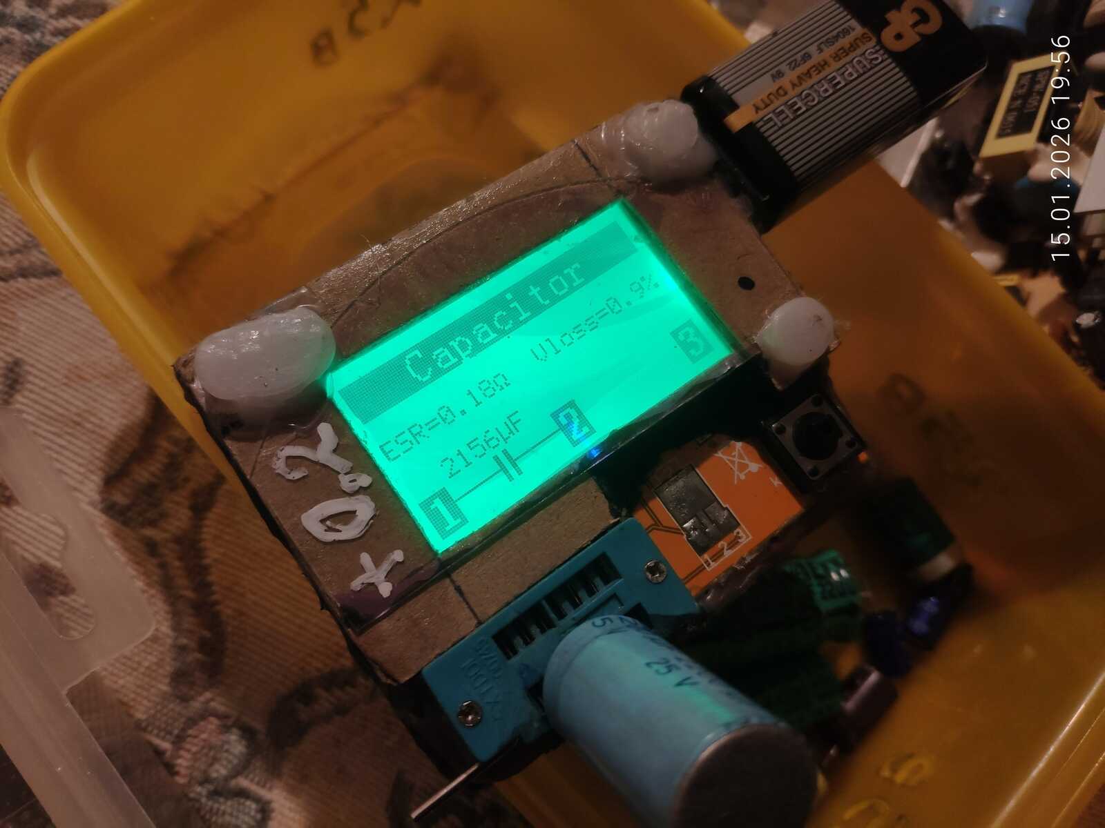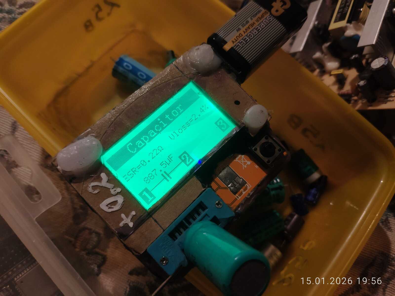 Поискав по сусекам, нашёлся подходящий конденсатор на 25 вольт 2200 мКф. Фактическая ёмкость около 2150 мКф. Потери меньше одного процента. ESR с погрешностью, но образец хороший попался. Ёмкость выше необходимого в 2 раза, но это не проблема. Плохо, если будет сильно меньше положенного.