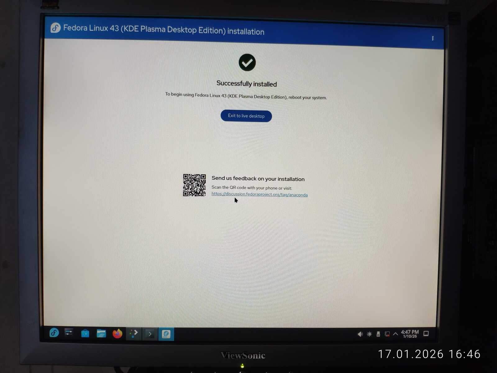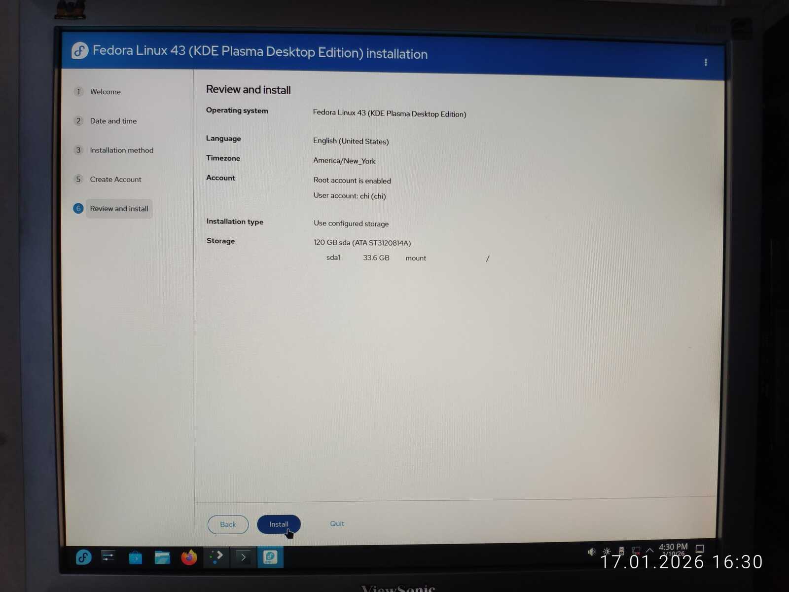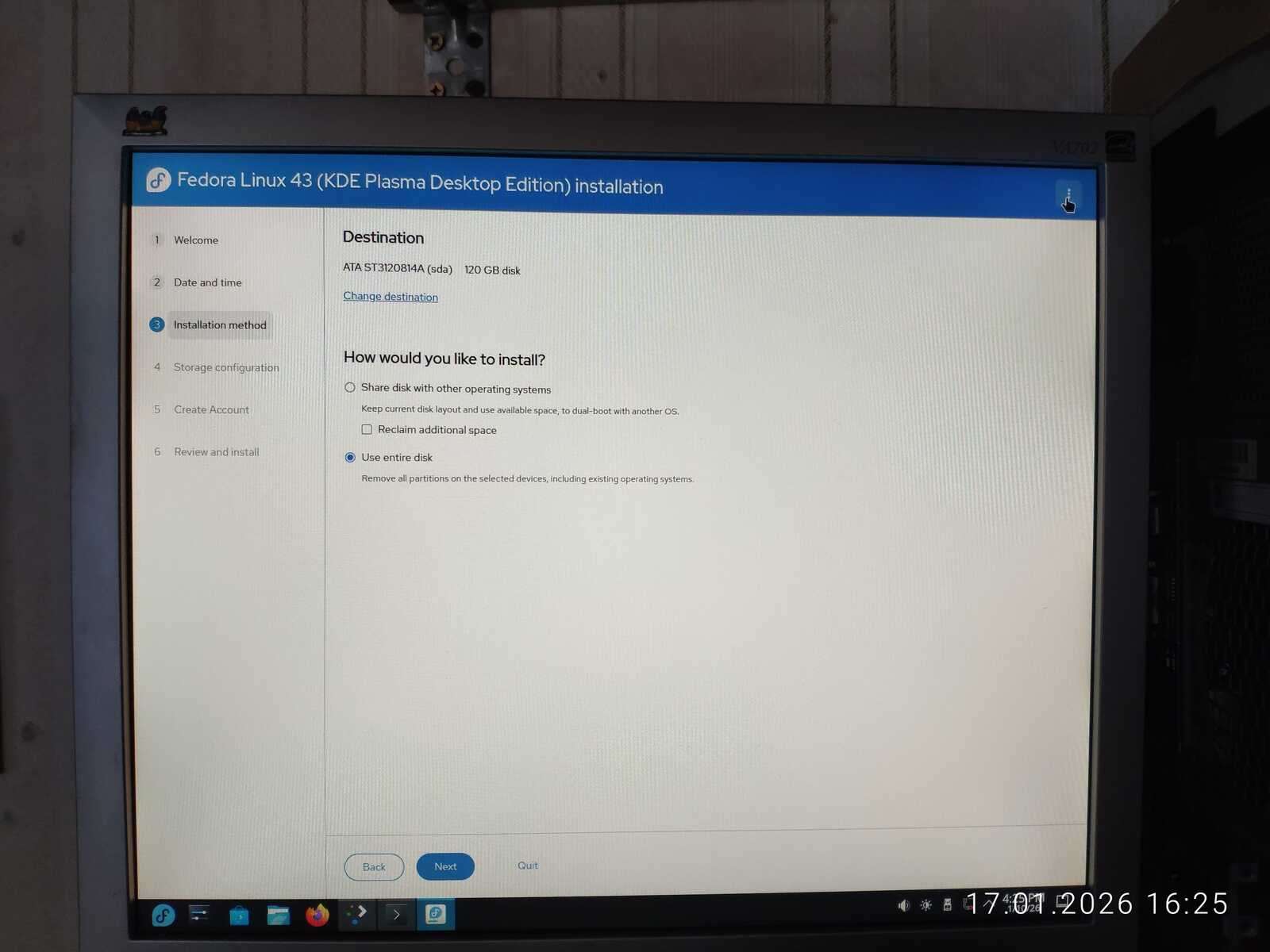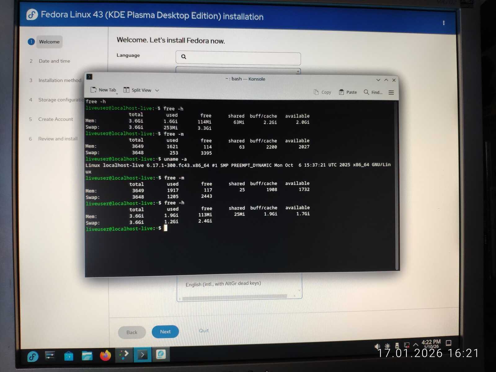 Ну а настройка учётной записи скверна. Установлено ограничение на минимальный размер пароля в 6 символов. Ущемление свободы пользователя на лицо. При этом, данная программа установки далеко не худшая среди всех, с которыми мне приходилось сталкиваться. Так я и установил Fedora 43 на компьютер. Перезагружать уже пришлось кнопкой, так как система по 30-40 секунд реагировала на каждое действие. Судя по всему, четырёх гигабайт оперативной памяти тоже оказалось недостаточно для работы Fedora.