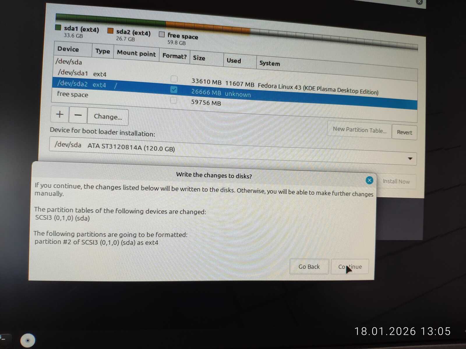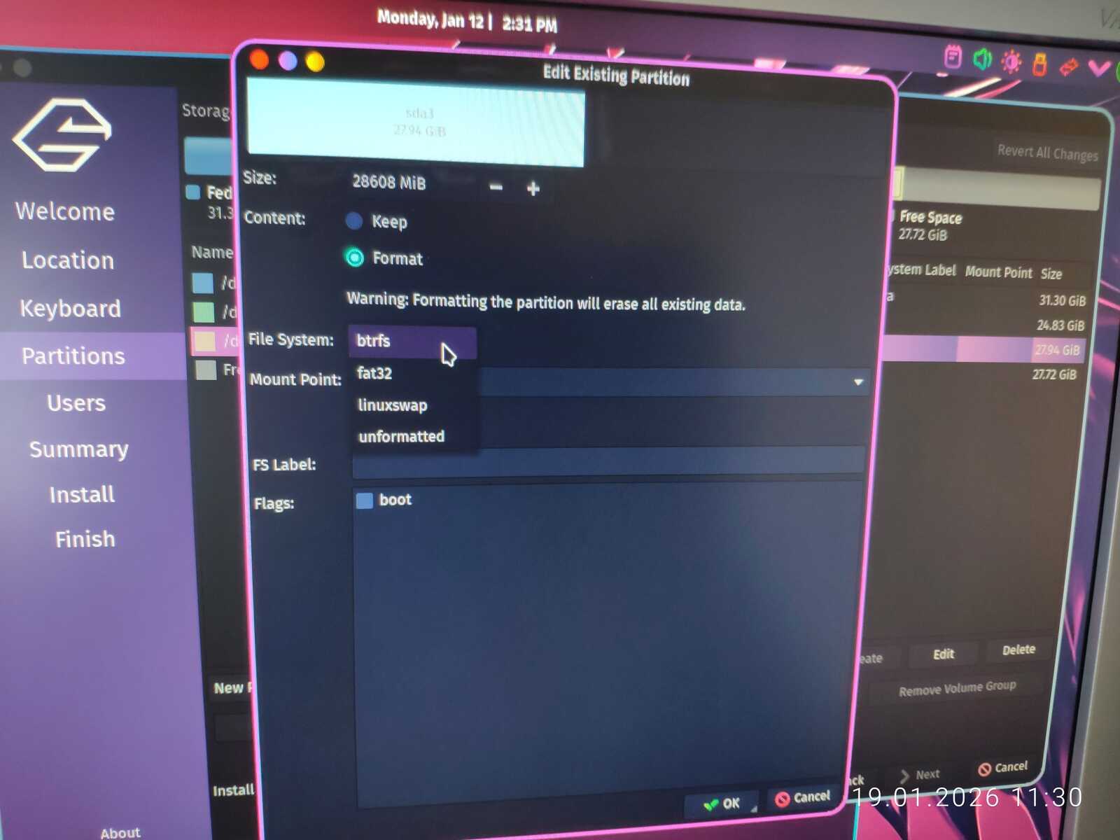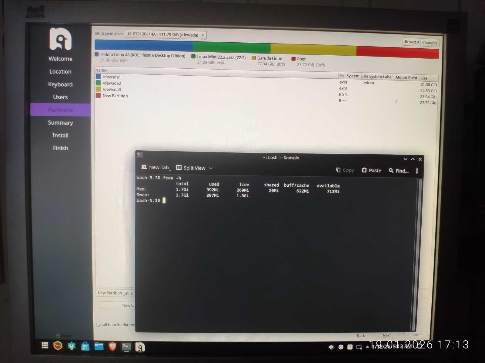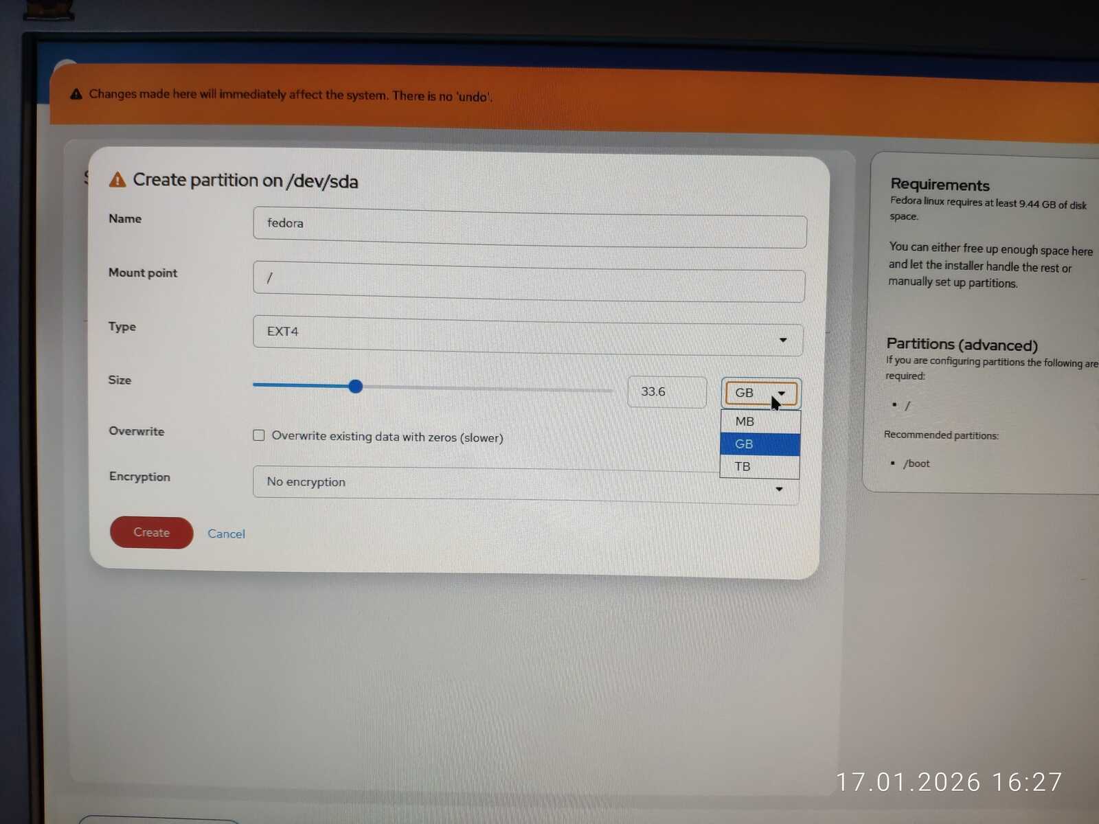 С горем пополам была произведена разметка. Ещё отмечу путаницу между единицами измерения MB/MiB. Чувствуется неправильный подход в стиле ужасного GNOME. Хотя используется тут гораздо более вменяемое KDE. Видимо, линуксоидные разработчики даже KDE умудрились испортить. Но в этом все Линуксы. Разумеется, дело проходило в жутких тормозах. У меня даже отвязанная от Интернета Windows 11 так сильно не тормозила на гораздо более слабом ноутбуке, как тормозит Fedora на тестовом компьютере.