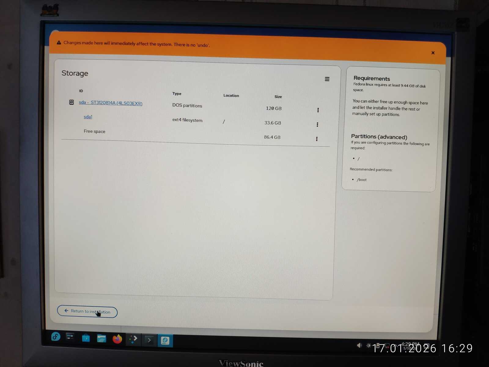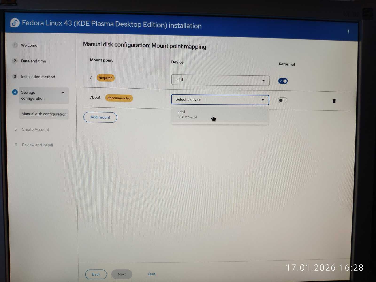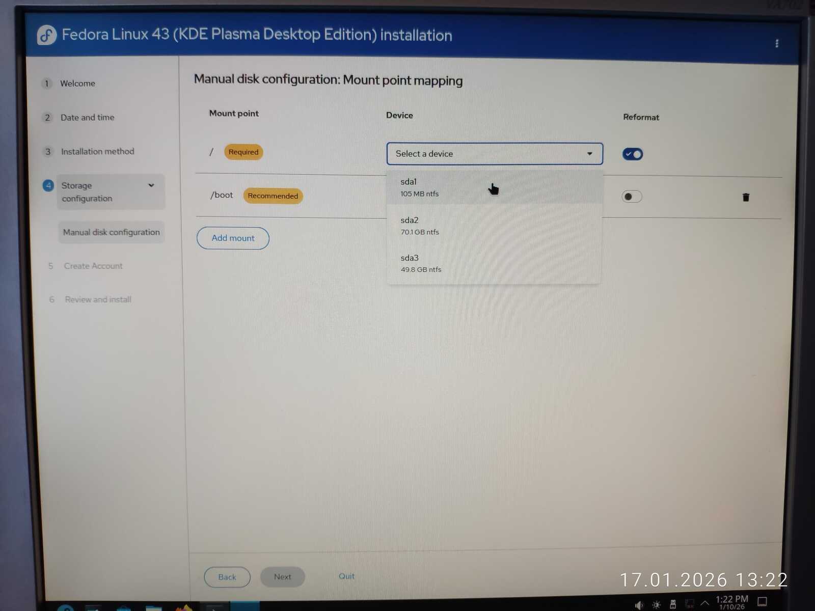 С горем пополам была произведена разметка. Ещё отмечу путаницу между единицами измерения MB/MiB. Чувствуется неправильный подход в стиле ужасного GNOME. Хотя используется тут гораздо более вменяемое KDE. Видимо, линуксоидные разработчики даже KDE умудрились испортить. Но в этом все Линуксы. Разумеется, дело проходило в жутких тормозах. У меня даже отвязанная от Интернета Windows 11 так сильно не тормозила на гораздо более слабом ноутбуке, как тормозит Fedora на тестовом компьютере.