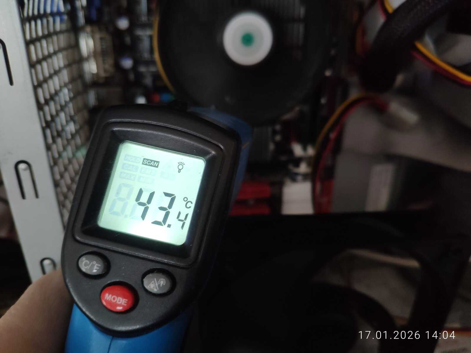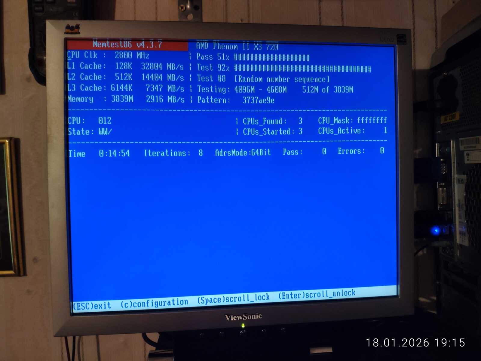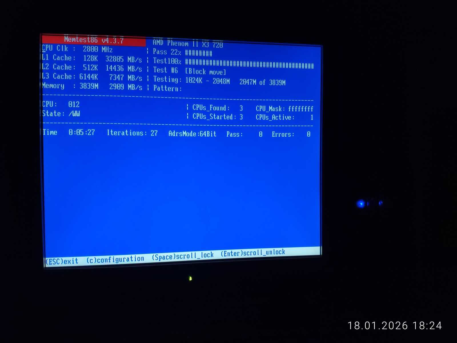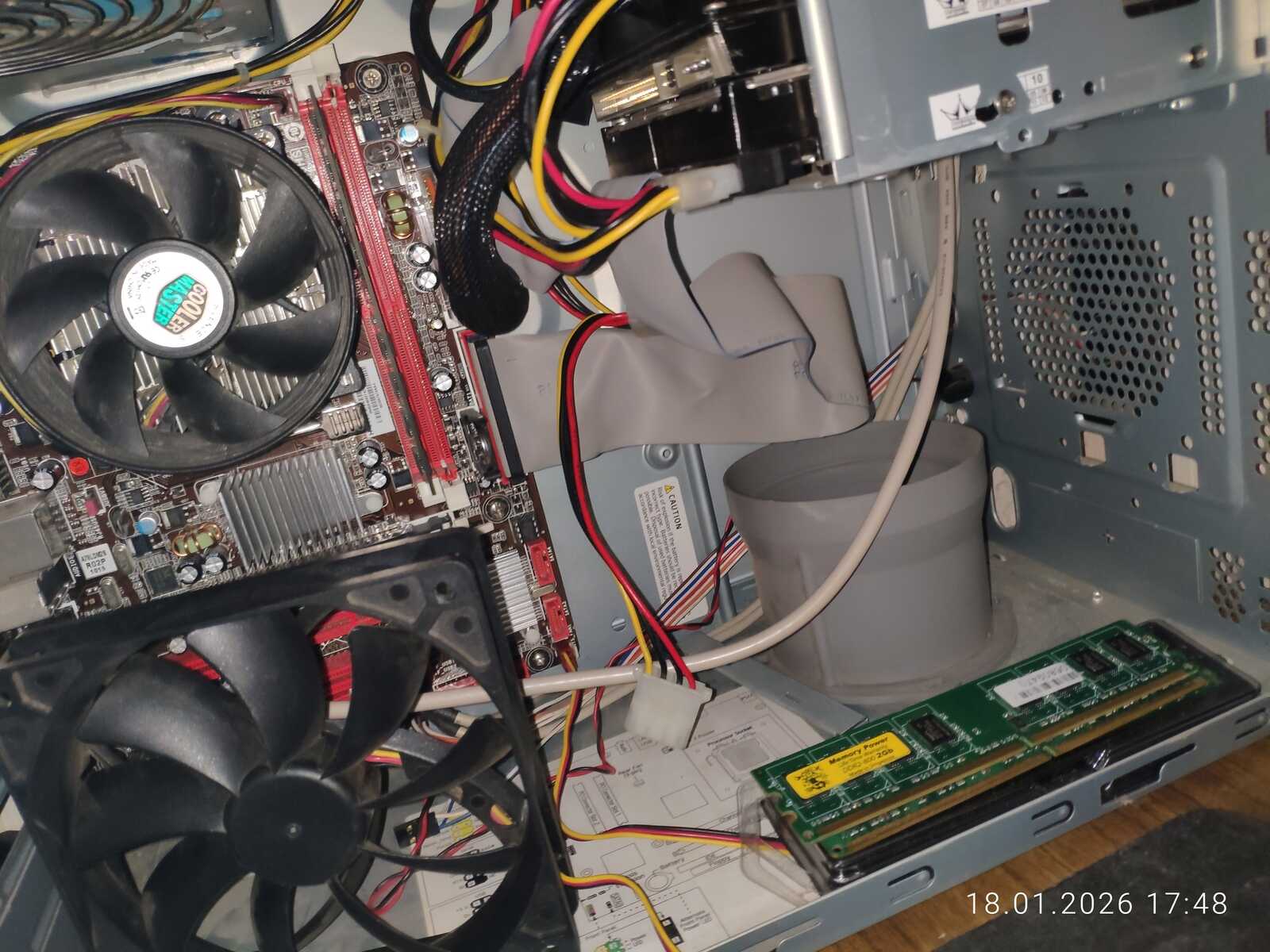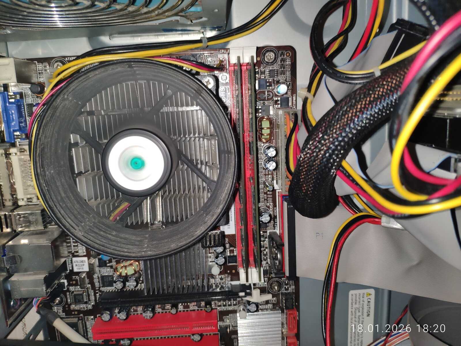 В итоге было обнаружено, что контролер памяти в процессоре AMD не справляется с двумя разными модулями оперативной памяти. На штатной для DDR2 частоте 800 МГц обнаружились ошибки при тестировании ОЗУ. Меня очень разочаровал дистрибутив Fedora тем фактом, что у него нет теста ОЗУ в загрузочном меню, и мне пришлось брать флешку с дистрибутивом Chimbalix для тестирования памяти. Хотя перегрева и не было, но на всякий случай ещё поставил вентилятор на обдув системной платы и проверил напряжения мультиметром. Всё в норме.