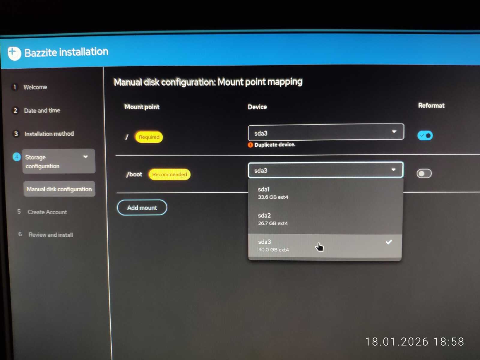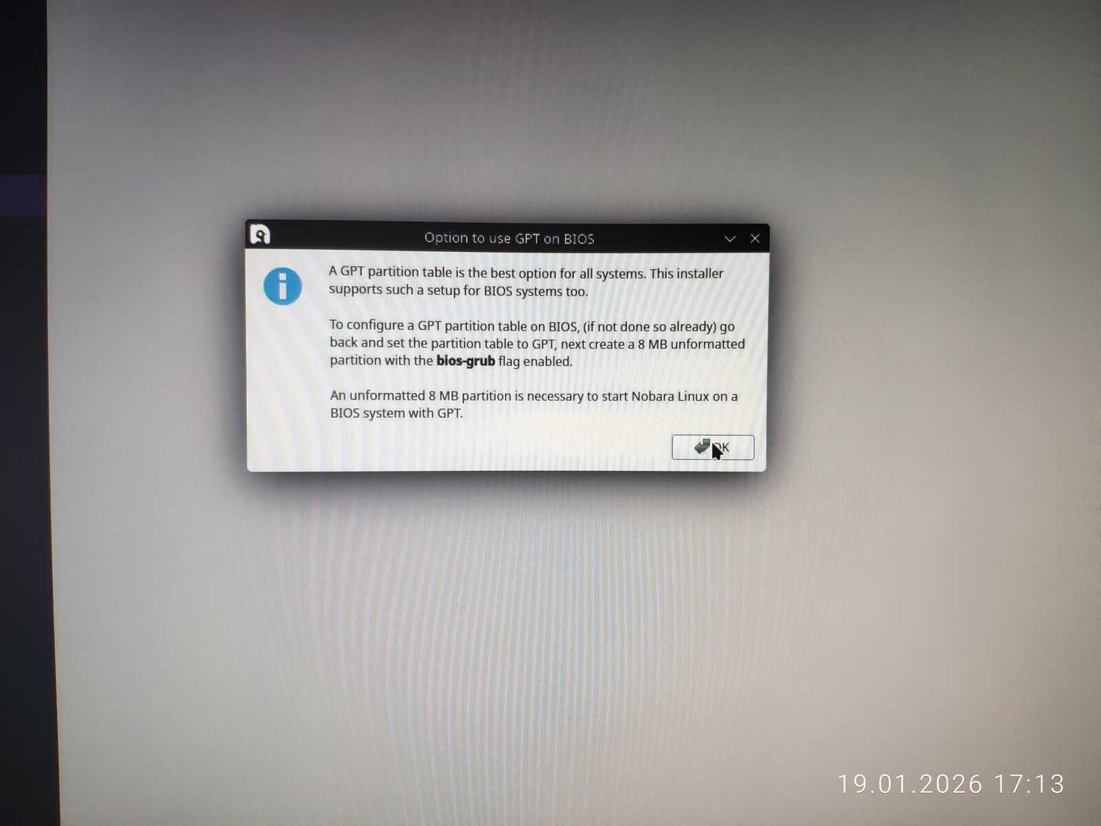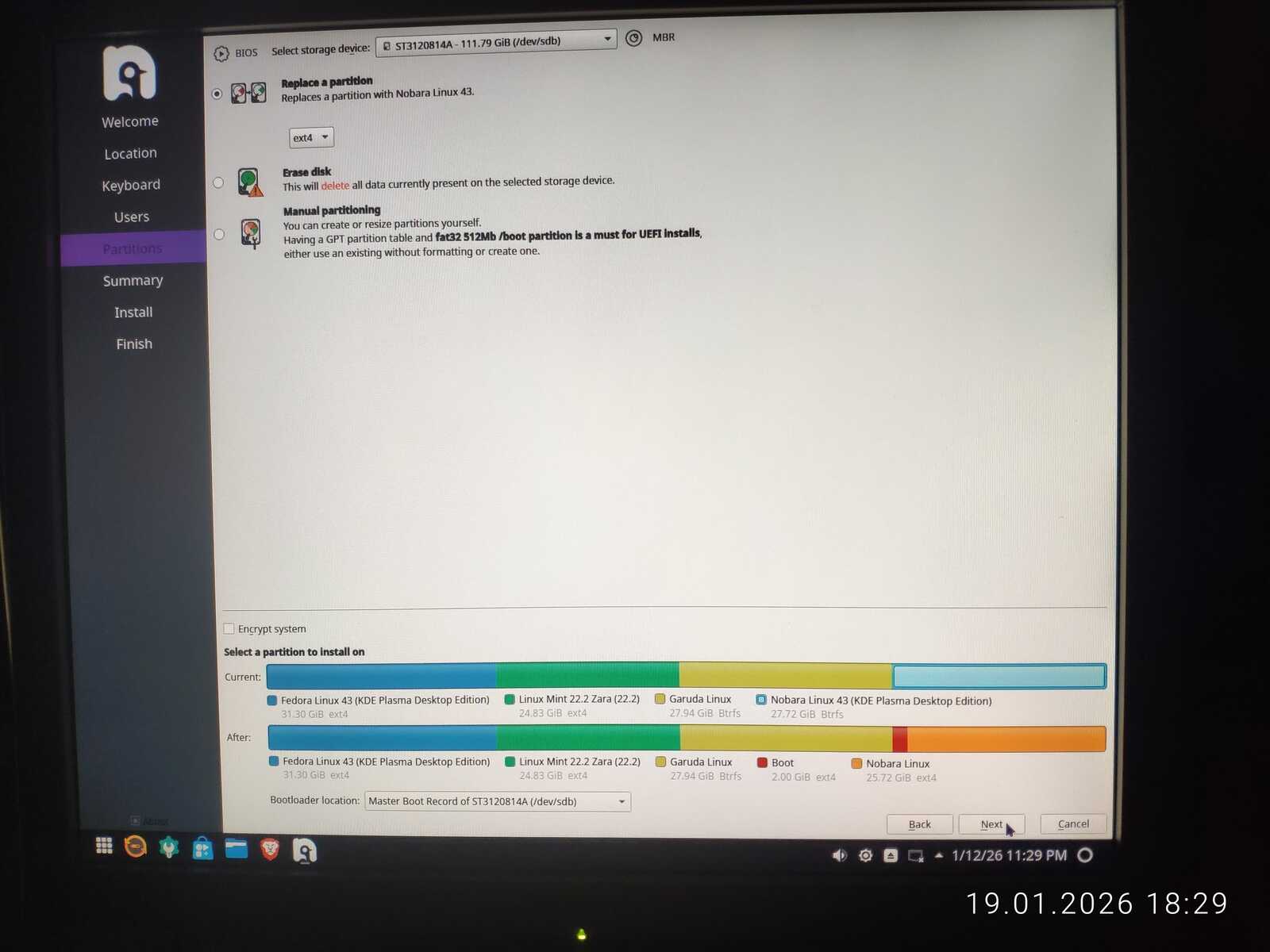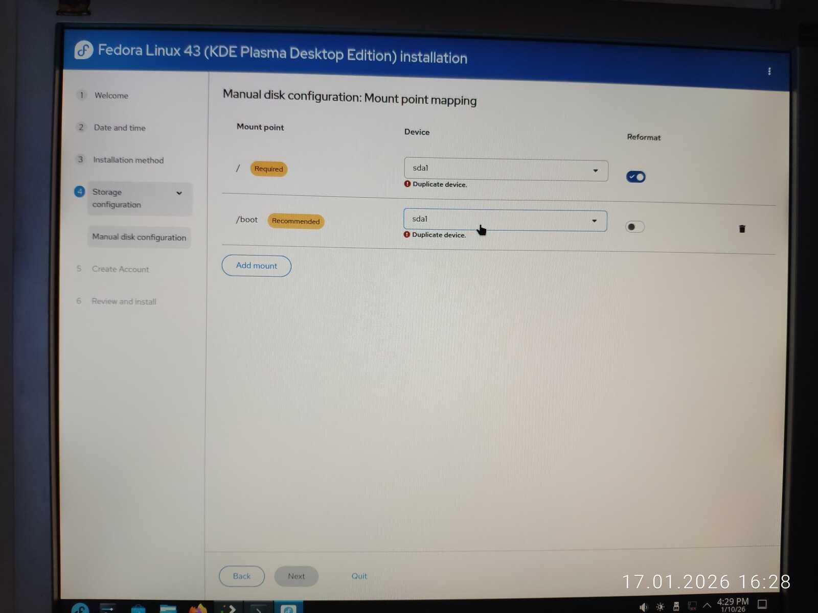 Снова запускаю Nobara и пытаюсь использовать автоматическую разметку диска. Однако программа выдала ошибку, ведь не может создать больше четырёх основных разделов. Хорошо, если бы такие ошибки выдавались до начала установки, а не в процессе.