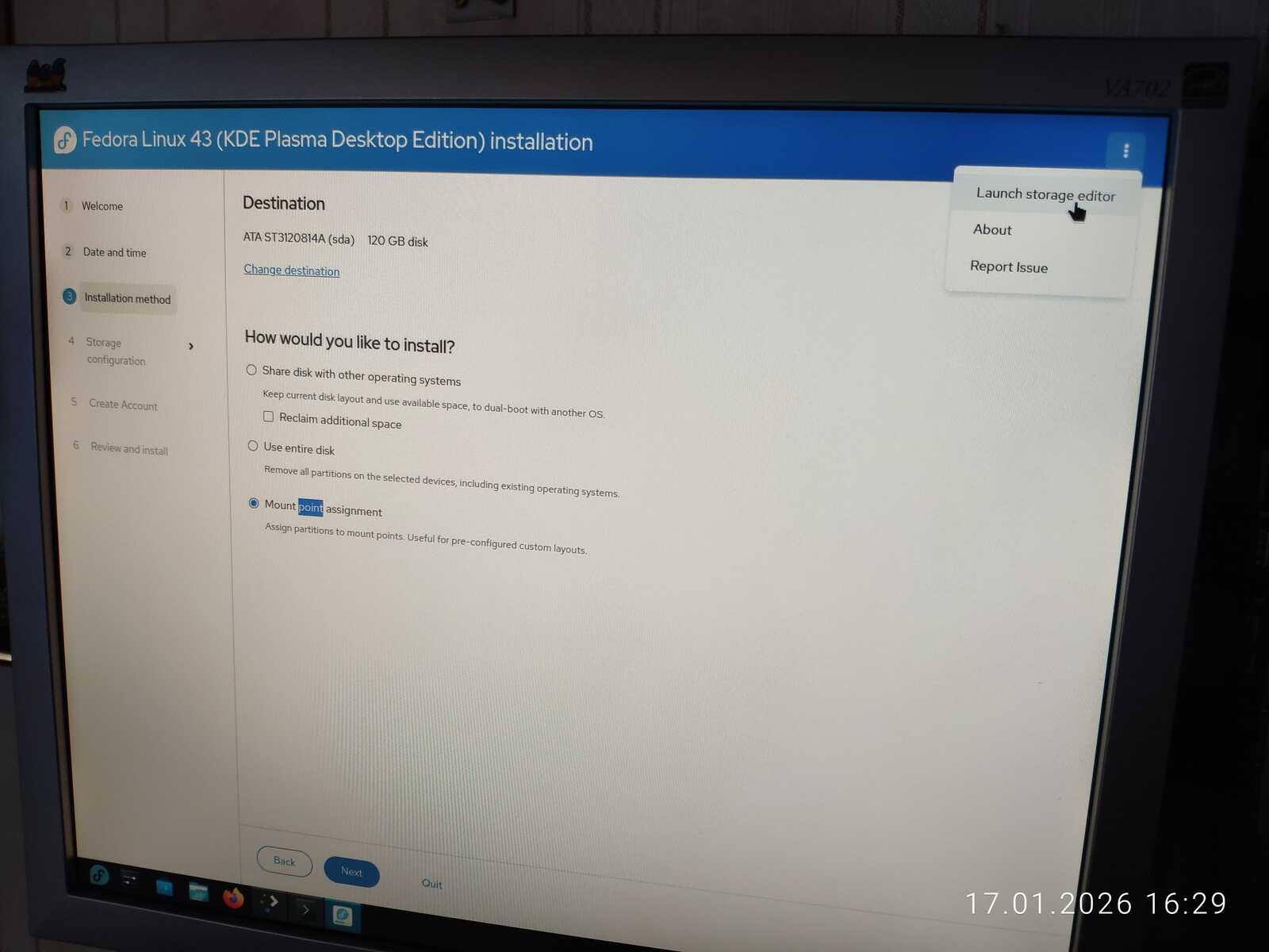 А вот к разметке дисков есть серьёзные претензии. Разработчиков этой программы установки нужно по рукам бить за такой отвратительный дизайн. Изначально я думал, что тут нельзя вручную размечать разделы дисков, но в правом верхнем углу экрана, чисто случайно, были обнаружены неприметные три точки, и как раз там находилась ручная разметка разделов. Если бы не случайность, я бы записал этому Линуксу серьёзный минус за отсутствие ручной разметки дисков.