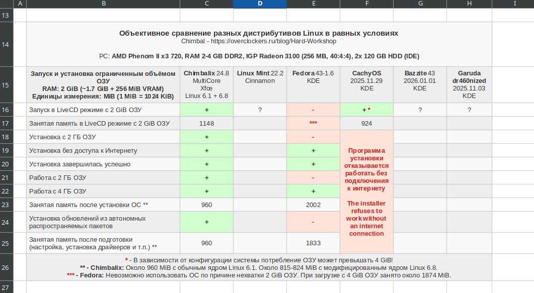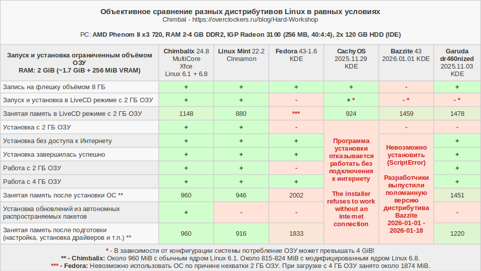 Так же добавлю примечания некоторым дистрибутивам, что они могут использовать более 4 ГБ оперативной памяти в зависимости от конфигурации системы в LiveCD режиме. Наличие такого примечания говорит о том, что данная ОС может не запуститься по причине нехватки памяти в зависимости от конфигурации ПК. На такой нюанс у меня уже проверен дистрибутив CachyOS, так что и прочие Линуксы проверю в ходе экспериментов. А проверка будет очень проста. Я просто запущу ОС на своём основном ноутбуке с видеокартой RTX 3060 и 64 ГБ ОЗУ. Если потребление памяти в LiveCD окажется значительно большим, чем при запуске на тестовом ПК, то смело ставим красную метку такому Линуксу.