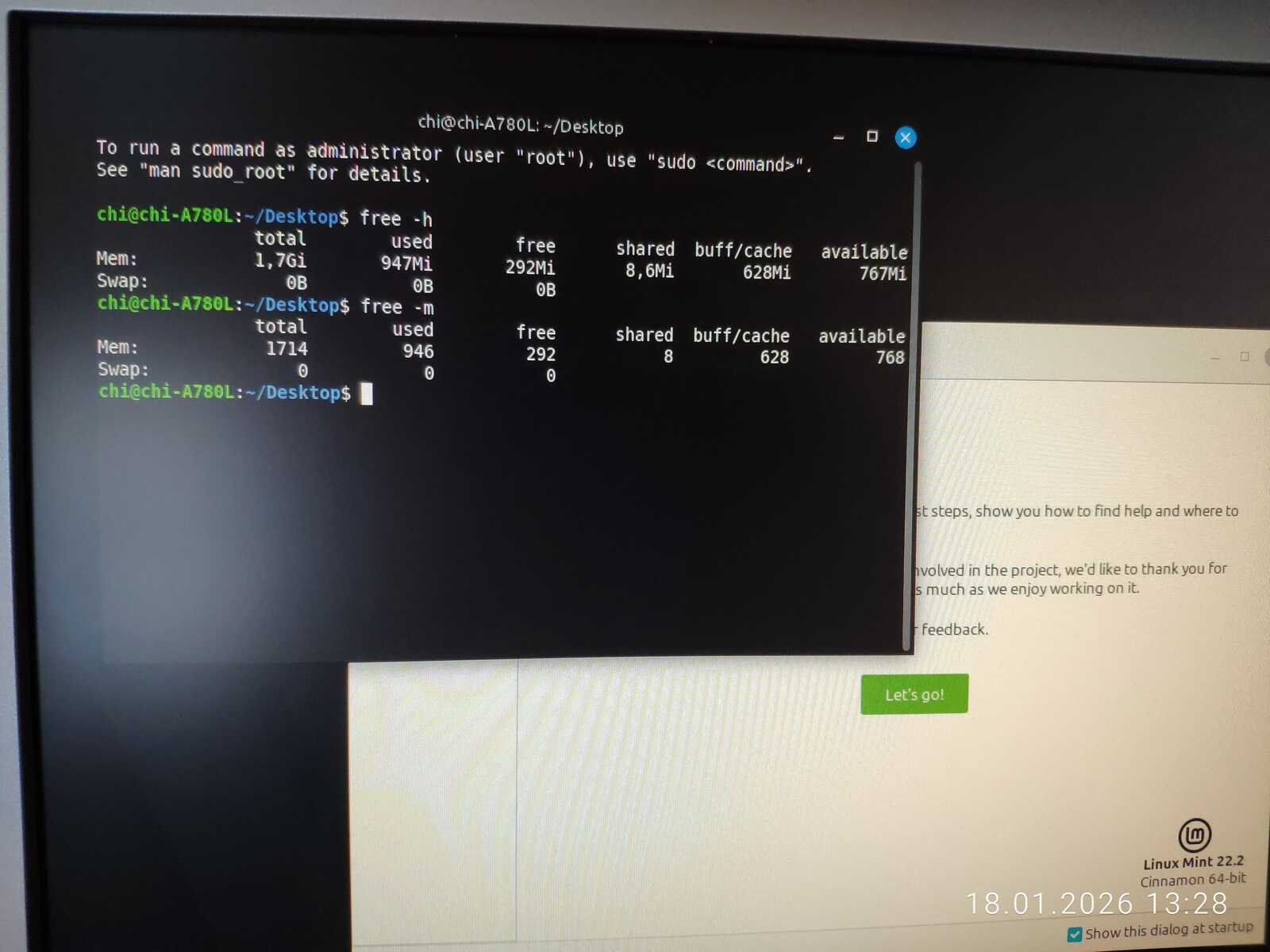 Извлекаем лишнюю память из компьютера и запускаем Linux Mint. Хотя на современном ноутбуке этот Линукс потреблял в 2 раза больше ОЗУ, чем на тестовом старом ПК. Но мы не будем ставить красную метку. Всё же в абсолютной величине потребление не было большим.