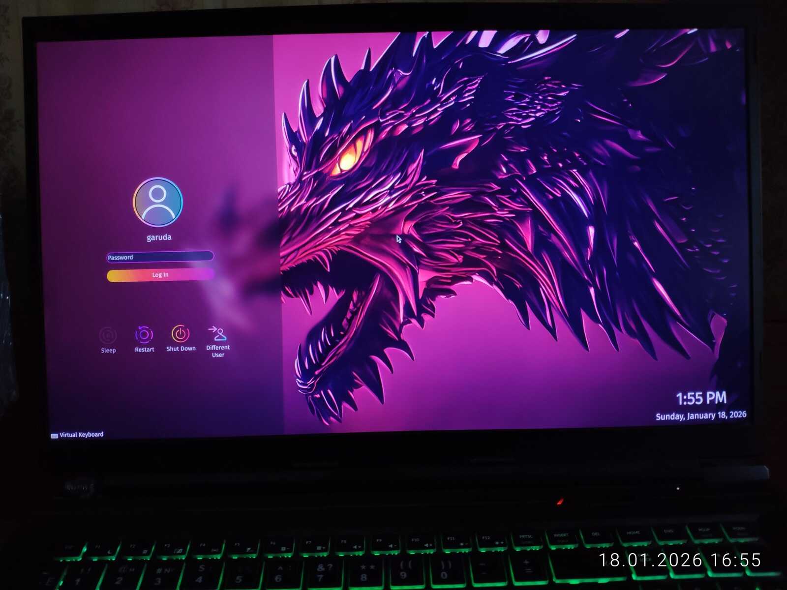 А следующий Линукс у нас — Garuda. Запускался он весьма долго на современном ноутбуке. Отличительным ужасом данного Линукса является установленный пароль на авторизацию в LiveCD. Только глупец мог сделать такой барьер против новых пользователей.