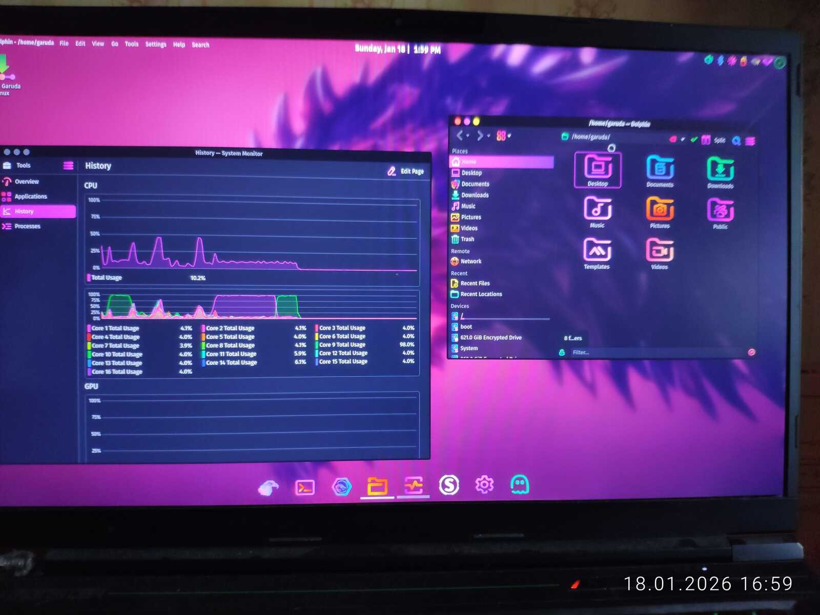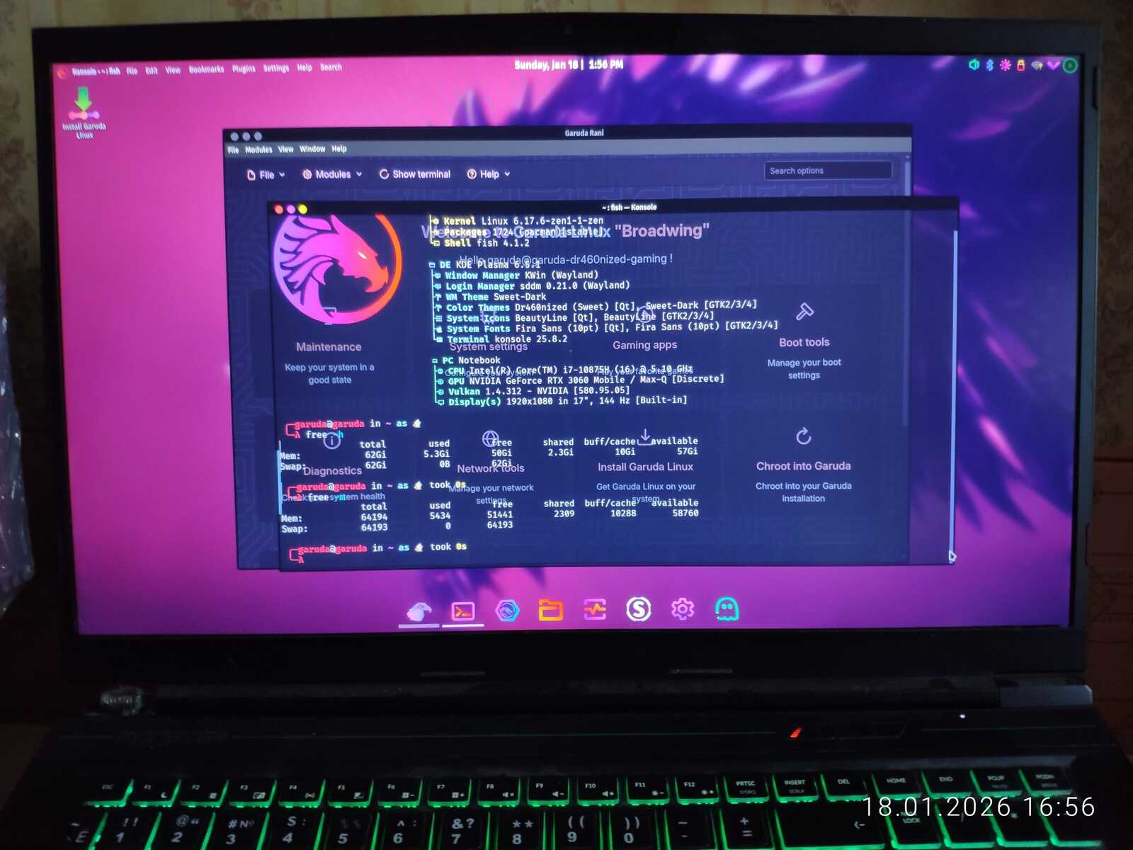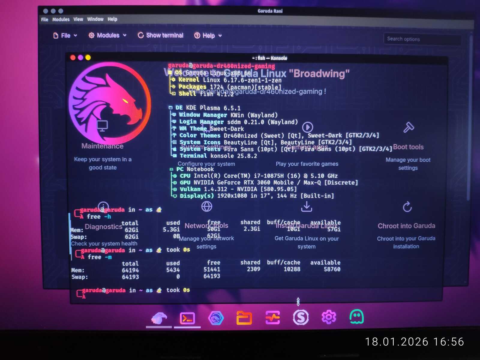 И тут Garuda Linux сразу же проявляет себя худшим образом из возможных. Он не только сожрал пять с лишним гигабайт оперативной памяти, но и безбожно глючит на ноутбуке с 8 ядерным 16 поточным i7-10875H с 64 гигабайтами ОЗУ и RTX 3060. Это ли не позор для игрового Линукса?