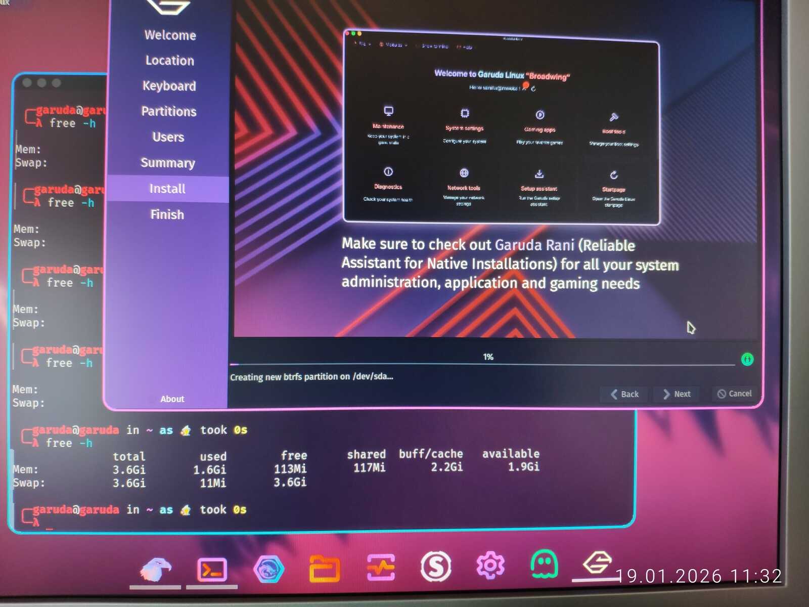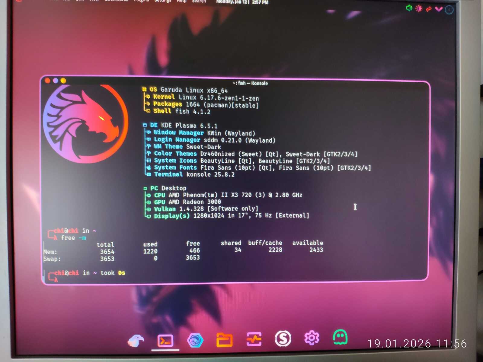 Я решил запустить сразу с четырьмя гигабайтами ОЗУ этот игровой Линукс. И не зря, ведь на голом рабочем столе уже занято 1,4 гигабайта оперативной памяти. А ещё Garuda сильно тормозит даже с видеокартой AMD Radeon. Буквально слайд шоу при перетаскивании окна терминала. Точно так же этот дистрибутив тормозил и на современном ноутбуке с видеокартой NVIDIA. Оптимизация у линуксоидов, как всегда, отвратительная.