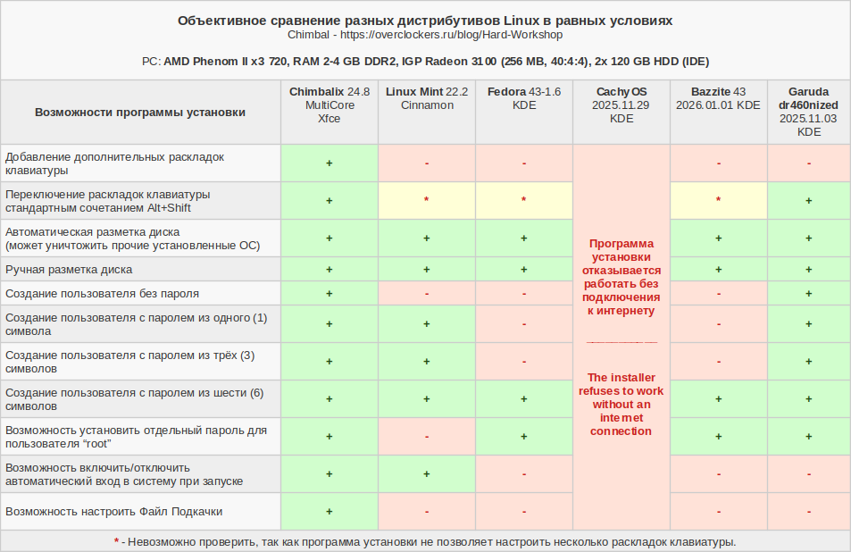 Пришло время сравнить полученные результаты с разными Линуксами. В общем плане лучше всего показали себя Chimbalix и Mint. Дистрибутив Fedora оказался слишком тяжёлым и прожорливым. CachyOS невозможно установить, так как программа установки отказывается работать без доступа к интернету. Bazzite невозможно установить по вине разработчиков дистрибутива, выпустивших поломанную версию дистрибутива. Ну а игровая Garuda тоже оказалась очень прожорливой.